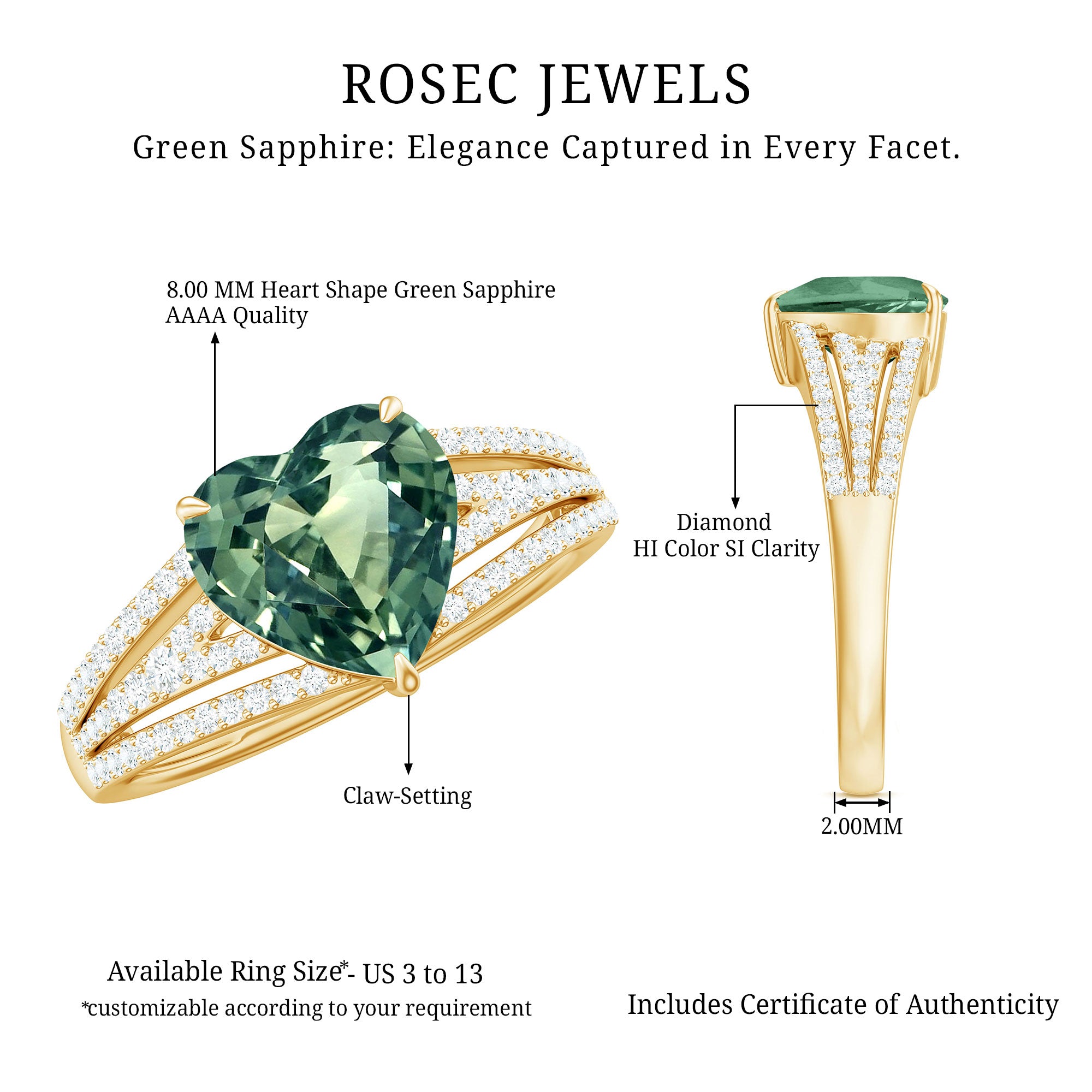 The Engagement Ring showcases a Heart Shape Green Sapphire secured in Claw Setting while Round Shape Diamonds studded on the split shank. The Heart Ring exhibits an enticing design to complement your attires beautifully. Express your love without saying much by giving her this irresistible Created Sapphire Ring to make her feel out of the world.