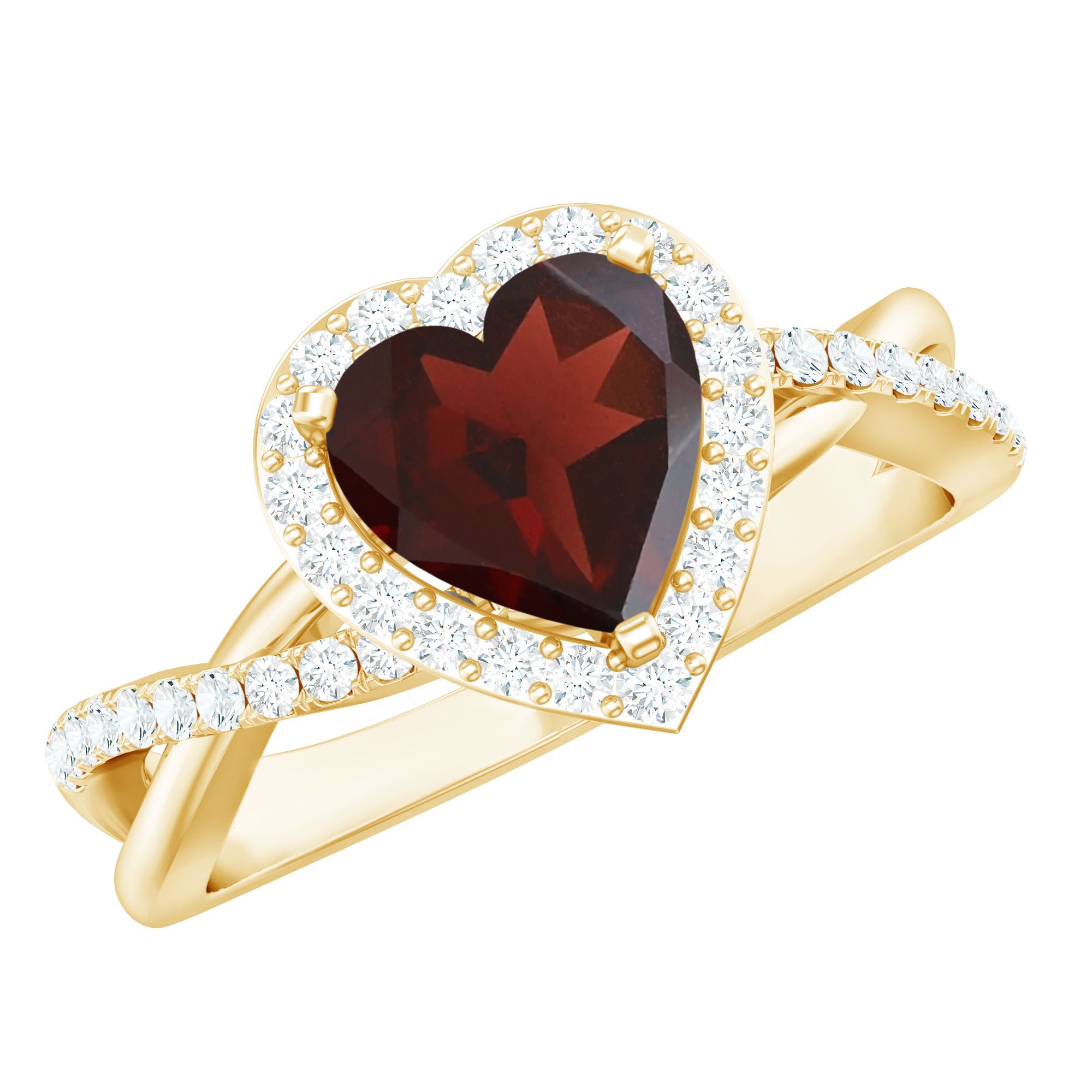 Discover your soul in the form of perfect Heart Engagement Ring. The Garnet Engagement Ring has intricate design of crossover gold shank, embellished with Round Diamond, creating a romantic look that has timeless beauty. This Heart Shape Garnet Ring is crafted in gold for a sumptuous appeal.
