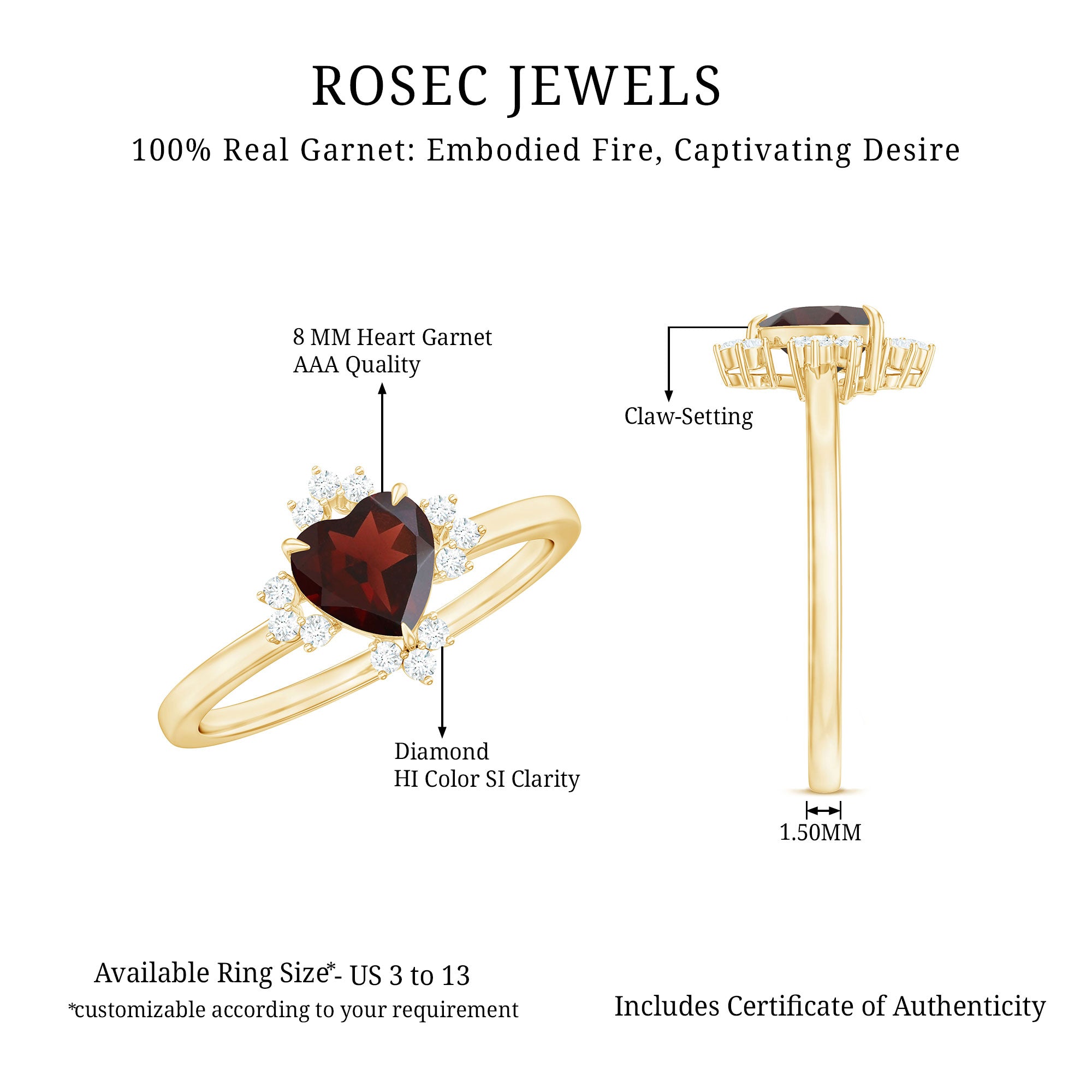 This exquisite heart shape engagement ring is the perfect way to show your love. The vibrant red garnet stone is cut into a romantic heart shape, symbolizing the love and commitment that you share with your partner. The stone is accented with shimmering Diamond stones, adding extra sparkle and brilliance to the piece. Timeless and romantic, this ring is a perfect choice for those who appreciate the finer things in life and want to express their love in a truly special way.