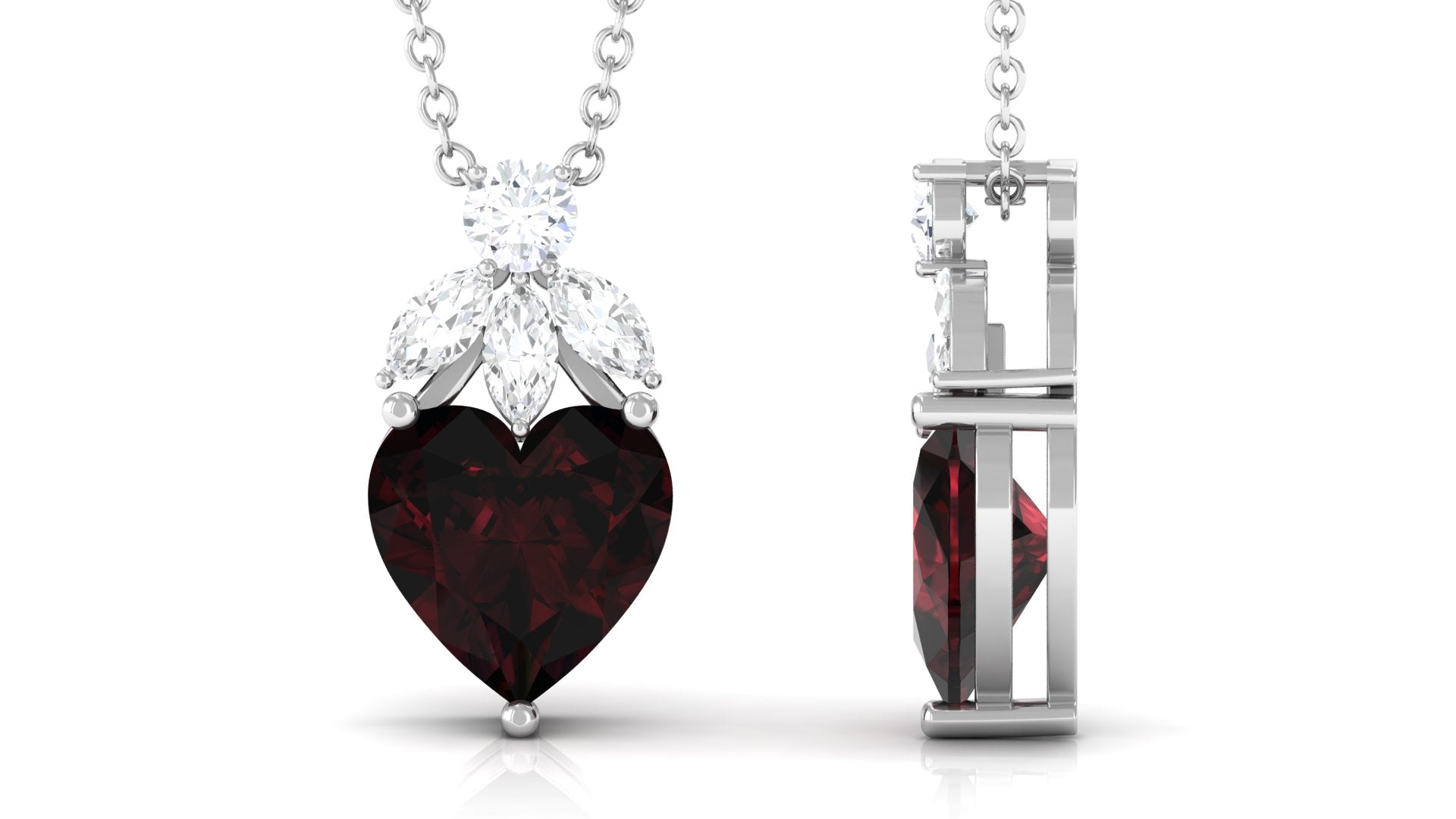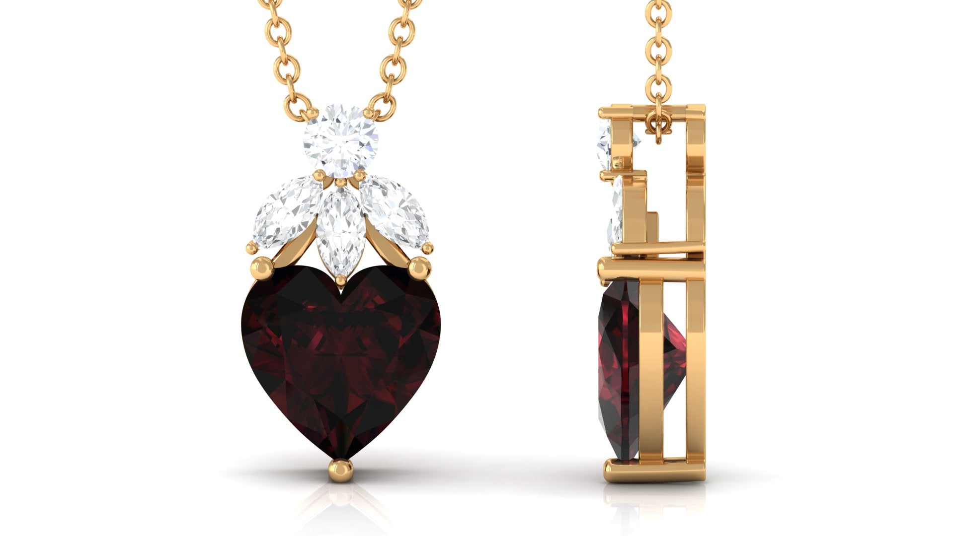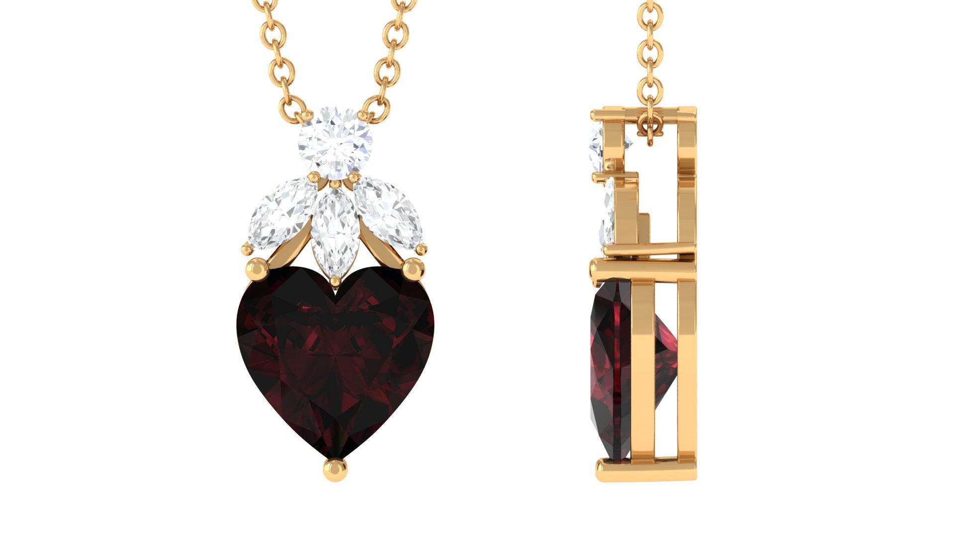 Adorn yourself with elegance and romance with this Solitaire Pendant. The captivating Heart Shape Garnet takes center stage, while marquise and round Diamond stones are on top, enhancing its beauty. A timeless piece that exudes love and sophistication, perfect for adding a touch of charm to any outfit.