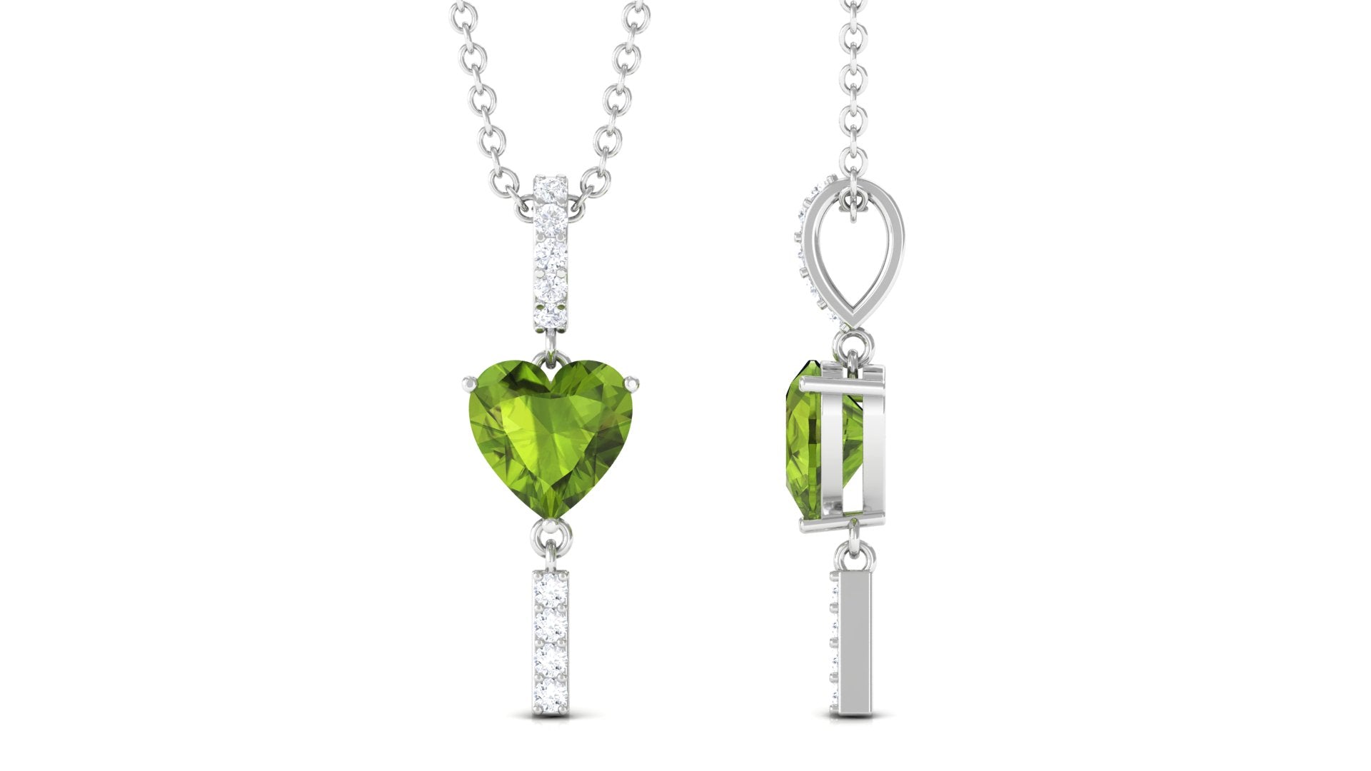 Amp up any look with this fascinatingly beautiful heart pendant necklace that showcases a 3-prong set heart shaped peridot accompanied with Diamond embedded strips. The peridot mesmerizes with its olive-green hue, while the Diamond adds a little bit extra glamor to the alluring drop design. Linked to a glimmering bale for an easy fit.