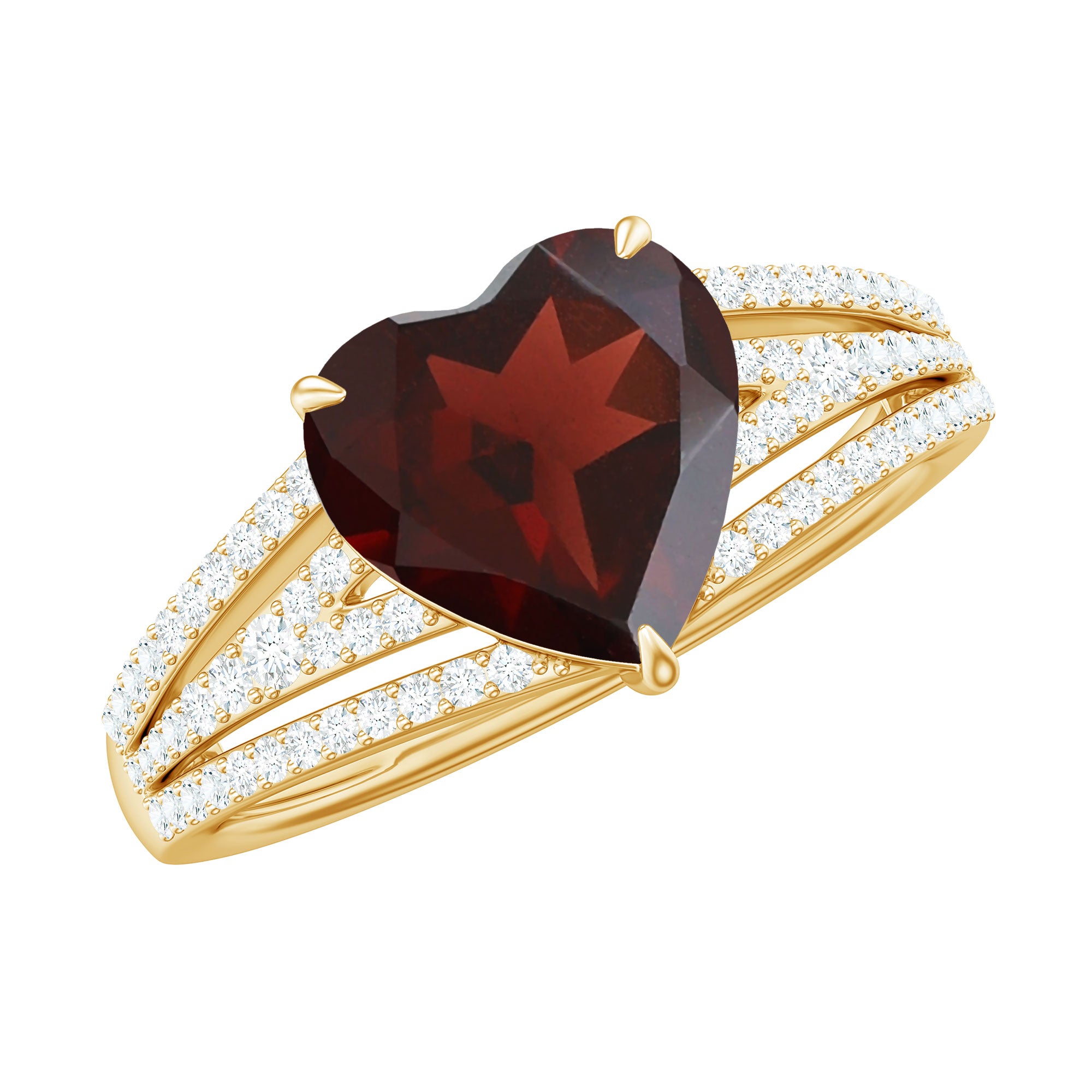A charming Heart Engagement Ring, crafted with exquisite solid gold, adds a special touch. The ring features a beautiful Heart Shape Garnet solitaire set in a claw prong setting, and is accented with tiny round Diamond on a split shank.