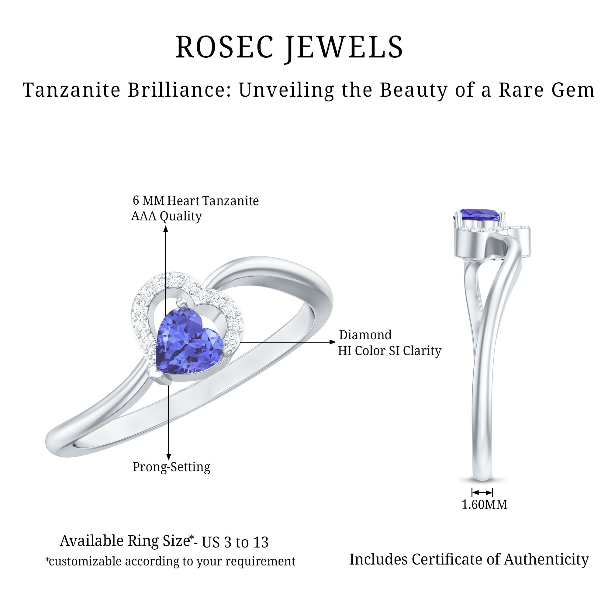 This stunning promise ring features a tilted heart shape tanzanite gemstone at its center, accented by sparkling Diamond stones along the twisted band. The combination of the deep blue tanzanite and the brilliant Diamond creates a striking contrast, making this ring an eye-catching addition to any jewelry collection. Perfect for a promise ring or as a special gift for a loved one, this ring is both elegant and meaningful.