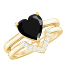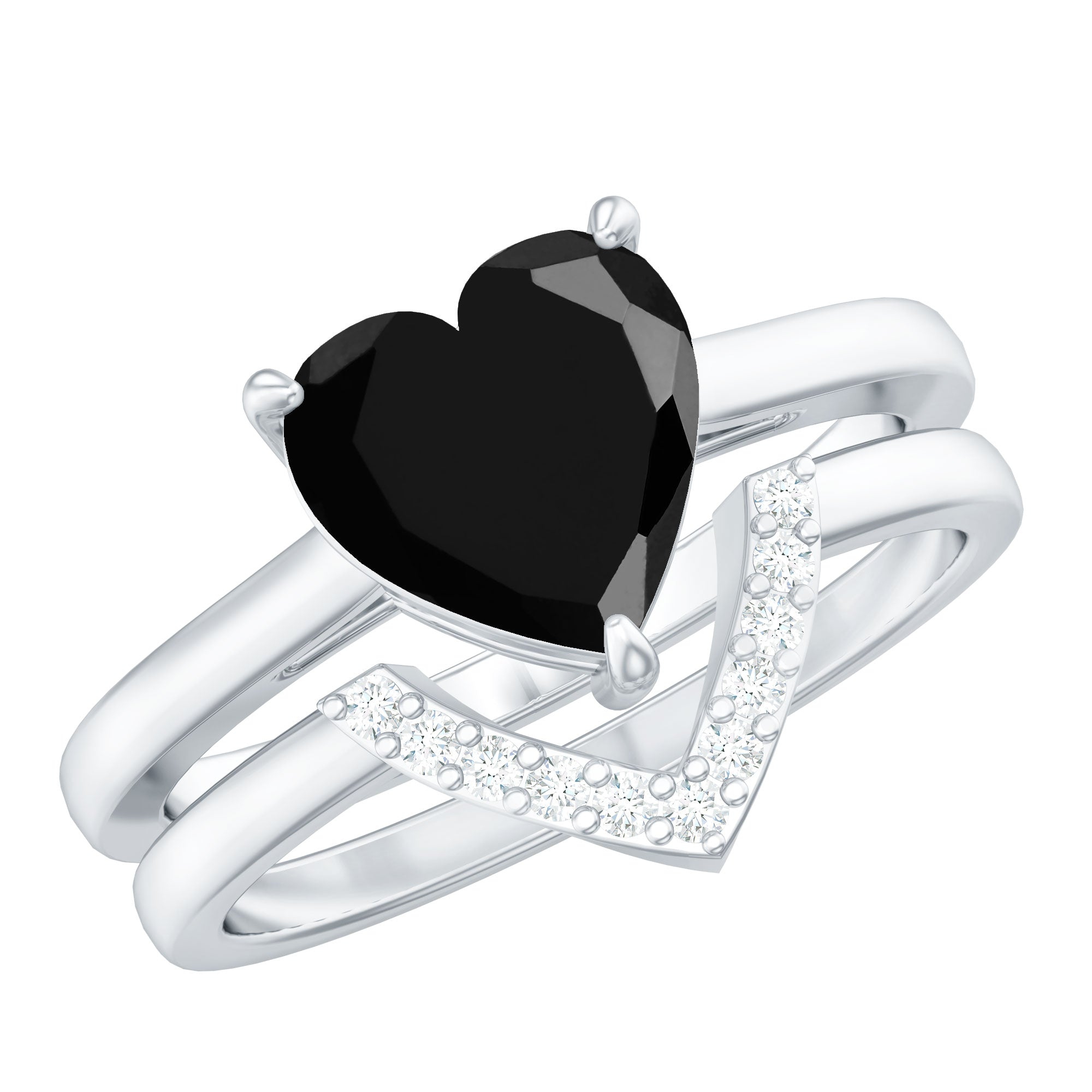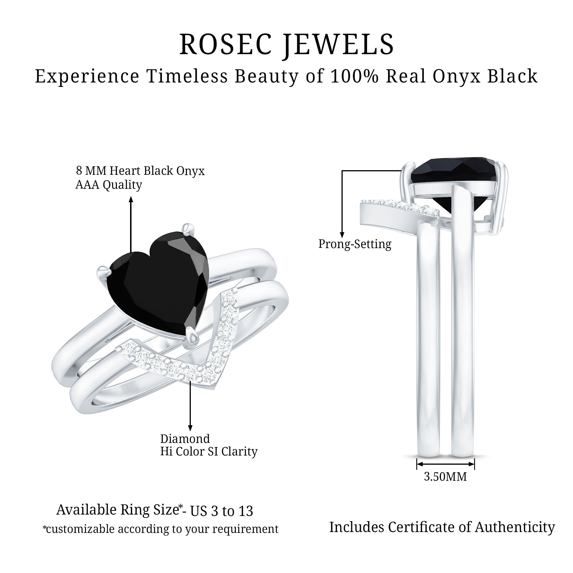 Start your forever with this Heart Wedding Ring Set that reflects the depth of your connection and the beauty of your journey together. This Black Onyx Engagement Ring Set is designed to capture the emotion behind every promise, creating a timeless symbol of love and trust. The centerpiece of the engagement ring is an 8 MM heart shaped Black Onyx, held securely in claw setting. Complementing the engagement ring is a graceful V-shaped enhancer band, crafted to fit seamlessly around the center stone. This matching band is lined with sparkling round cut diamonds, creating a beautiful frame that adds brilliance and charm to the entire set. The curved design draws the eye and highlights the heart shaped onyx, making this Solitaire Bridal Ring Set a striking piece from every angle. To honor a special moment, this Black Onyx Wedding Ring Set is a thoughtful and stylish choice. With its elegant design and symbolic details, it wraps gently around the finger, offering both comfort and beauty. A perfect choice for the bride-to-be who values timeless romance with a unique twist, this Onyx and Diamond Ring Set tells a story of love, loyalty, and the bright future that lies ahead.