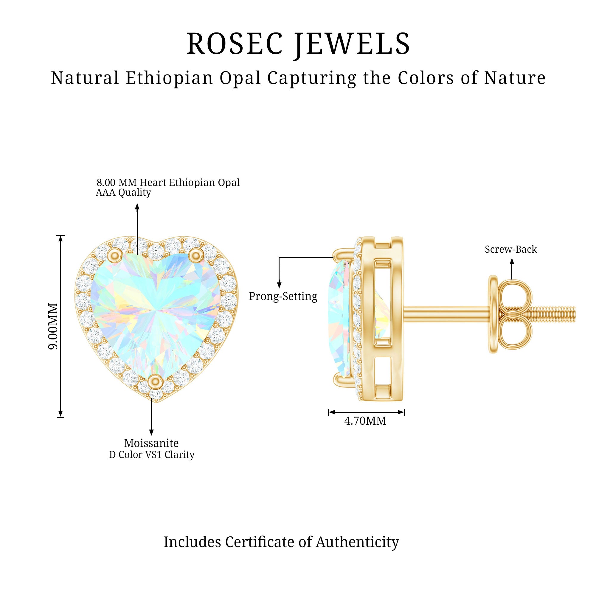 These stunning stud earrings feature a heart-shaped Ethiopian opal as the centerpiece, surrounded by a halo of sparkling moissanite gems. The combination of the vibrant opal and glittering moissanite creates a mesmerizing effect. The heart-shaped design adds a touch of romance, making these earrings perfect for special occasions or everyday wear. They are crafted with high-quality materials, ensuring durability and longevity. The earrings are designed to be comfortable and easy to wear, making them a great choice for those who love to make a statement with their jewelry. These versatile stud earrings will complement any outfit, making them a must-have addition to your jewelry collection.