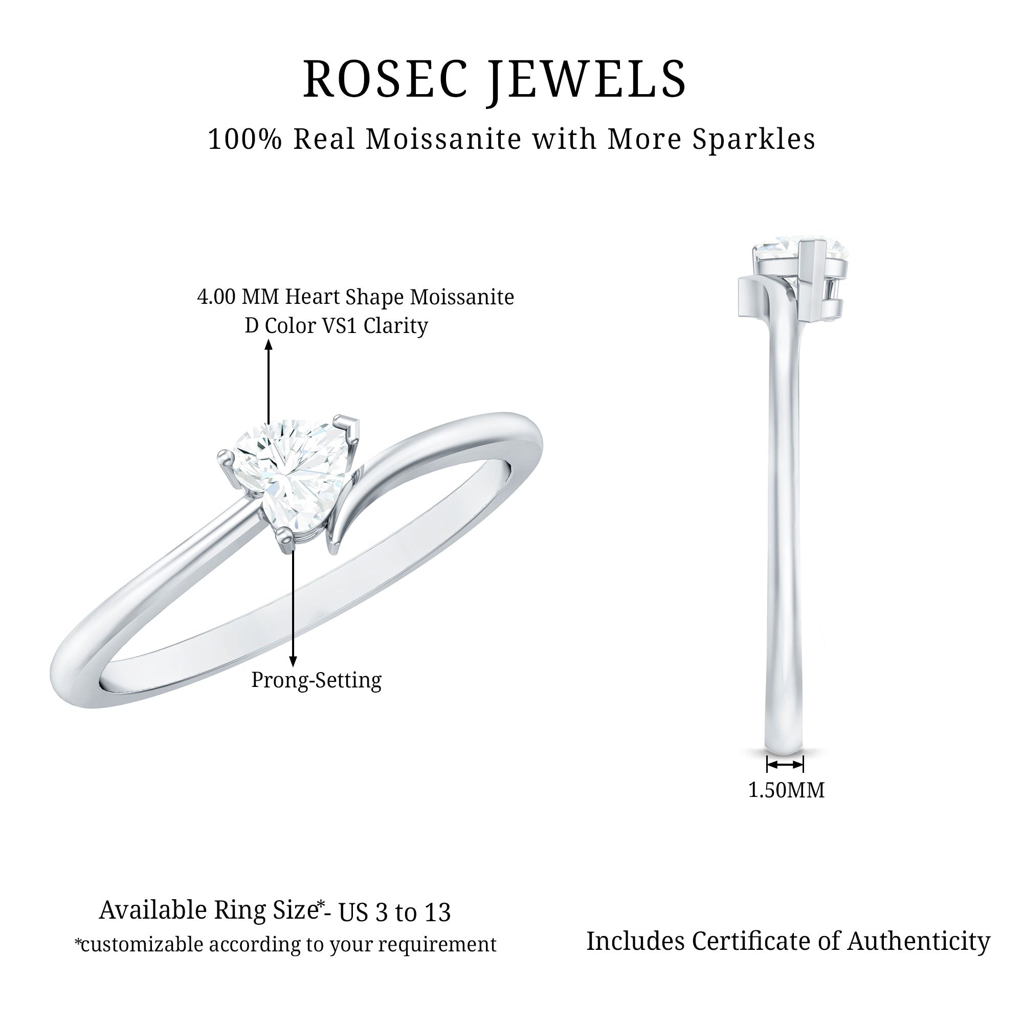 Celebrate Love with a Heartfelt Sparkle – the perfect Solitaire Promise Ring for Valentine’s Day. This 4X4 MM D-VS1 Quality Heart shape Moissanite Solitaire Ring is the embodiment of refined emotion and delicate elegance, designed as a solitaire promise ring to mark moments of eternal affection. Expertly secured in a precise prong setting, the moissanite sits proudly at the center, offering a brilliance that rivals traditional diamonds, while symbolizing sincerity and clarity in love. Its elegant silhouette and dainty promise ring aesthetic make it an ideal choice for meaningful occasions, especially as a romantic gesture on Valentine’s Day. A true masterpiece among women’s moissanite rings, this piece balances modern minimalism with timeless grace, making it a cherished addition to her jewelry collection. Whether youre searching for a moissanite engagement ring, a heart promise ring, or a lasting token of affection, this ring promises a story of love, commitment, and the shimmering beginning of forever. All of our jewelry item arrives in high-end signature jewelry boxes, ensuring they are ready for proposals/gifting purposes so that you do not have to spend any time packing them. To assist you in avoiding unnecessary hassle, we provide our ring sizing kit to you.