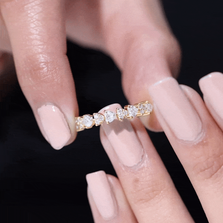 Let your love shine in every heartbeat with this enchanting Heart Eternity Ring. Thoughtfully designed to elevate your everyday look, this exquisite band features dazzling 3 MM heart shaped moissanite stones meticulously prong set along the band, alternating with brilliant round cut moissanites nestled within delicate heart shaped frames, adding a romantic and graceful rhythm to the design. Crafted with meticulous detail, this Moissanite Half Eternity Ring beautifully embodies everlasting devotion. The delicate design balances sparkle and sentiment, making it a meaningful piece that effortlessly transitions from daily wear to special occasions. Whether worn solo or stacked with other bands, it offers a romantic statement with a touch of modern elegance. Each stone radiates exceptional fire and brilliance, showcasing the beauty of D-VS1 quality moissanites. The intricate blend of heart and round shapes adds dimension and uniqueness to the band, turning a classic concept into a fresh and graceful expression of love. Perfect as an anniversary ring, wedding band, or a heartfelt gift, this Moissanite Anniversary Band is a poetic reminder of a bond that knows no end. Let this Heart Shaped Wedding Band be your everyday sparkle, whispering timeless romance in every glance.