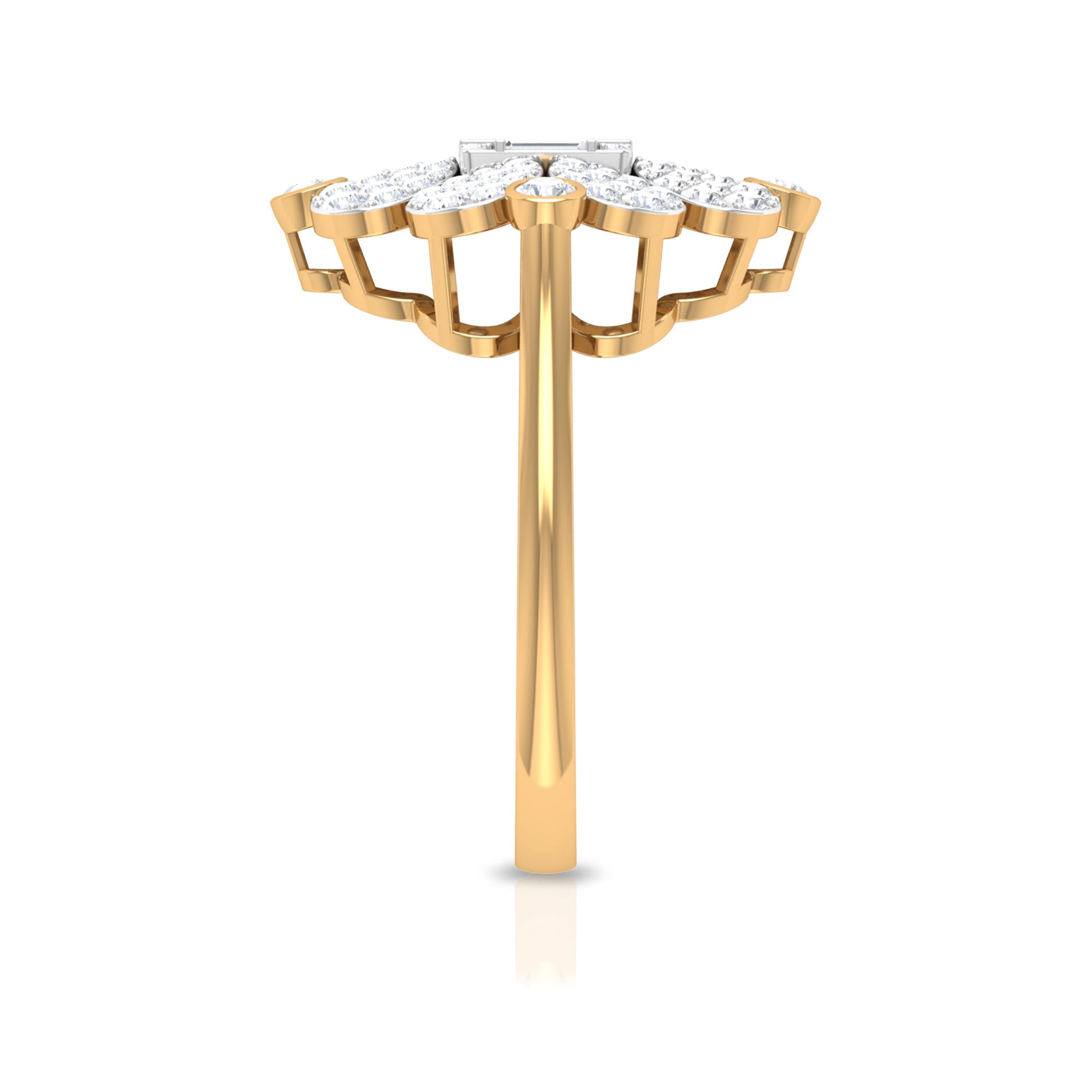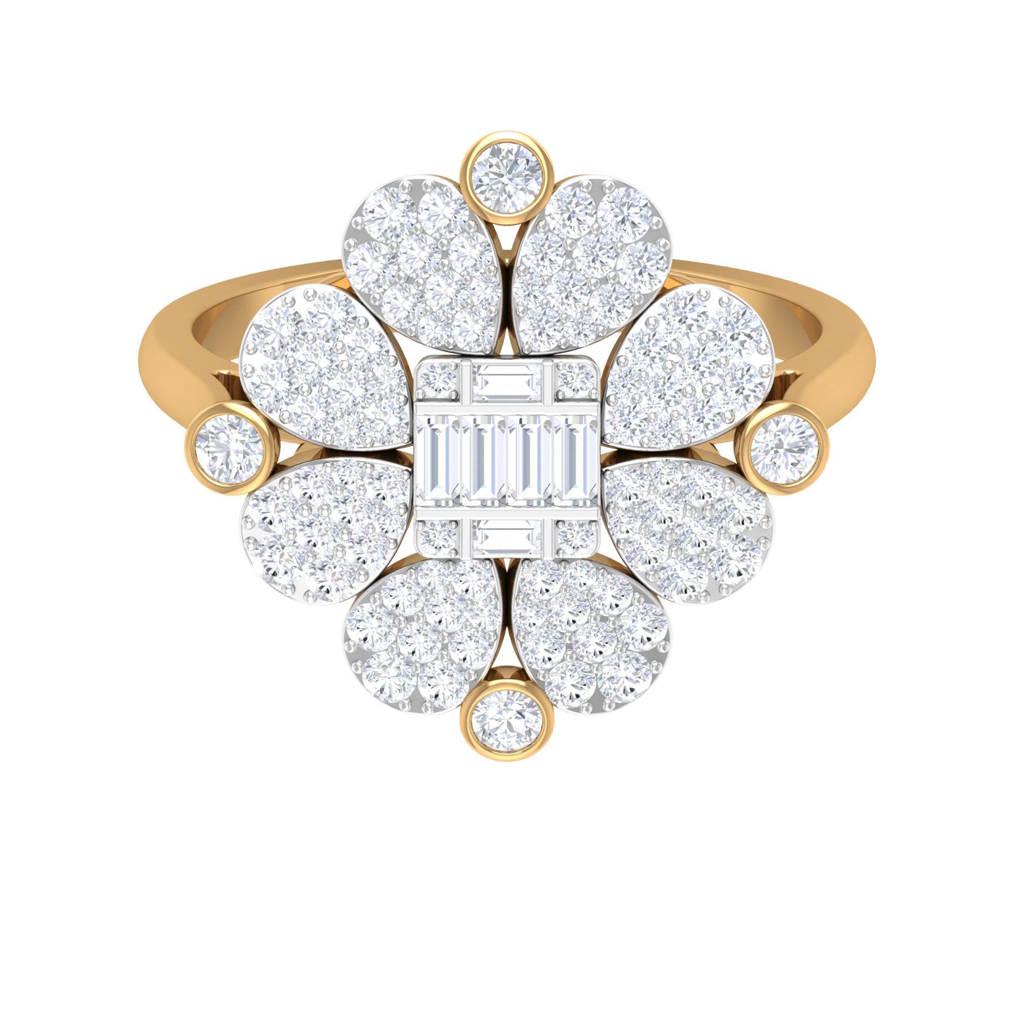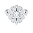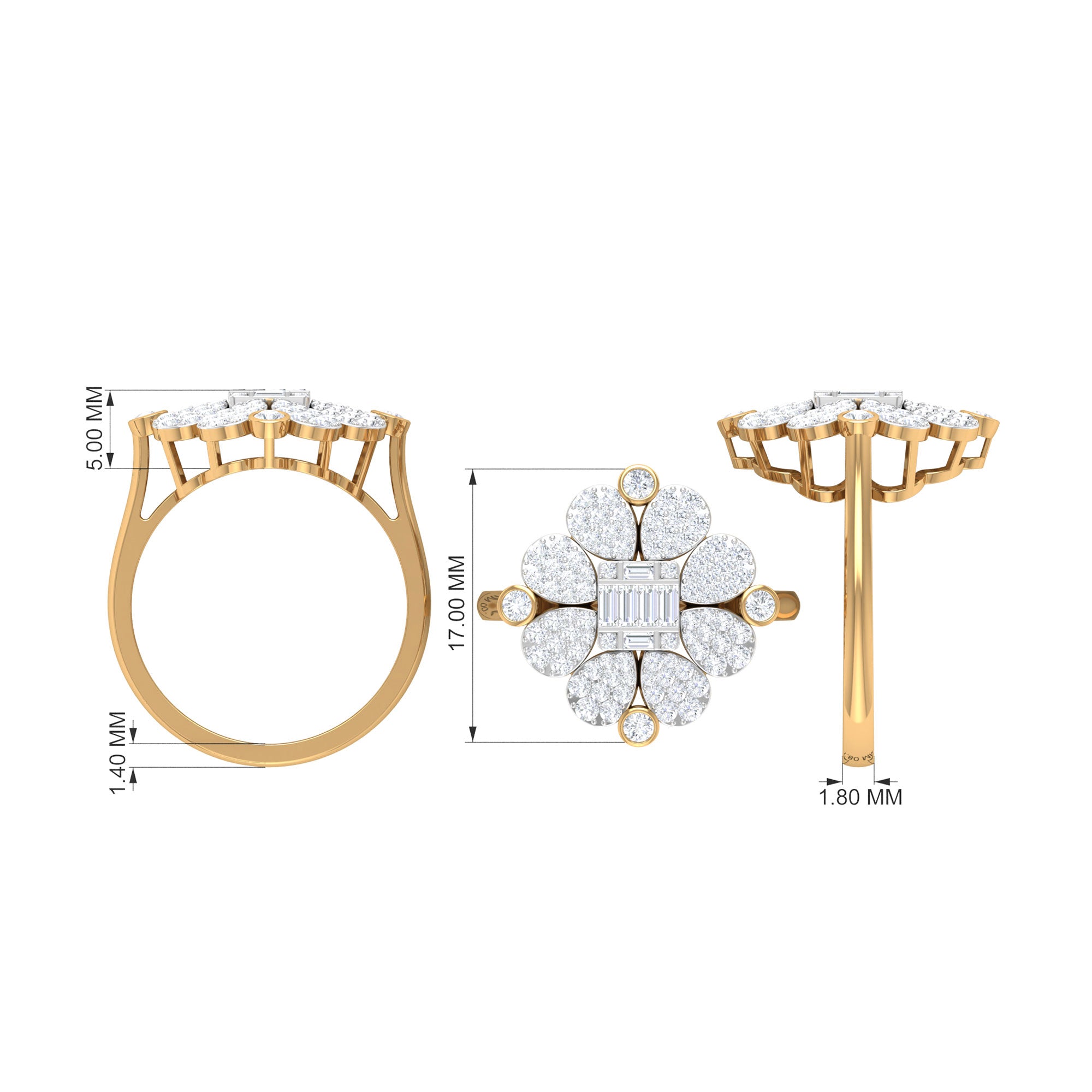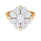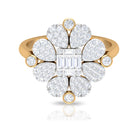Elevate your engagement with our Flower Statement Ring, a true masterpiece of craftsmanship and elegance. The centerpiece of this exquisite ring showcases a stunning arrangement of baguette and round-cut diamonds set in an illusion setting, creating the illusion of a larger, more dazzling diamond. These diamonds form a captivating floral design that symbolizes the blooming love between you and your partner.