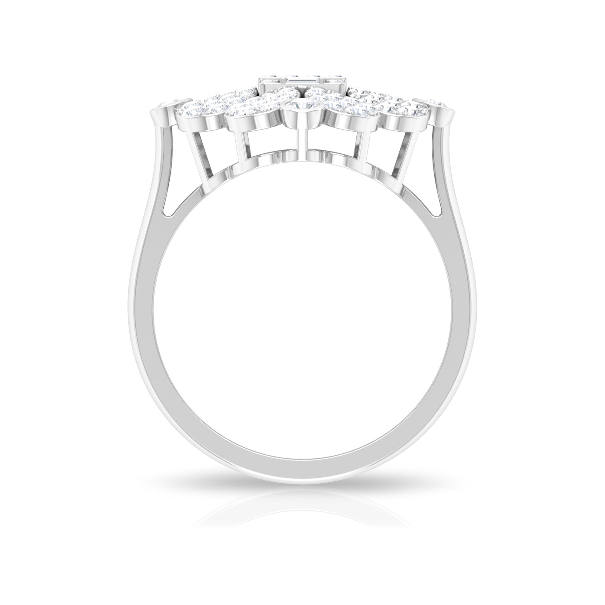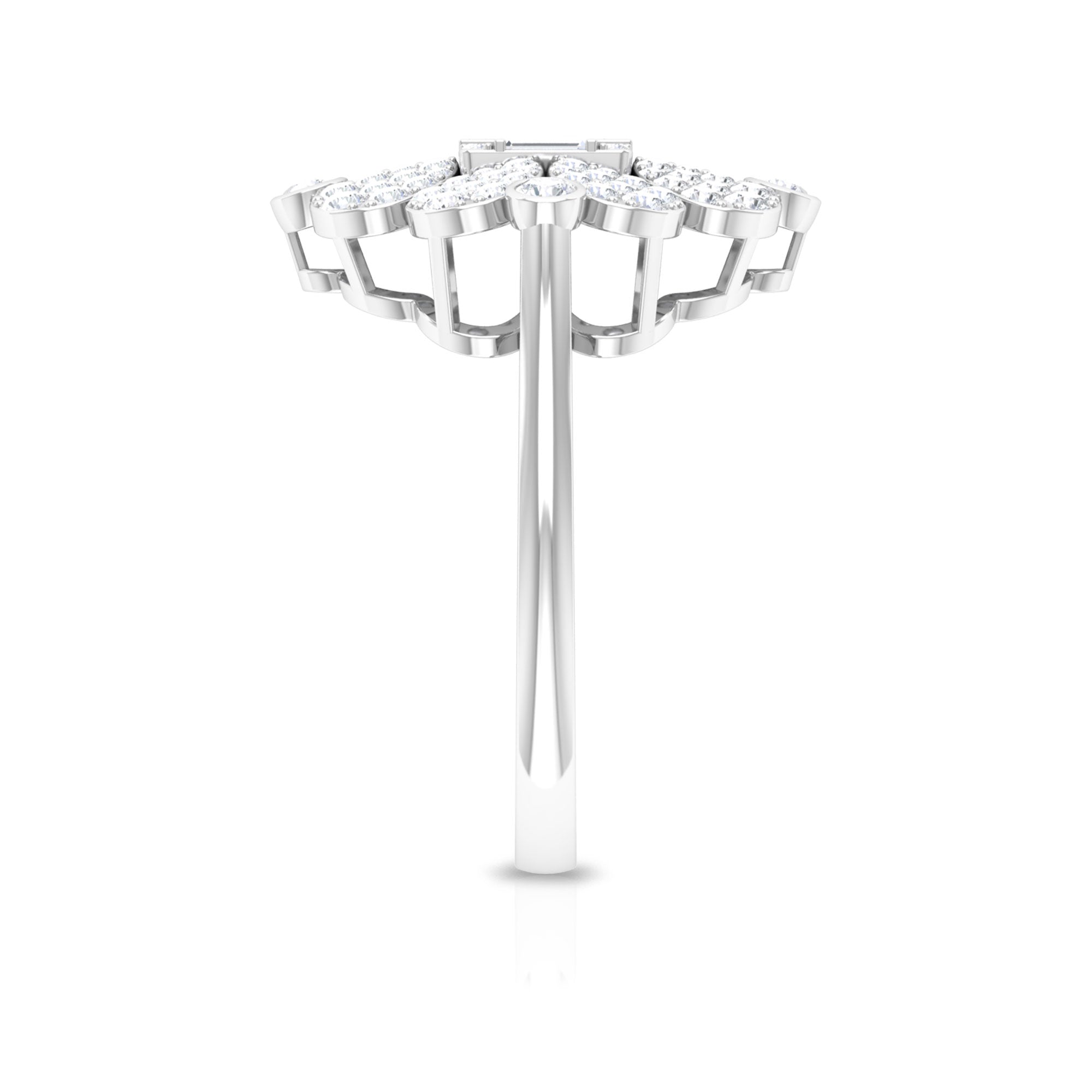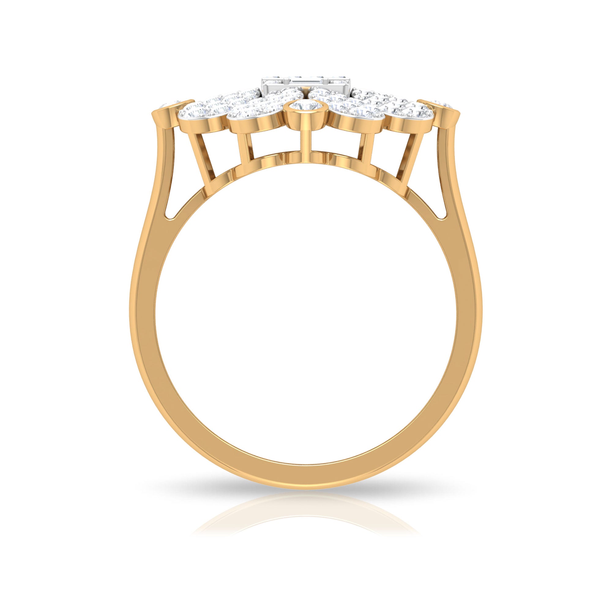 Elevate your engagement with our Flower Statement Ring, a true masterpiece of craftsmanship and elegance. The centerpiece of this exquisite ring showcases a stunning arrangement of baguette and round-cut diamonds set in an illusion setting, creating the illusion of a larger, more dazzling diamond. These diamonds form a captivating floral design that symbolizes the blooming love between you and your partner.