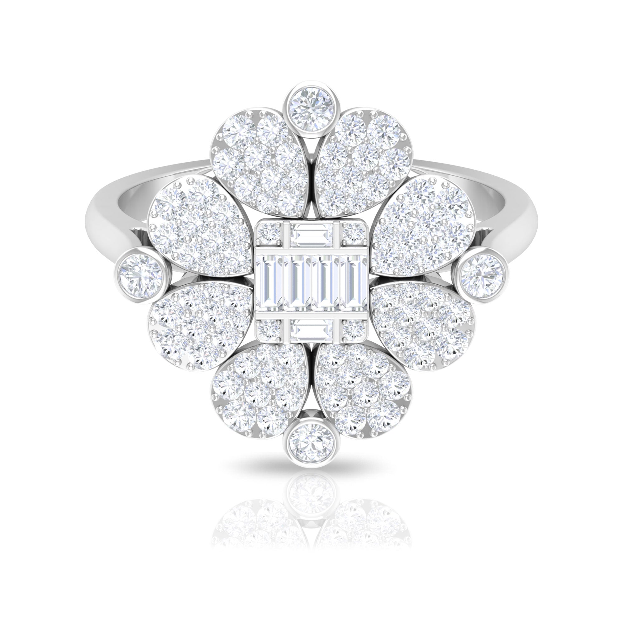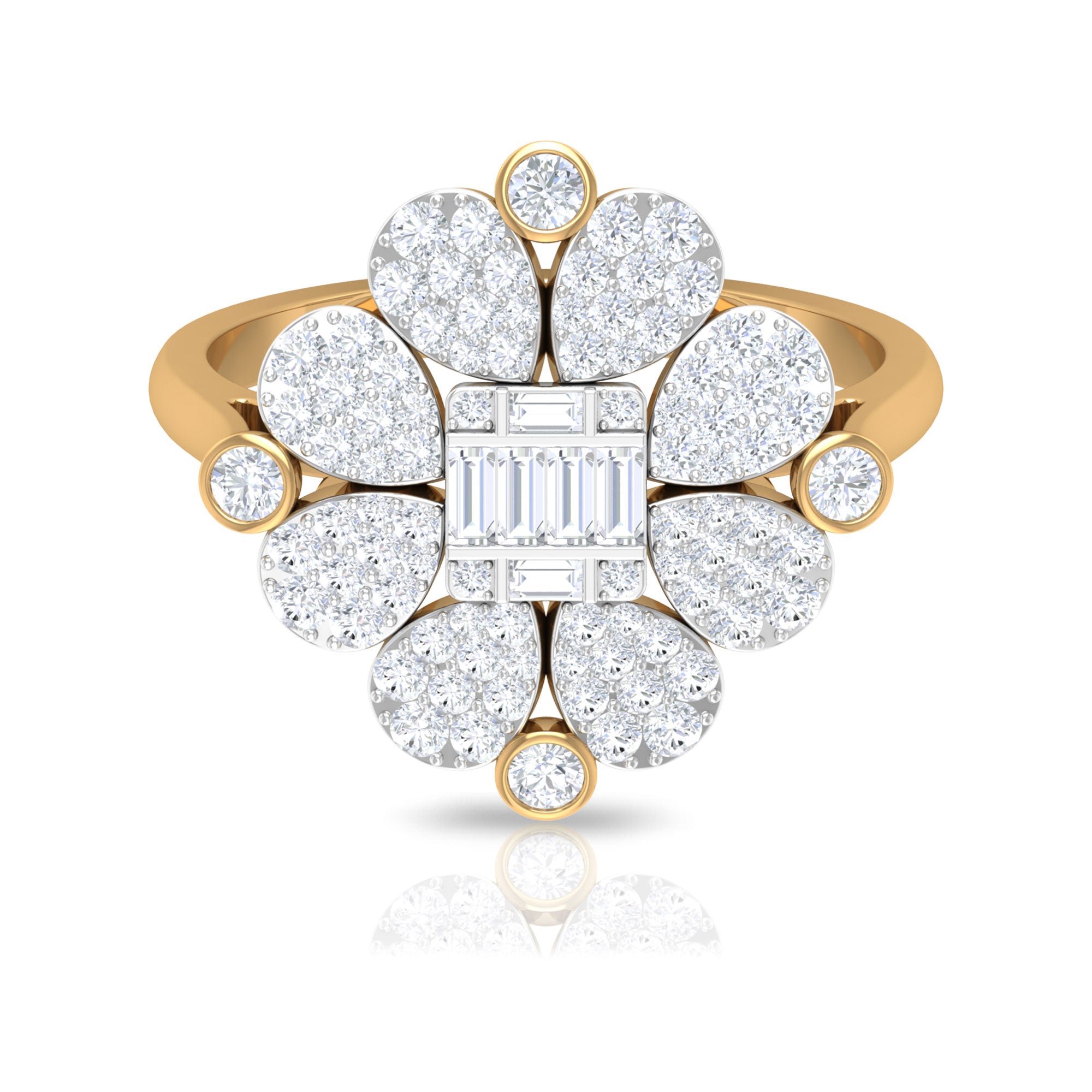 Elevate your engagement with our Flower Statement Ring, a true masterpiece of craftsmanship and elegance. The centerpiece of this exquisite ring showcases a stunning arrangement of baguette and round-cut diamonds set in an illusion setting, creating the illusion of a larger, more dazzling diamond. These diamonds form a captivating floral design that symbolizes the blooming love between you and your partner.