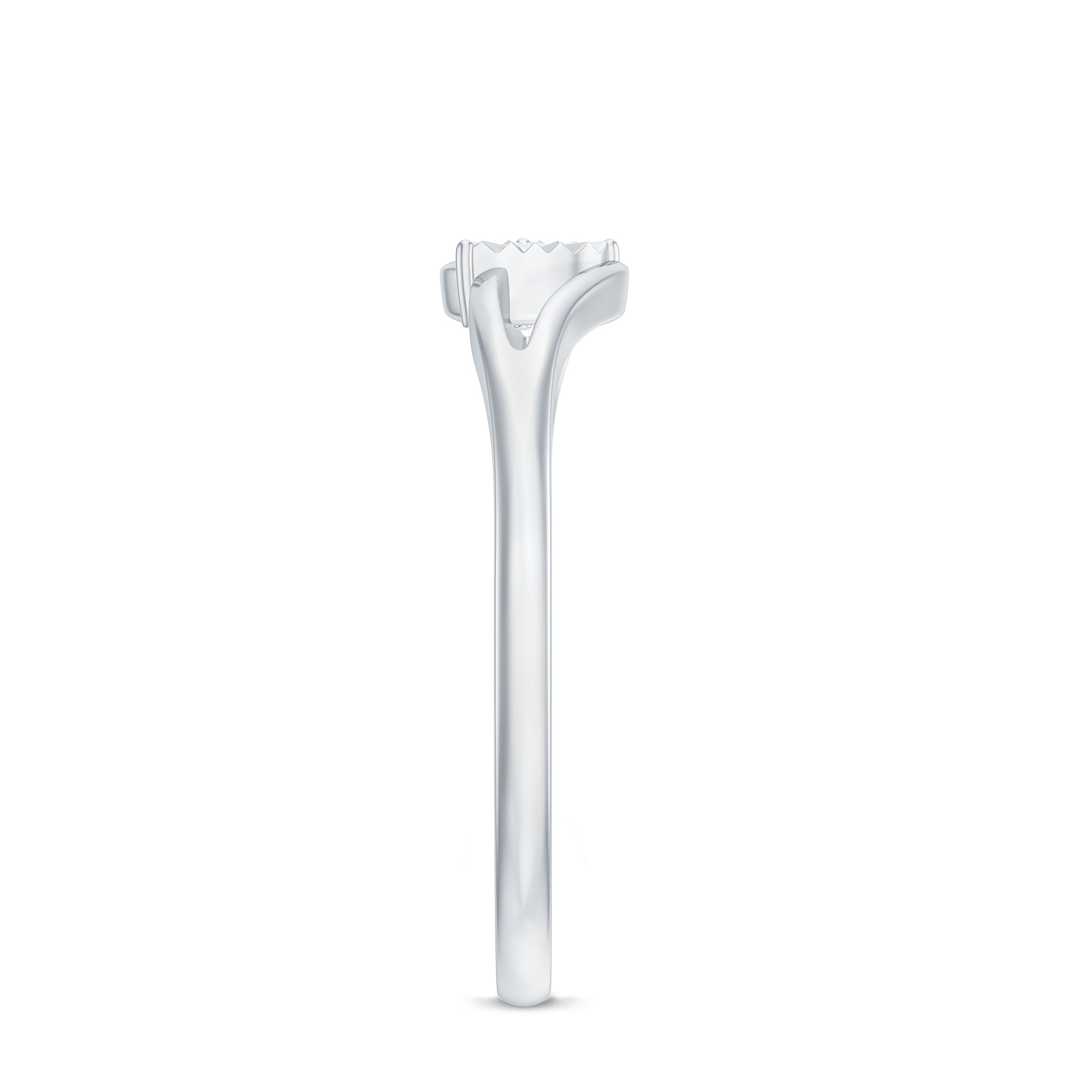 This Miracle Plate Diamond Solitaire Ring features a heart-shaped miracle plate with a round-cut diamond in an illusion setting, on a split shank band. It is designed to be a beautiful and elegant accessory.