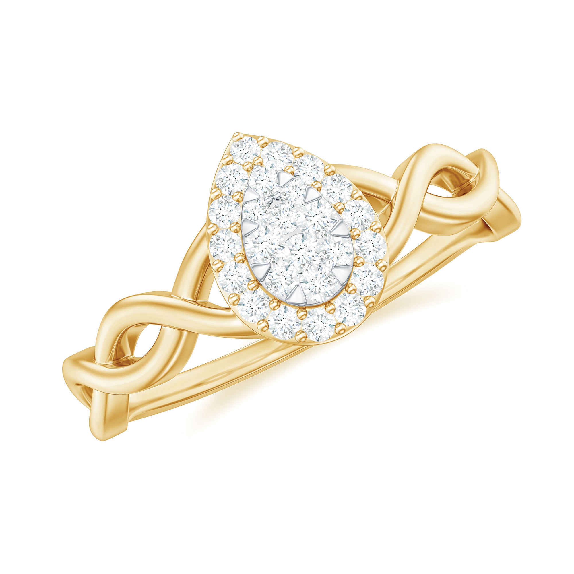 Get this beautiful Crossover Halo Engagement Ring for your special day. This Engagement Ring is adorned with Round Shape Moissanite in the center in an illusion setting with Round Moissanite in a halo setting with a gold crossover shank. This Moissanite Engagement Ring is available in gold metal.