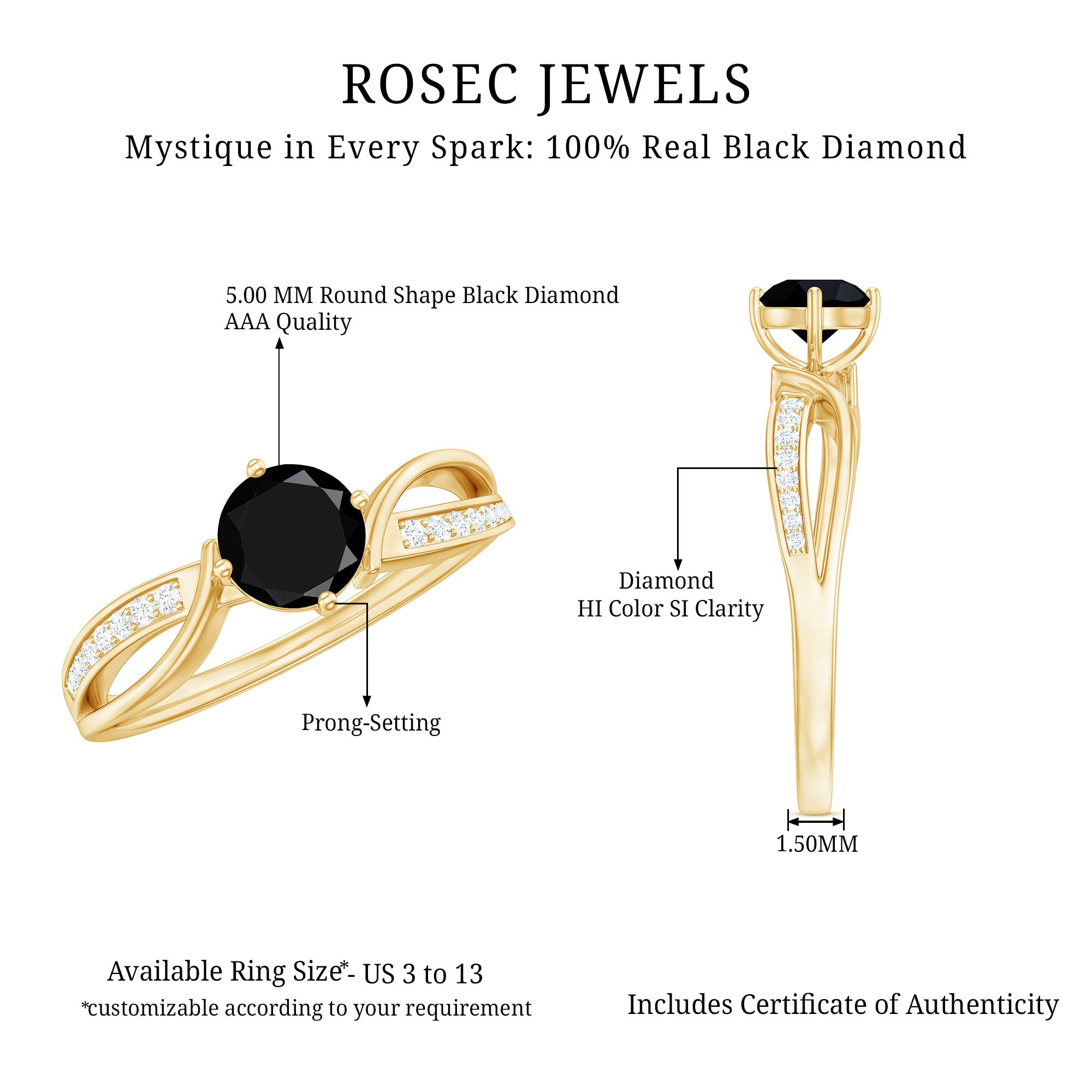 Make your special day unforgettable with this stunning Solitaire Engagement Ring. Adorned with a gorgeous Round Shape Black Diamond in a secure prong setting and Diamond for added shine, this Infinity Ring is crafted in gold for a luxurious appearance. Give the gift of love and happiness to your partner by presenting this Black Diamond Engagement Ring on your big day. Cherish the memories of your special moment forever with this beautiful piece of jewelry.
