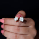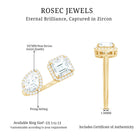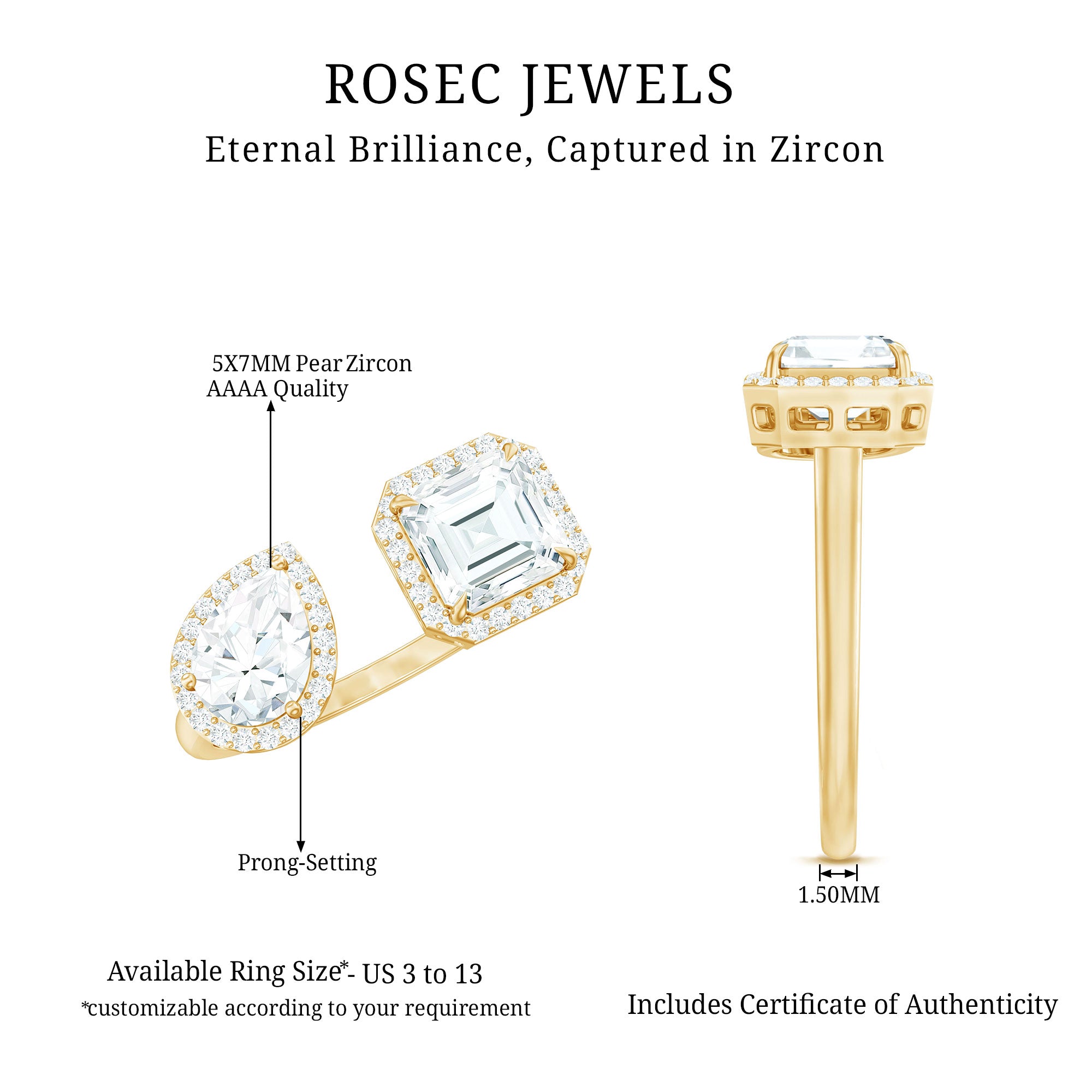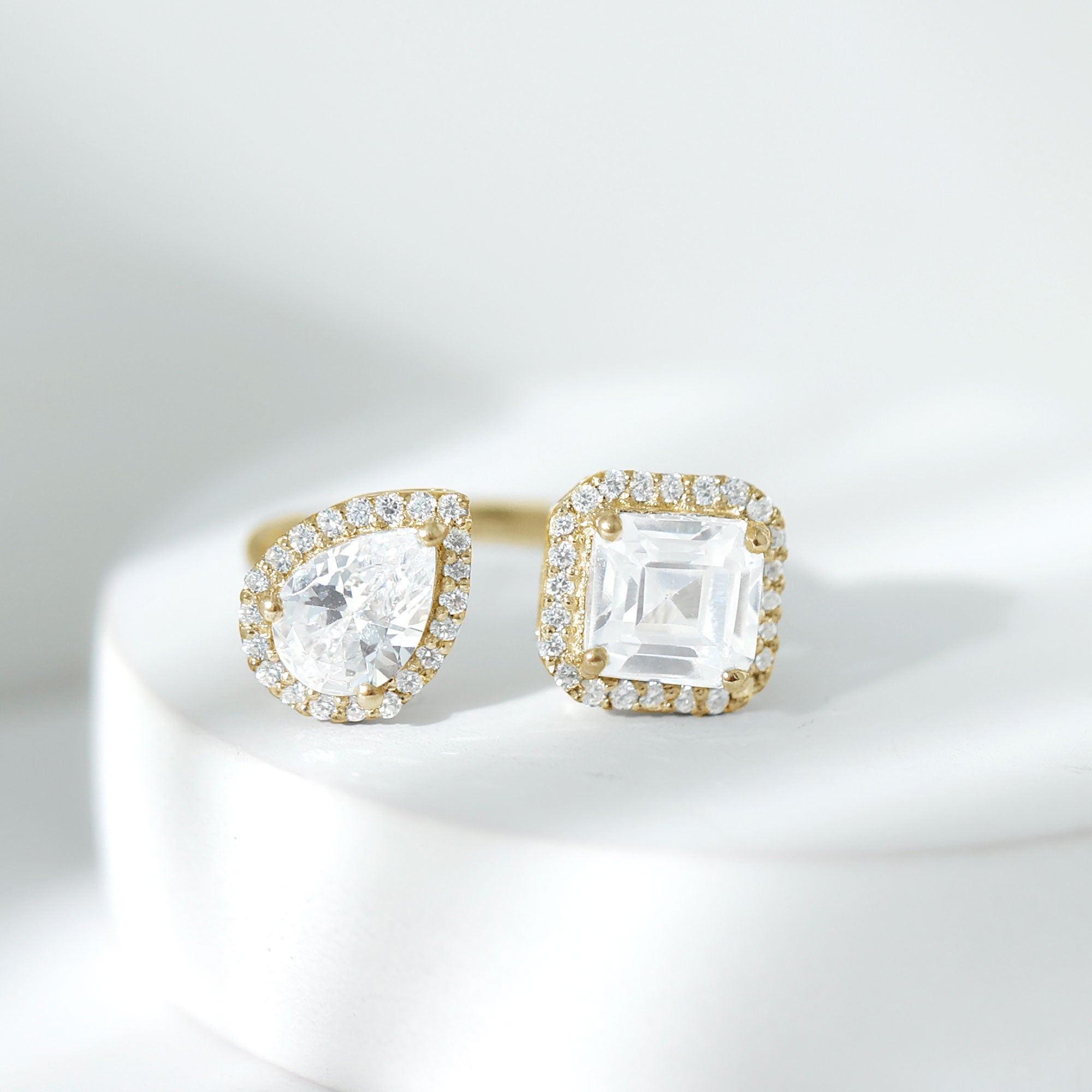 This stylish cuff ring is inspired by Kylie Jenners trendy fashion sense. The ring features two dazzling pear and asscher cut zircon stones set in a unique and modern design with zircon halo. The gold metal cuff adds a touch of elegance and sophistication to the piece, making it perfect for dressing up any outfit. The zircon stones provide a brilliant sparkle that catches the eye and adds a glamorous touch. This cuff ring is perfect for those who love to make a statement with their jewelry, and it is a great choice for adding a touch of elegance and sparkle to any look.