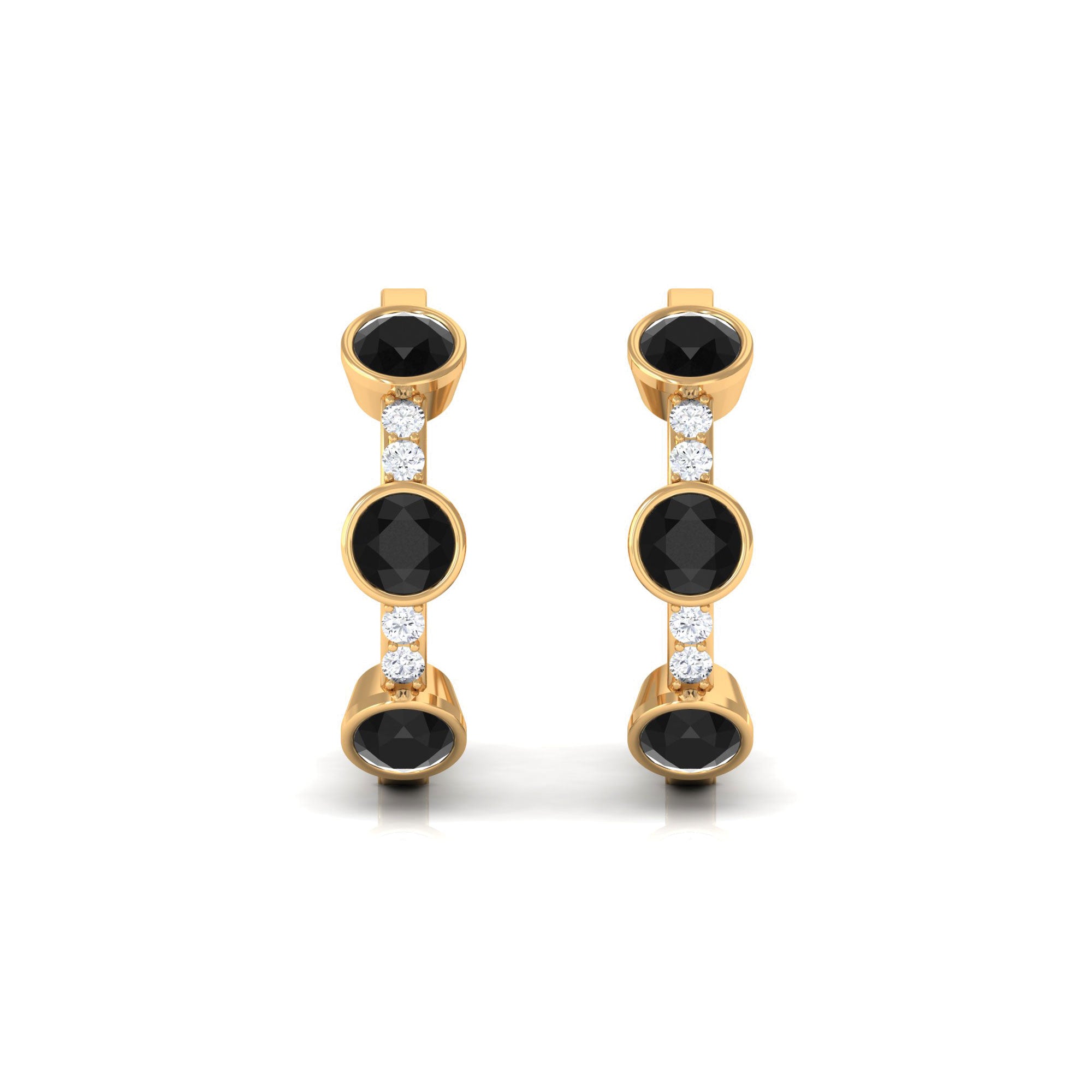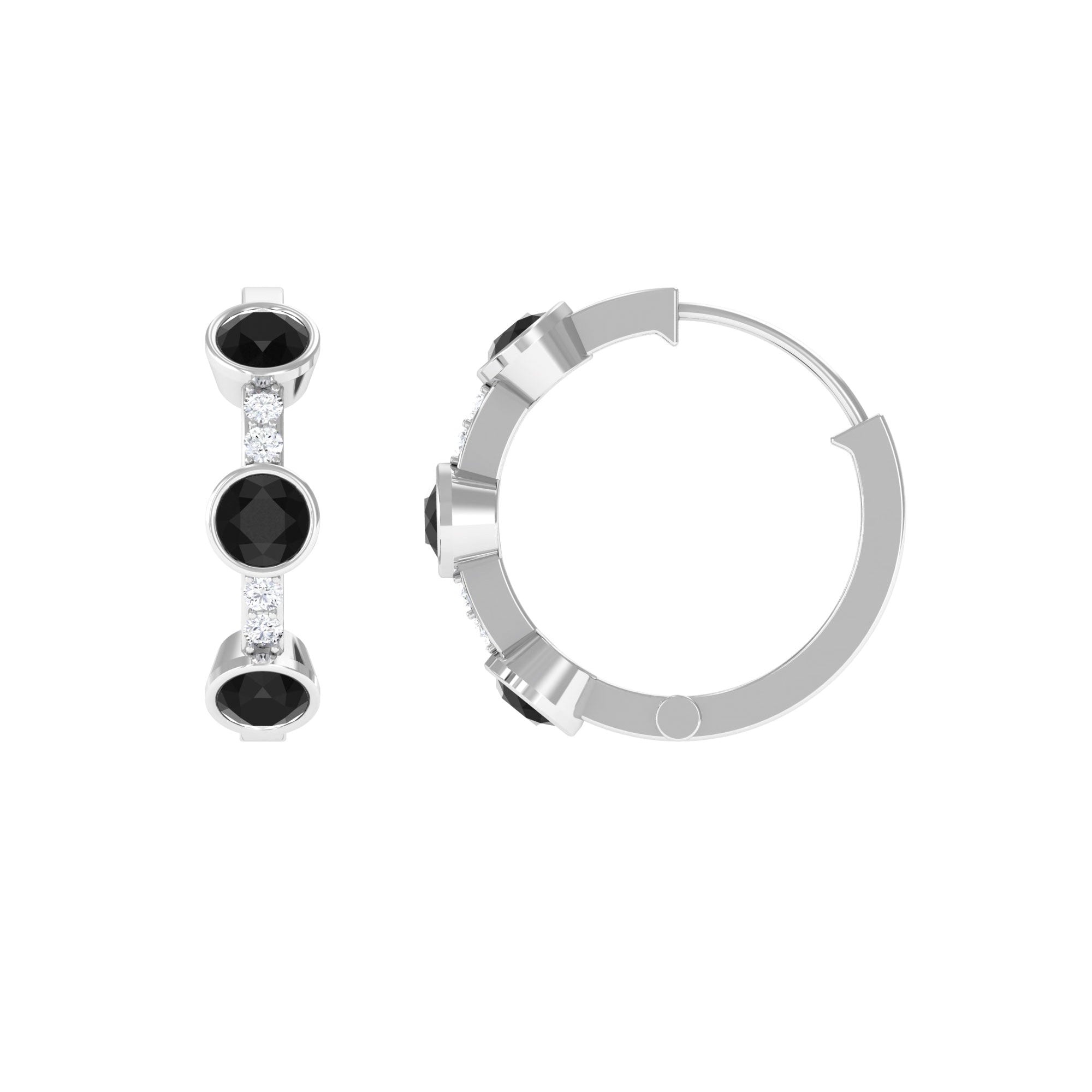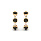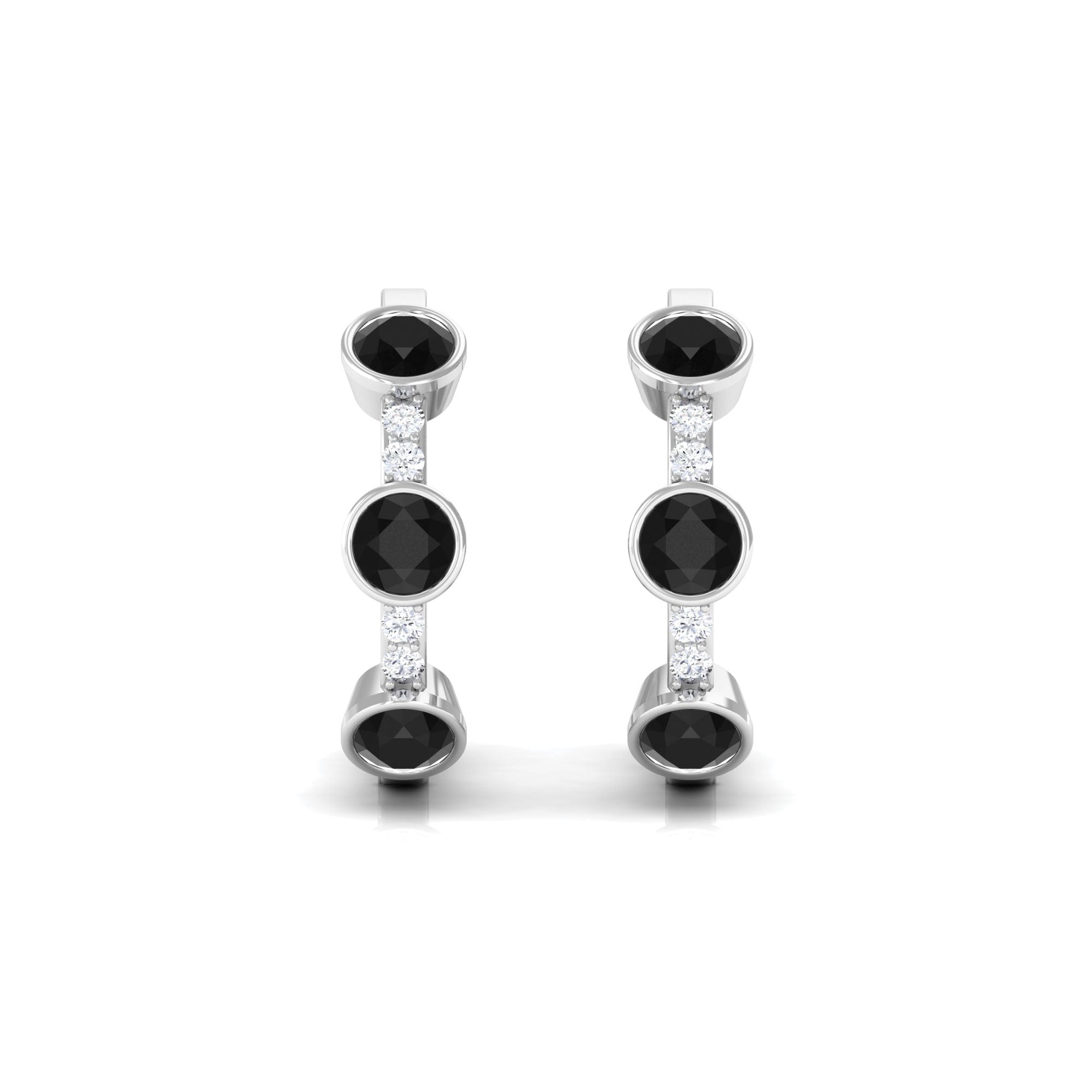 These Black and White Diamond Earrings are a stunning and elegant piece of jewelry. Featuring a hinged hoop design, each earring is set with three round cut lab created Black Diamonds in a sleek and modern bezel setting. Flanking the Black Diamonds are sparkling Diamond stones set between each black stone, adding a touch of glamour to the Huggie Hoop Earrings. The Black Diamond Earrings are secure and comfortable to wear, with a hinged closure that ensures they stay in place. The AAAA quality Black Diamonds are lab-grown, providing a top notch look without the high cost, and the HI-SI quality white Diamond stones are carefully selected to ensure brilliant sparkle. These Black Diamond Hoop Earrings are versatile and can be styled with any outfit from casual to formal, making them a perfect accessory for any occasion. With a sophisticated and stylish design, these Minimalist Earrings are sure to make a statement and are an ideal choice for anyone who loves high-quality jewelry.