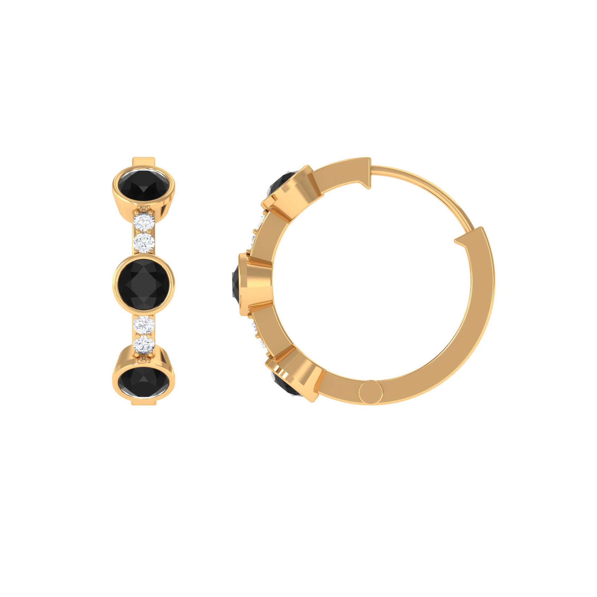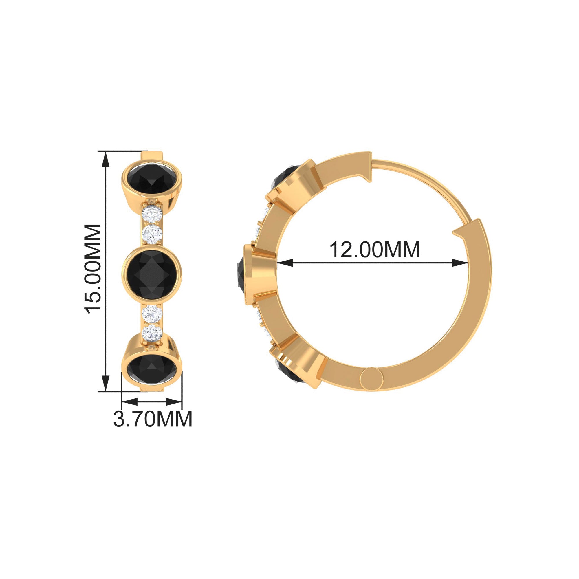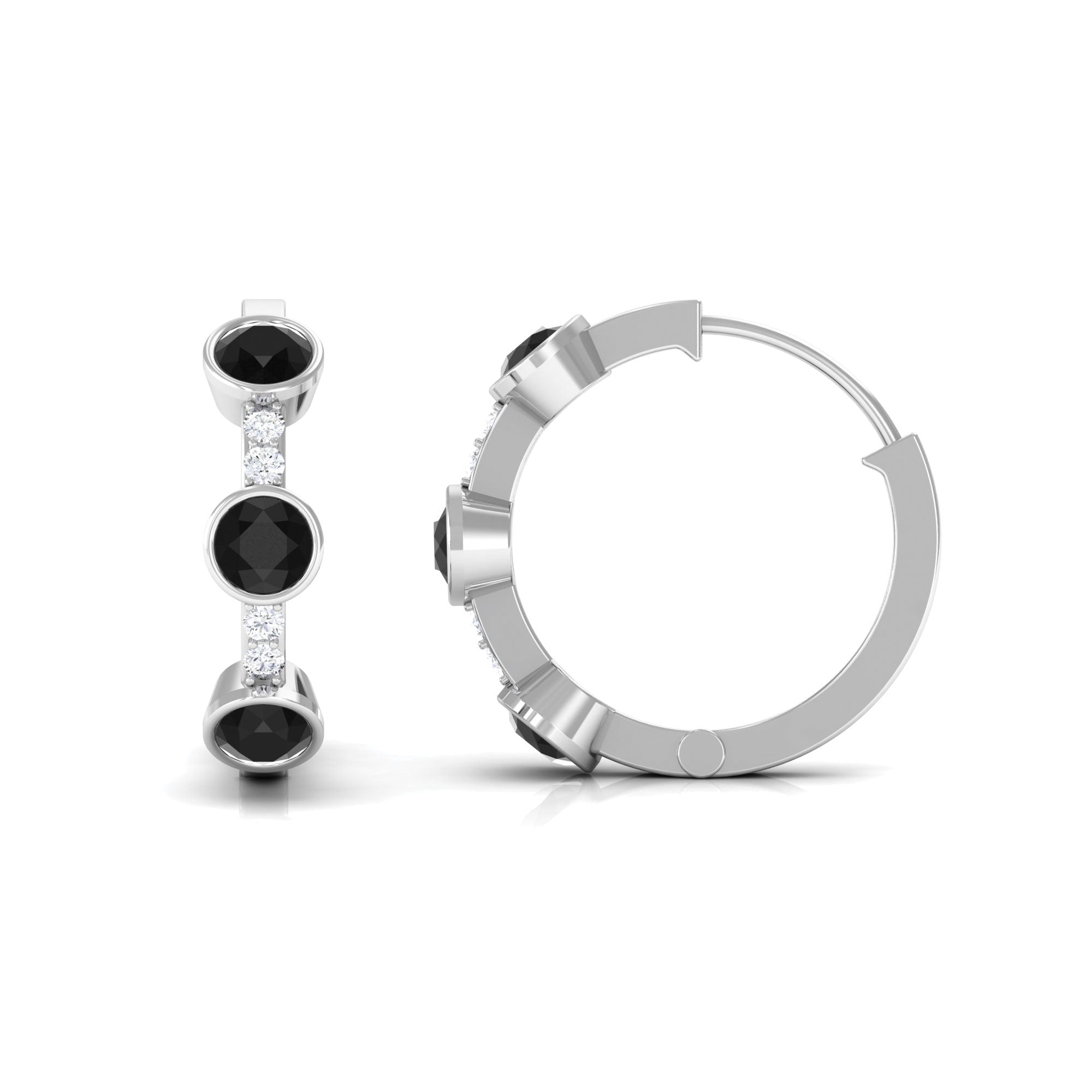 These Black and White Diamond Earrings are a stunning and elegant piece of jewelry. Featuring a hinged hoop design, each earring is set with three round cut lab created Black Diamonds in a sleek and modern bezel setting. Flanking the Black Diamonds are sparkling Diamond stones set between each black stone, adding a touch of glamour to the Huggie Hoop Earrings. The Black Diamond Earrings are secure and comfortable to wear, with a hinged closure that ensures they stay in place. The AAAA quality Black Diamonds are lab-grown, providing a top notch look without the high cost, and the HI-SI quality white Diamond stones are carefully selected to ensure brilliant sparkle. These Black Diamond Hoop Earrings are versatile and can be styled with any outfit from casual to formal, making them a perfect accessory for any occasion. With a sophisticated and stylish design, these Minimalist Earrings are sure to make a statement and are an ideal choice for anyone who loves high-quality jewelry.