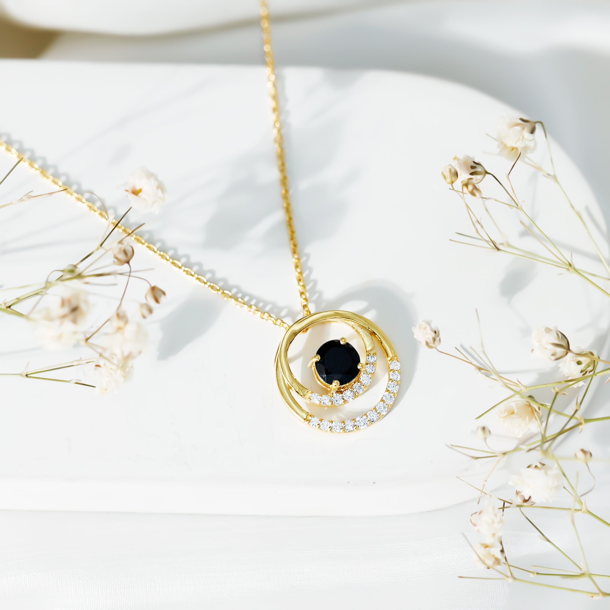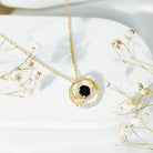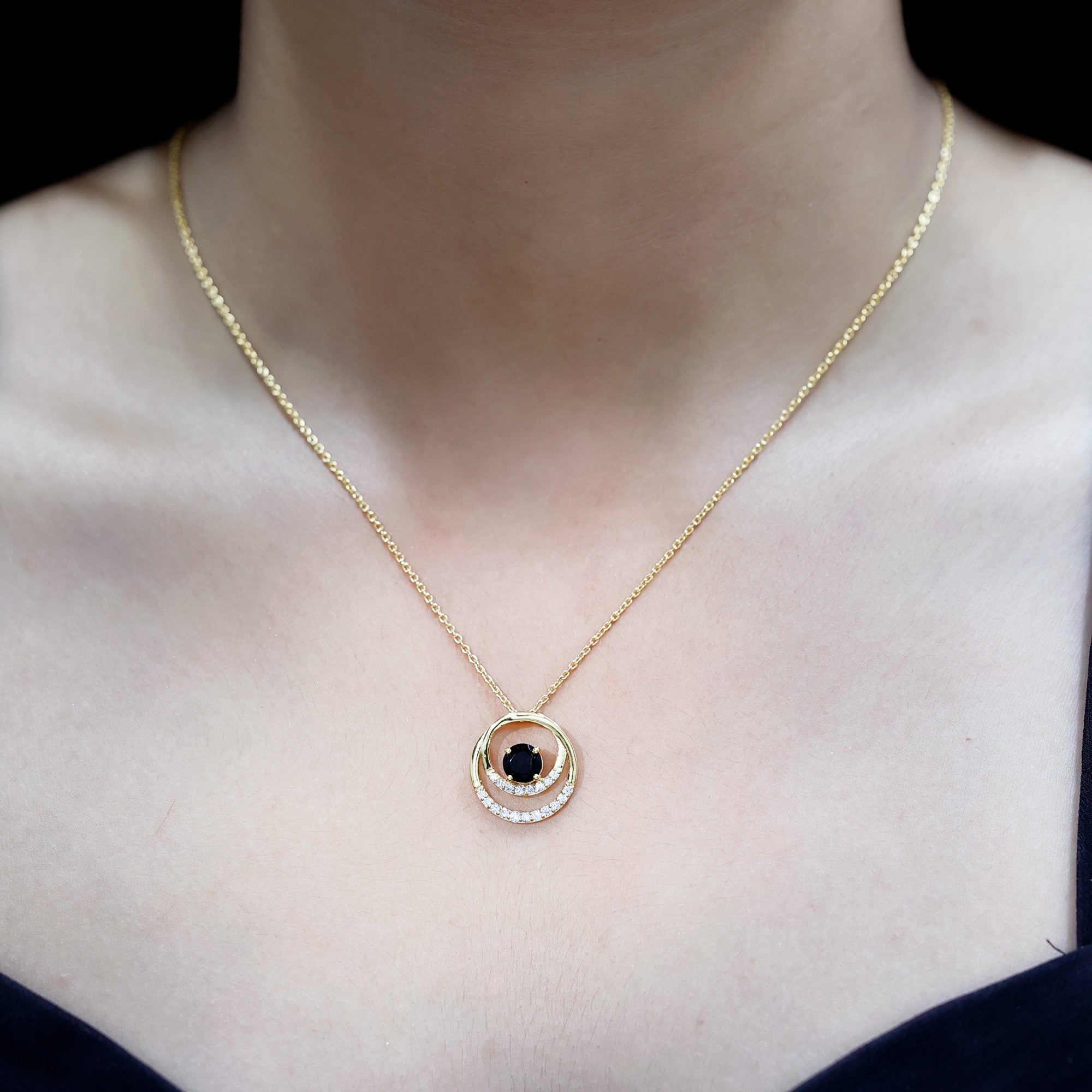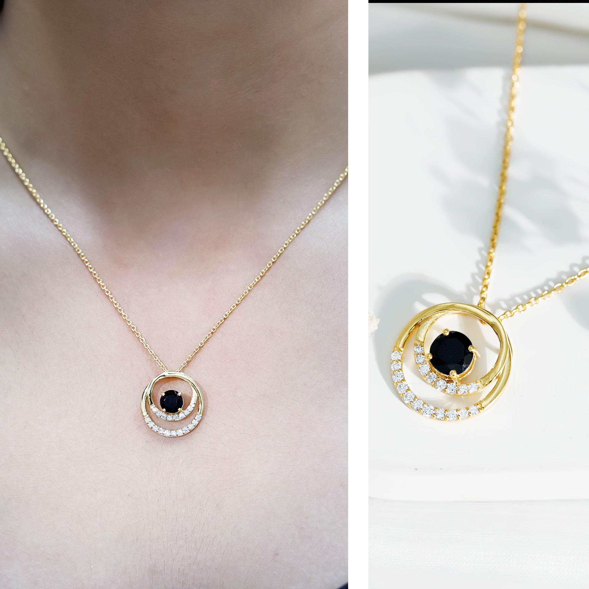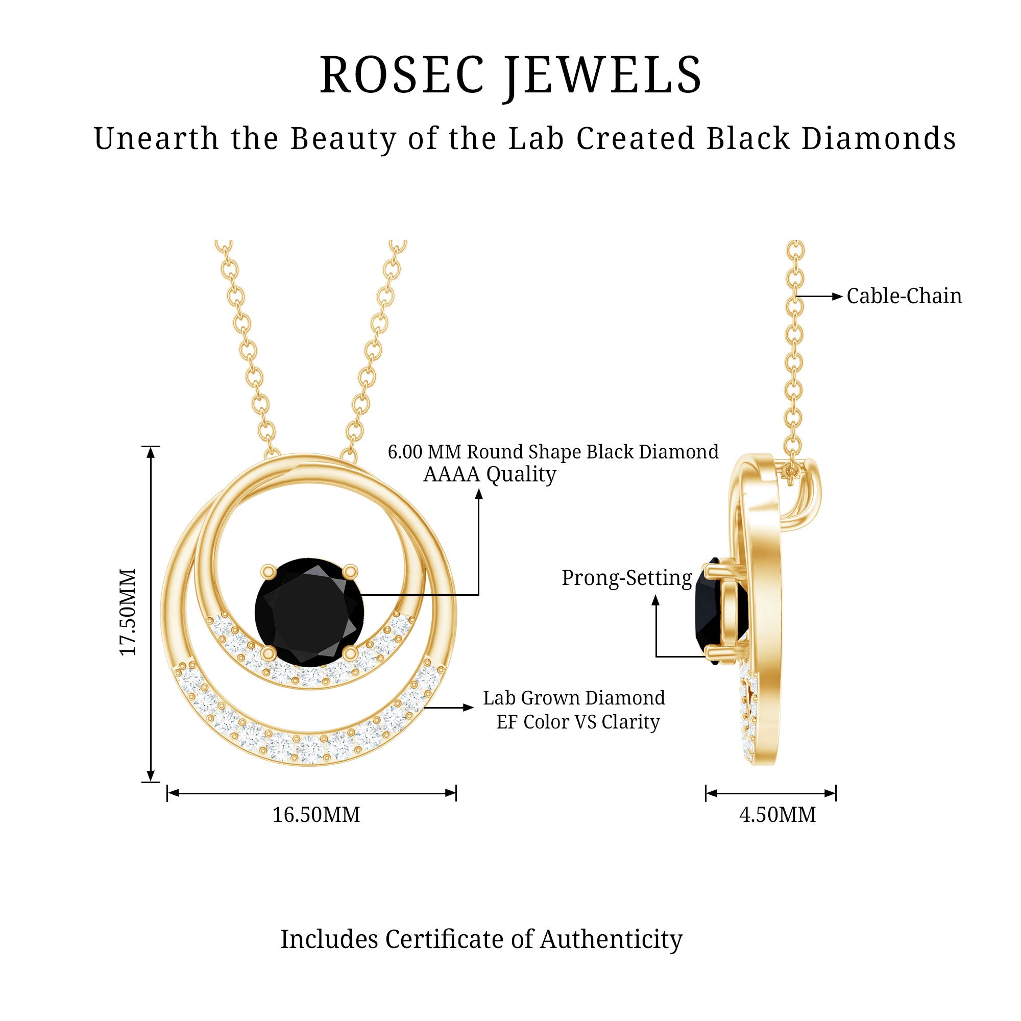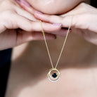 If you are looking for a piece that is modern, meaningful, and easy to wear every day, this Lab Created Black Diamond Pendant Necklace is just the one. This stunning Open Circle Necklace features two interlocked open circles decorated with sparkling lab created white diamonds. Right at the center, a 6 MM Round cut lab created black diamond is secured in prong setting, adding just the right amount of contrast and mystery. Crafted in 14K yellow gold plated silver, this Circle Interlocking Necklace brings together timeless elements with a modern style. The hidden bail gives it a floating look, allowing the Eternity Necklace to hang smoothly on its strong, durable chain. Whether you are wearing it with a casual outfit or pairing it with something dressier, it fits every mood and moment. It is a thoughtful gift for anniversaries, celebrations, or simply to treat yourself with something unique. Our diamonds are lab-created, which means they are ethically sourced, conflict-free, and better for the planet. This Black and White Diamond Necklace comes with a certificate of authenticity and arrives in a premium jewelry box, ready to gift or keep.
