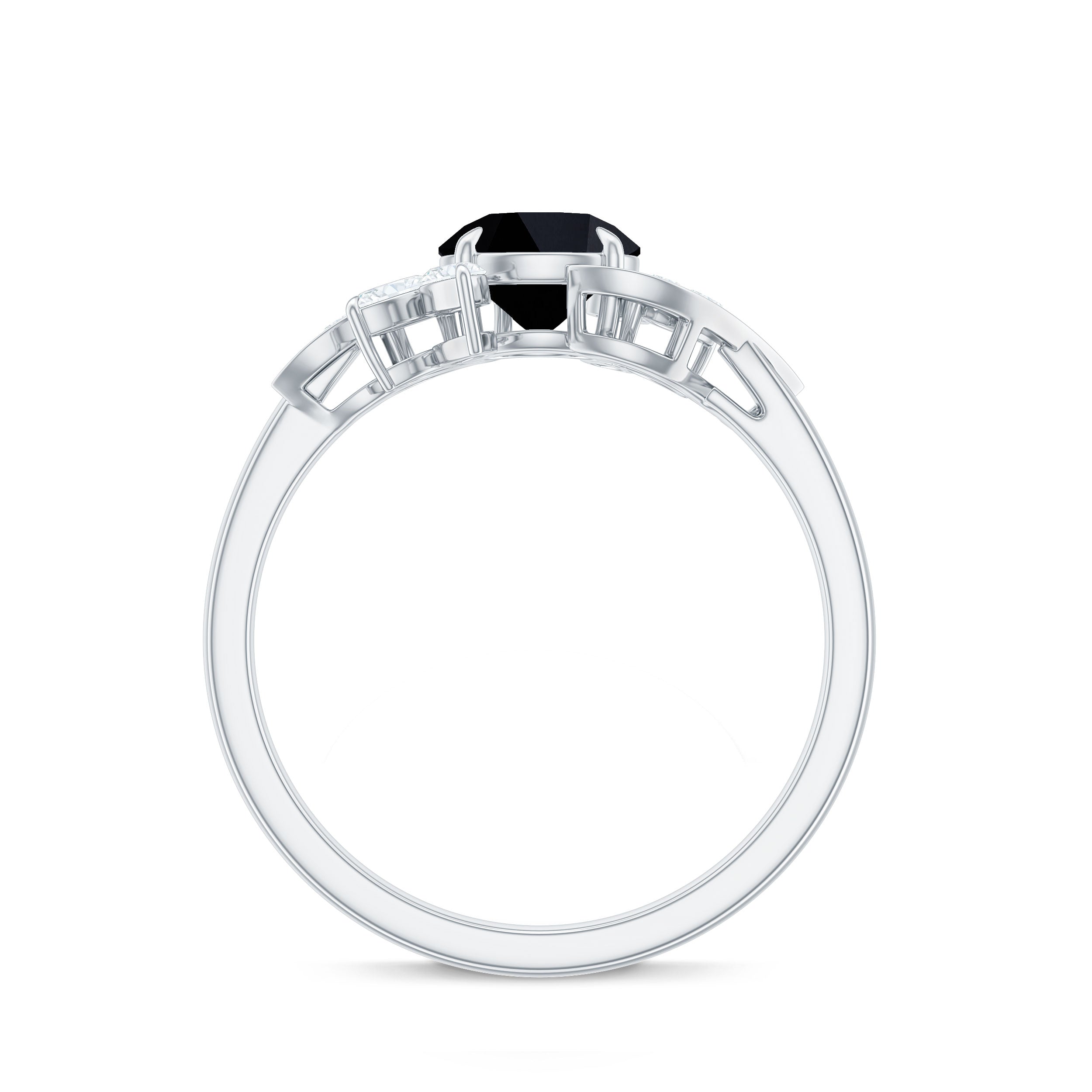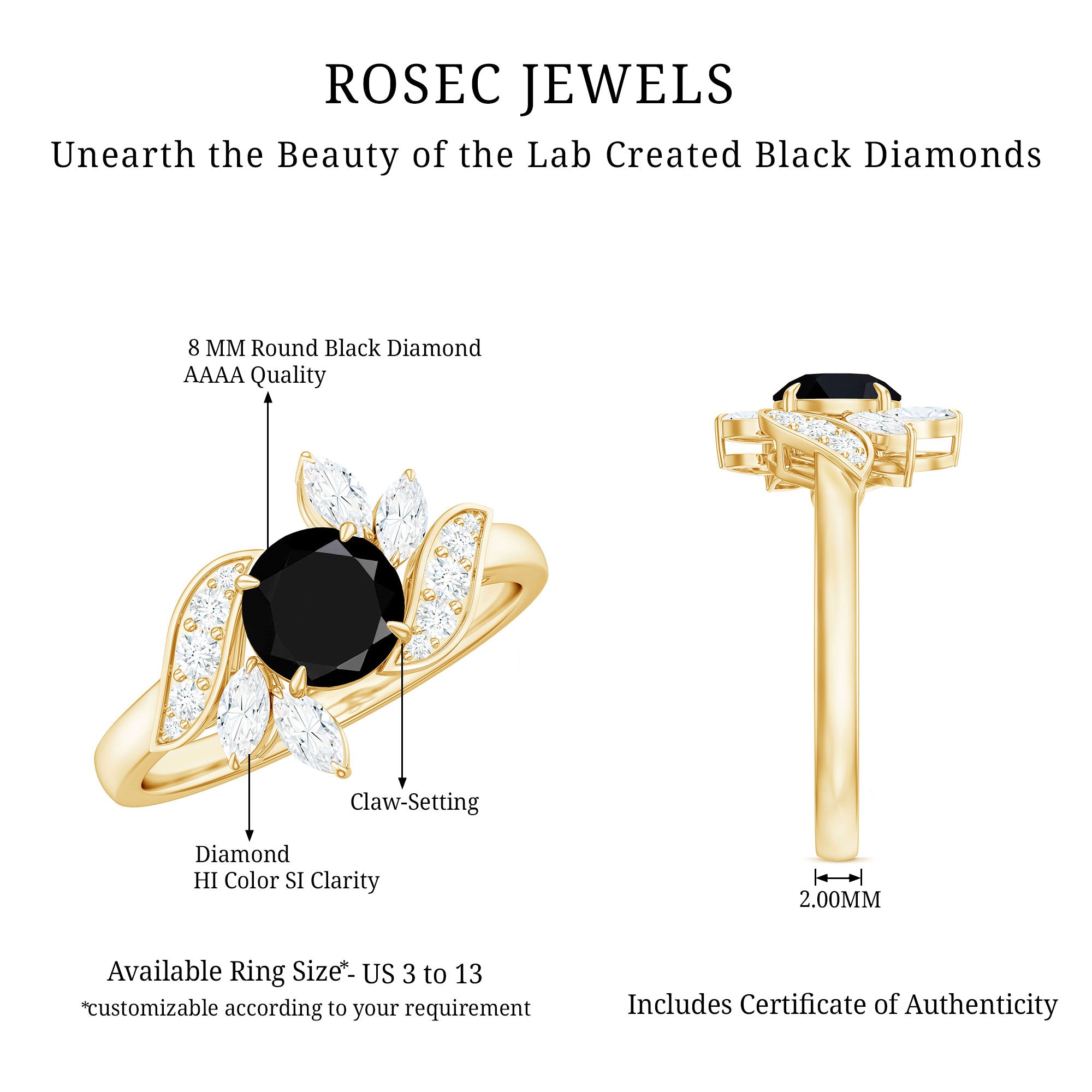 Every moment of yours is worth celebrating, so why not celebrate it with an alluring fine jewelry. This Created Black Diamond Engagement Ring is exactly what your are looking for your partner, Round Created Black Diamond and Marquise Diamond is held in Claw Setting and Round Diamond is held in prong setting are featured in leaf pattern. Show your love to your partner with this Vintage Created Black Diamond Ring.