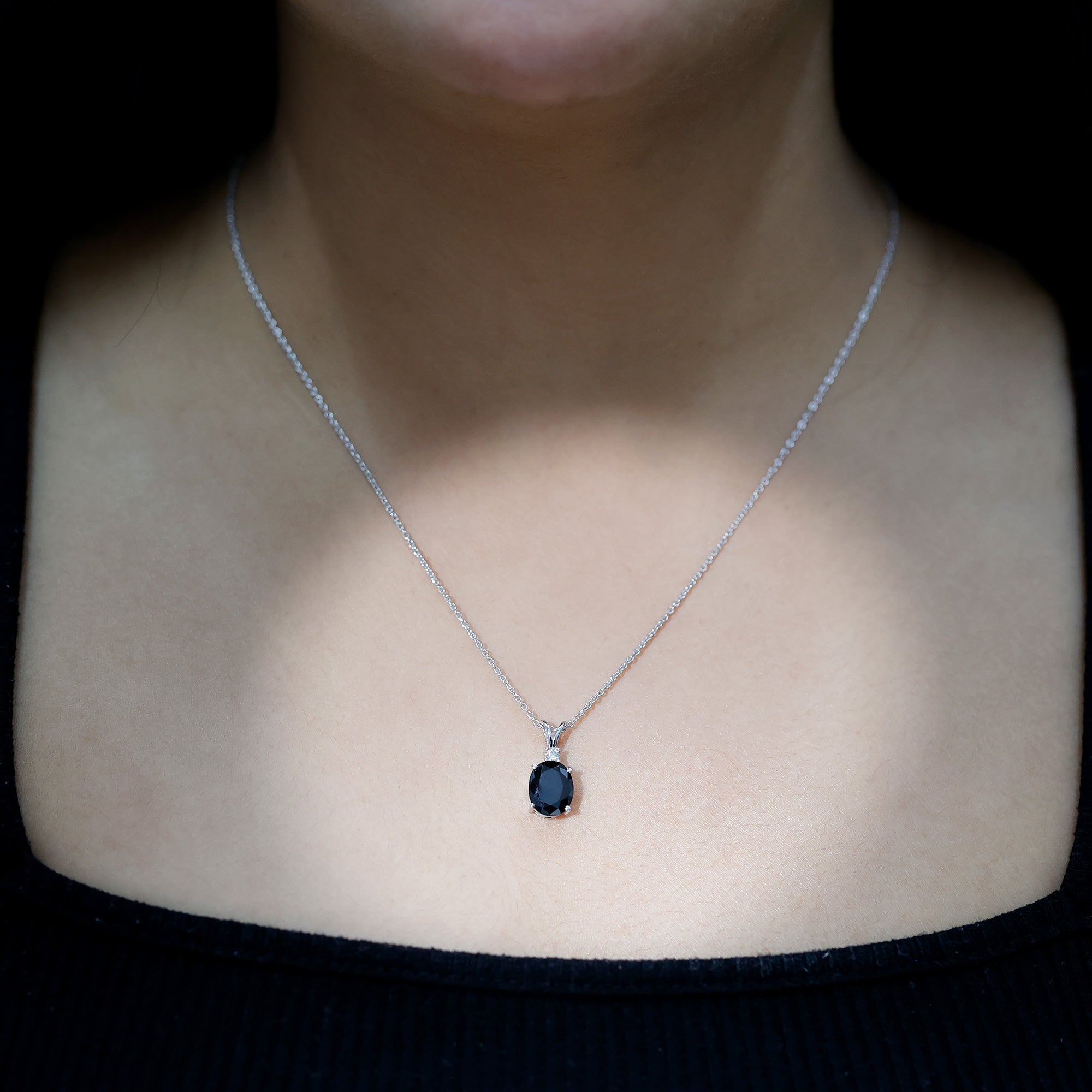 Add an intense hue to the outfit with this Lab Created Black Diamond Pendant, precisely crafted with 14K White Gold Plated Silver. The pendant features an 8X10 MM Synthetic Black Diamond securely placed in Prong Setting. The pendant holds the classic shine of AAAA Quality Lab Grown Black Diamond, which is topped with the smaller Moissanite. This Solitaire Pendant is accentuated with the standard Bail and dangles with the classic cable chain. This Statement Pendant Necklace will be delivered to you with a gemstone certificate of authenticity.