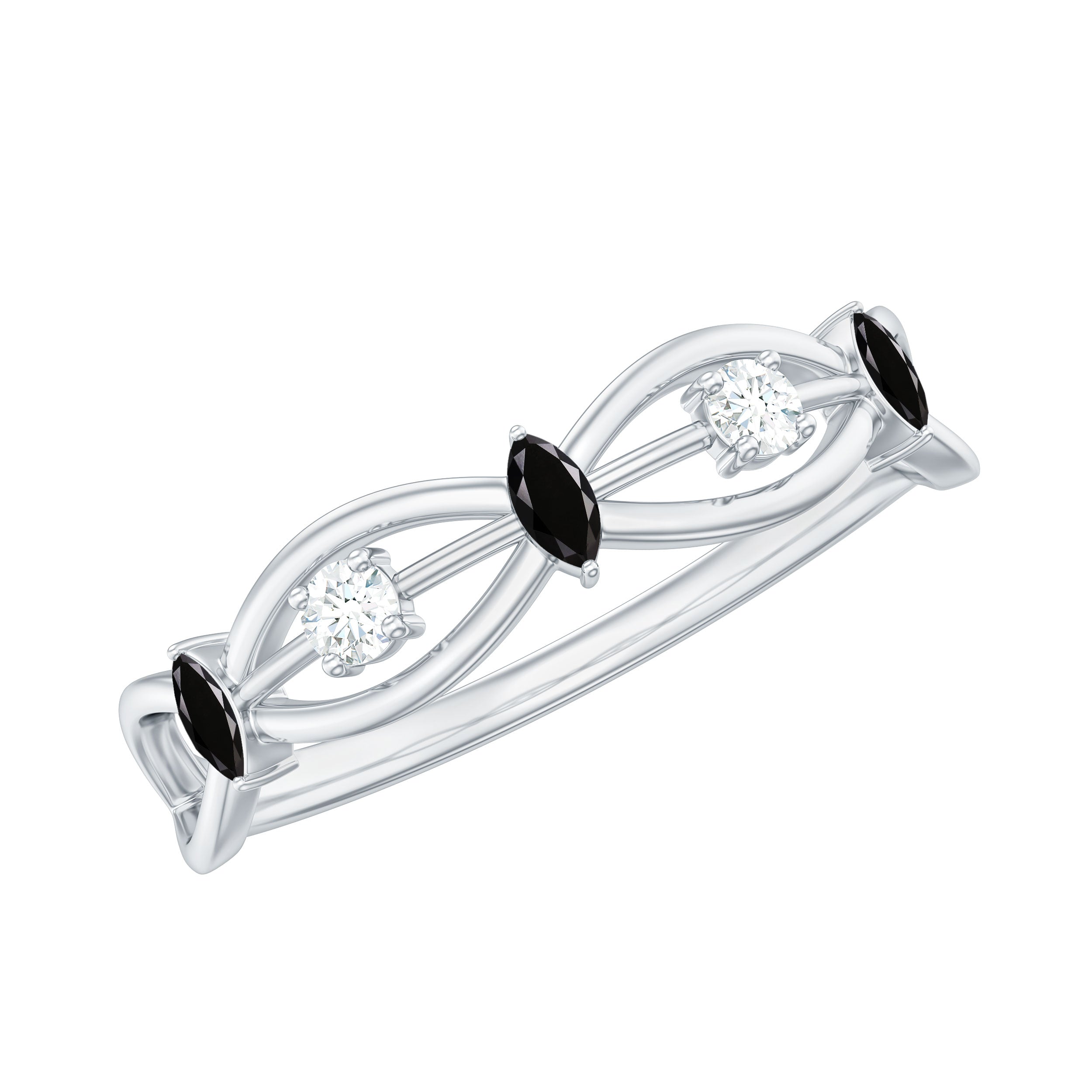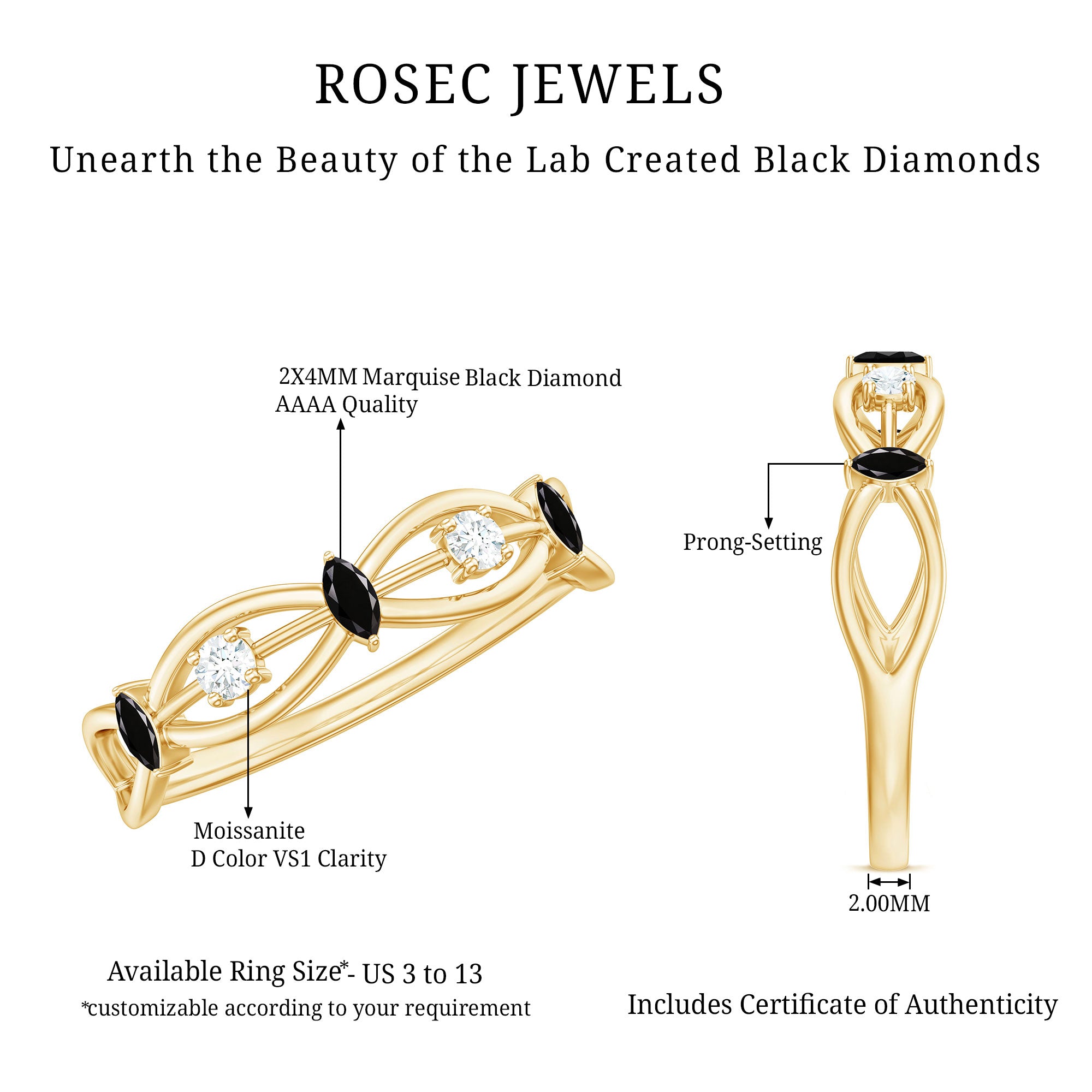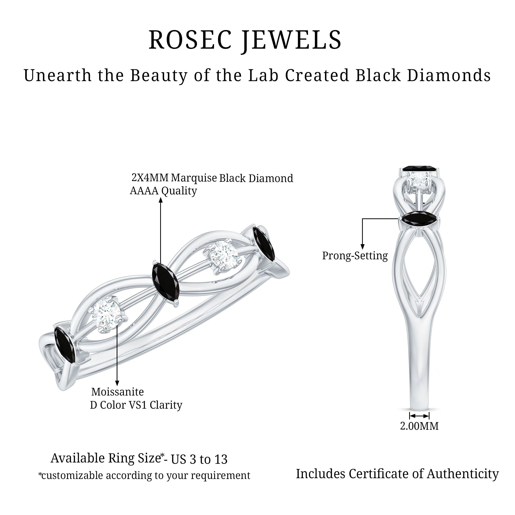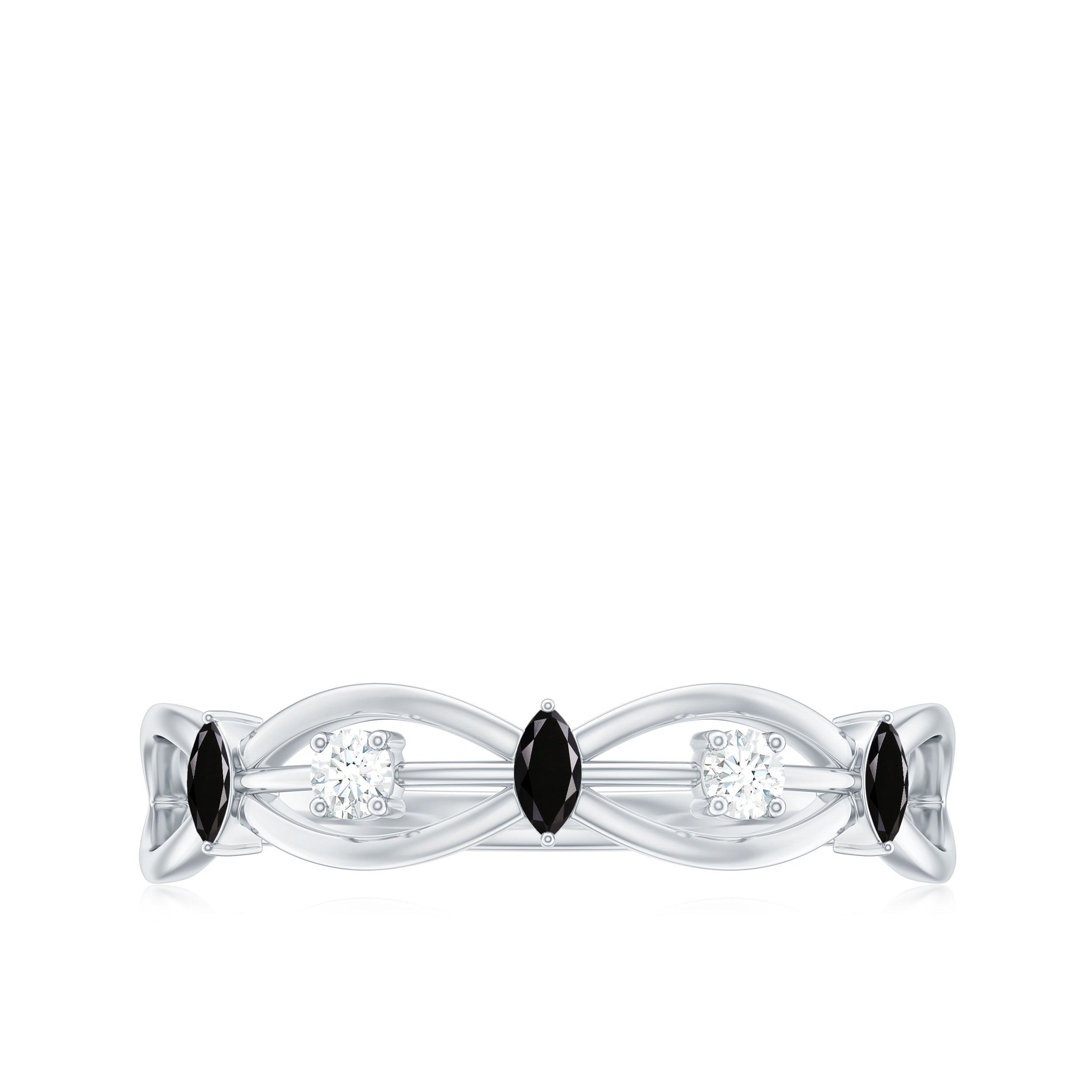 Elevate your style with the classy Created Black Diamond Minimal Promise Band. It features marquise cut lab created Black Diamonds and real white Moissanite on a designer shank. Snag this versatile piece for a hassle-free, simple, and classic look.
