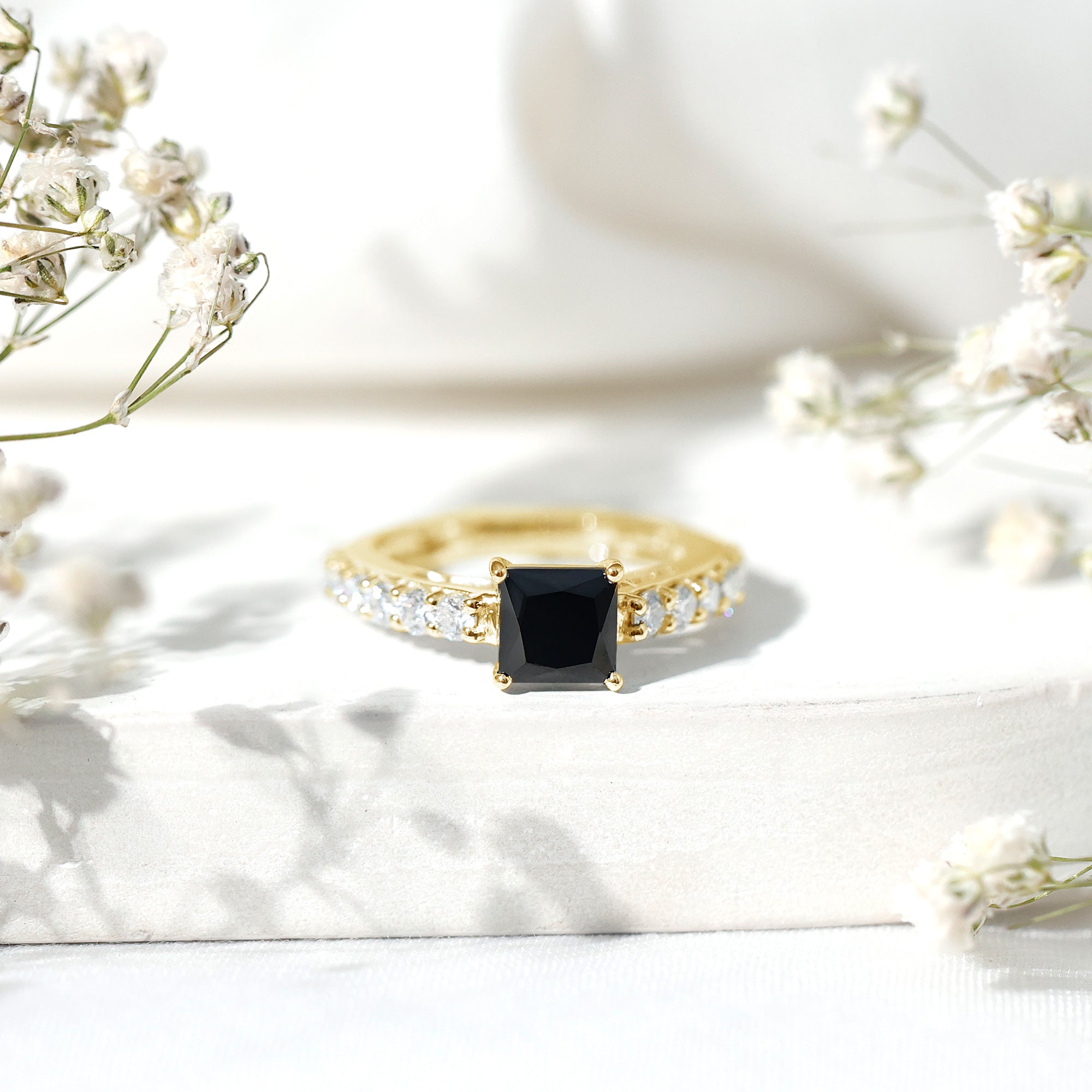 Feel like a princess and sparkle your charm with this lab created black diamond solitaire ring. The ring features a 7 MM princess cut lab created black diamond center stone surrounded by small sparkling moissanite encrusted over a hidden shank. The prong setting ensures the safety and durability of the center stone. This stunning piece is perfect for those who want to feel unique and beautiful.