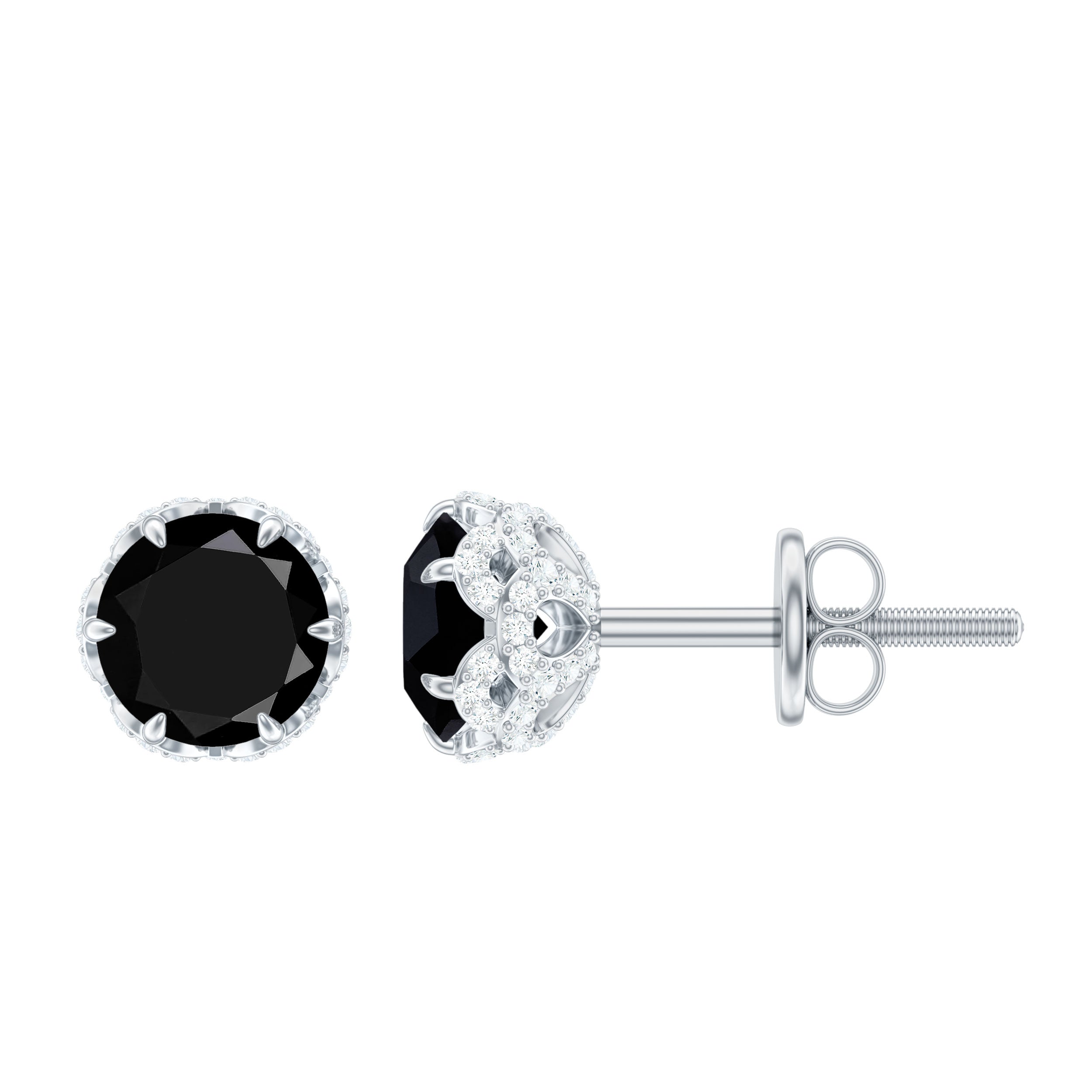 Delicate, charming, and full of character, the Lab Created Black Diamond Earrings bring a fresh and elegant touch to your jewelry collection. They feature 5 MM round cut lab created black diamond set securely in 6 claw prong setting, giving it just the right balance of sparkle and sophistication. The center stone is flanked by a floral design of glittering white diamonds, carefully arranged to resemble soft petals, adding a hint of romance to the overall design. The mix of the dark center and bright outer stones gives the Black Diamond Stud Earrings a graceful contrast that stands out beautifully in any setting. Thoughtfully crafted with fine attention to detail, they are made to last and offer a comfortable fit, thanks to their secure screw back closure. These Black and White Diamond Earrings are perfect for everyday wear or for adding a bit of sparkle to special occasions, from dinners and parties to meaningful celebrations. With their soft floral pattern and timeless shine, the Solitaire Stud Earrings make a thoughtful gift for someone special or a beautiful piece to treat yourself. They represent elegance, balance, and quiet confidence, qualities that make them easy to wear and hard to forget. Arriving in a premium jewelry box, ready for gifting, these floral earrings are a lovely addition to any collection.