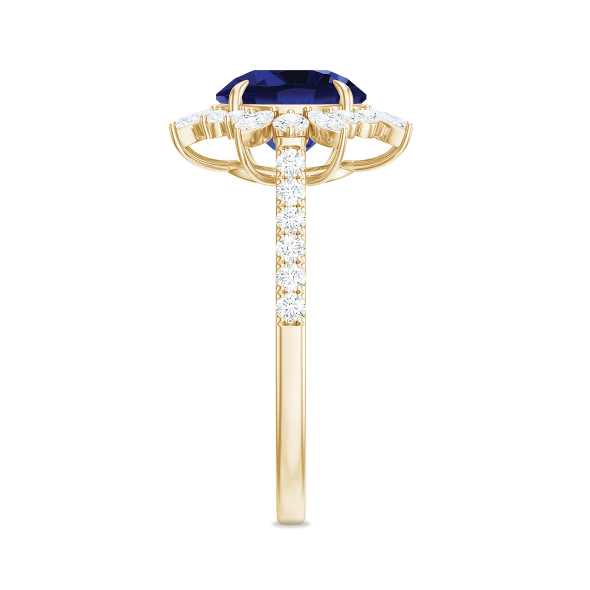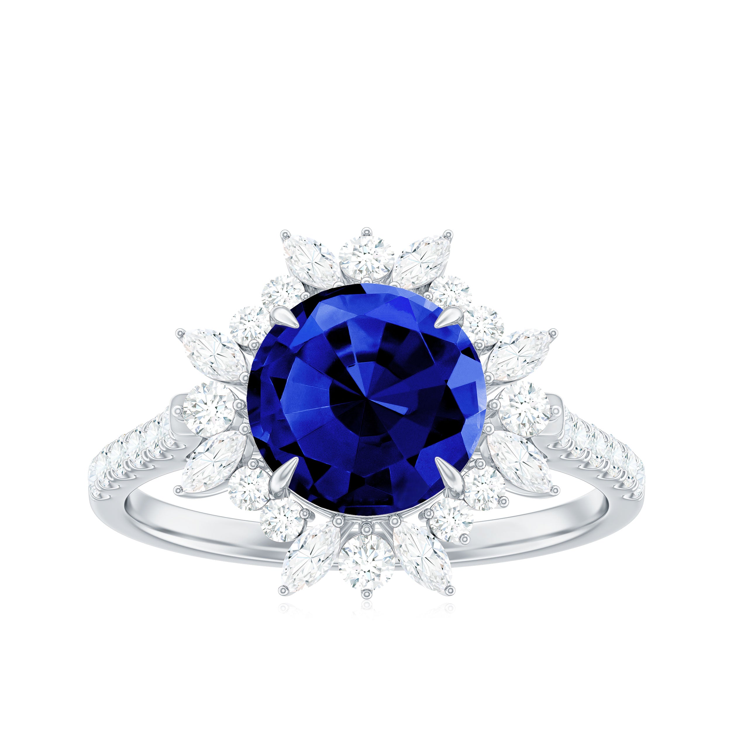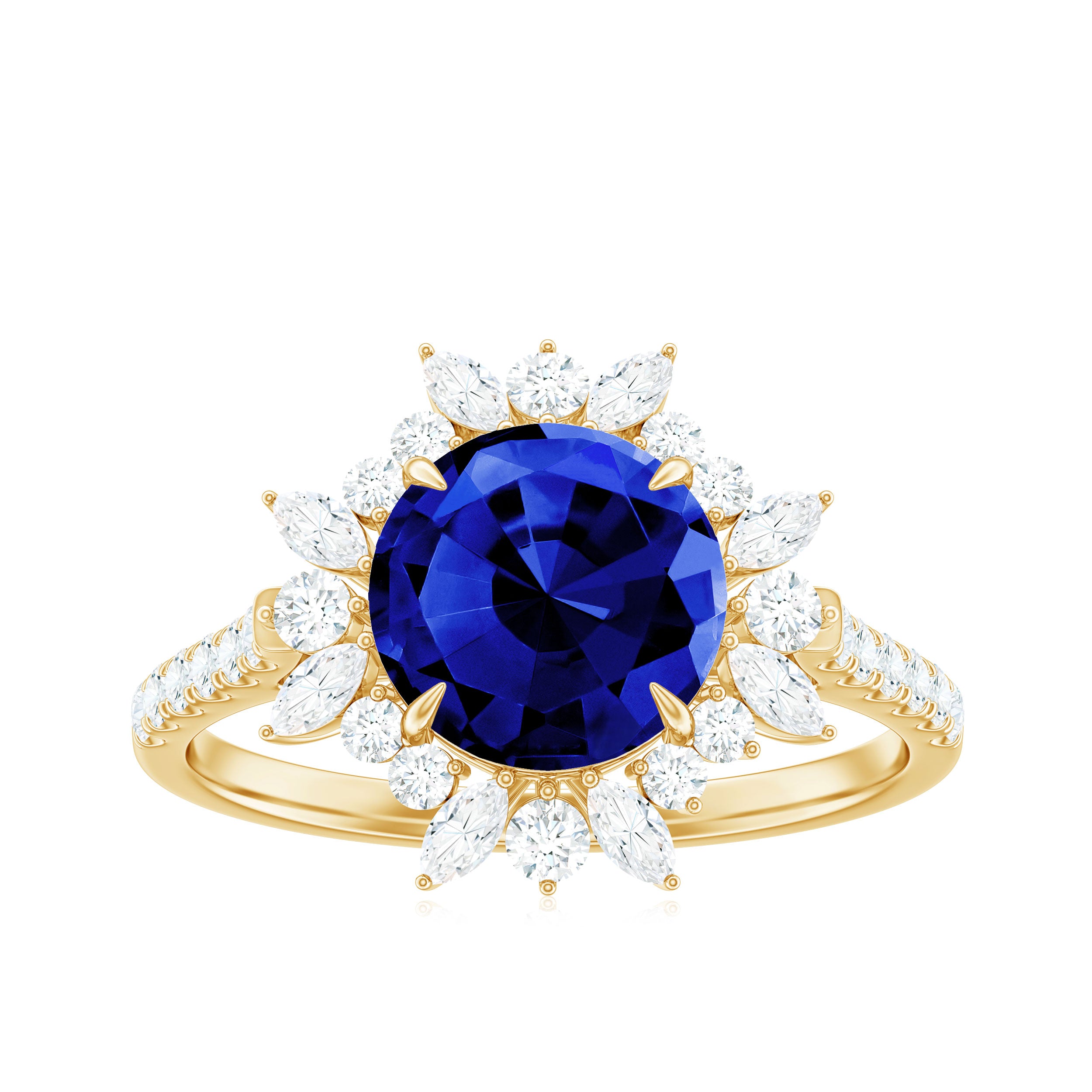This Lab Created Blue Sapphire and Diamond Ring is charming and enchanting. It features a Round Shape Lab Created Blue Sapphire surrounded by a Diamond floral halo. Made from Gold, this cocktail ring is a magnificent piece of jewelry that will complement your outfit perfectly.