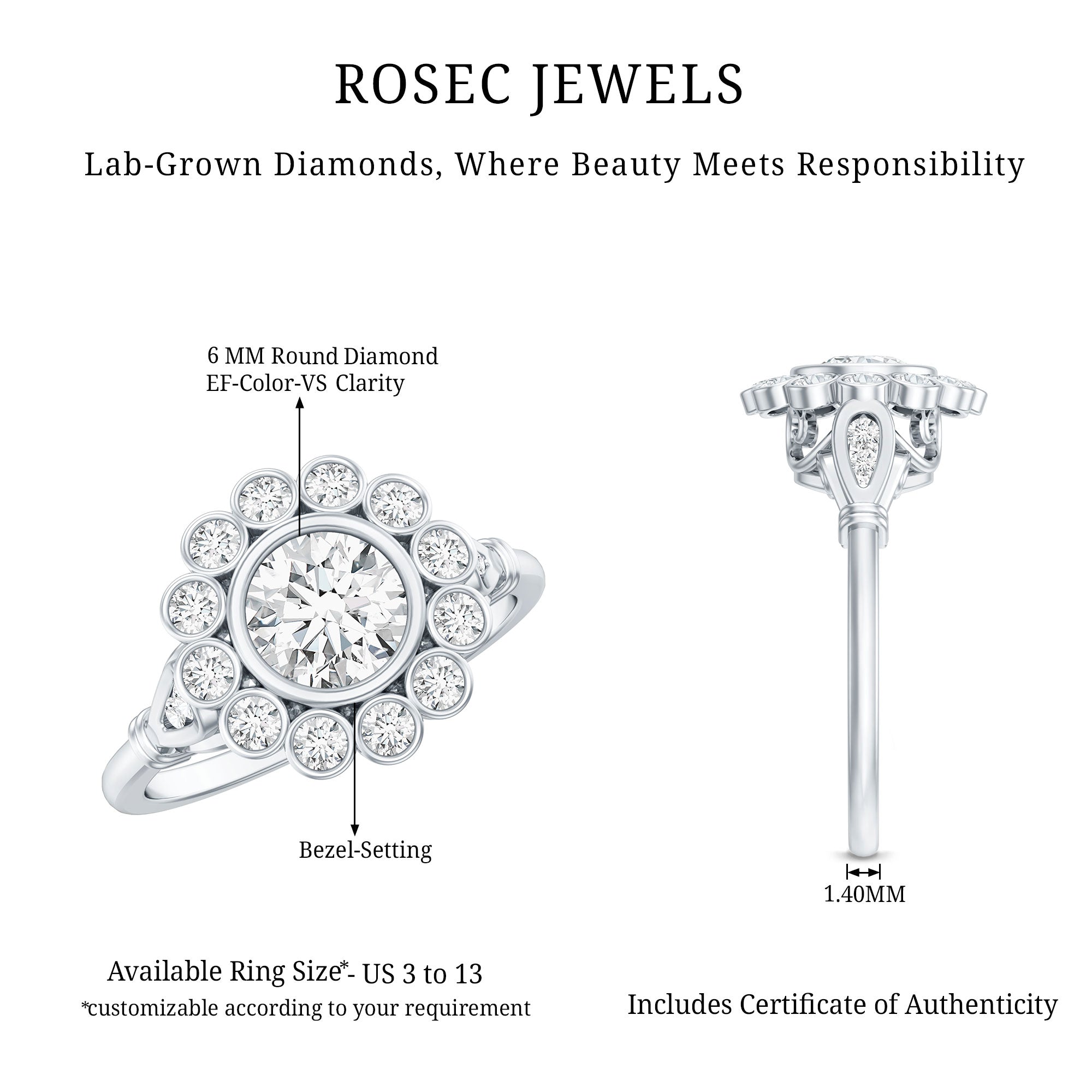 The round lab grown diamond is set in a bezel, creating a smooth outline that looks clean from every angle. Around it, a halo of smaller diamonds forms a floral silhouette that adds dimension and light without changing the ring’s overall balance. Vintage-inspired details beneath the center and accent stones along the band complete the look with added character.