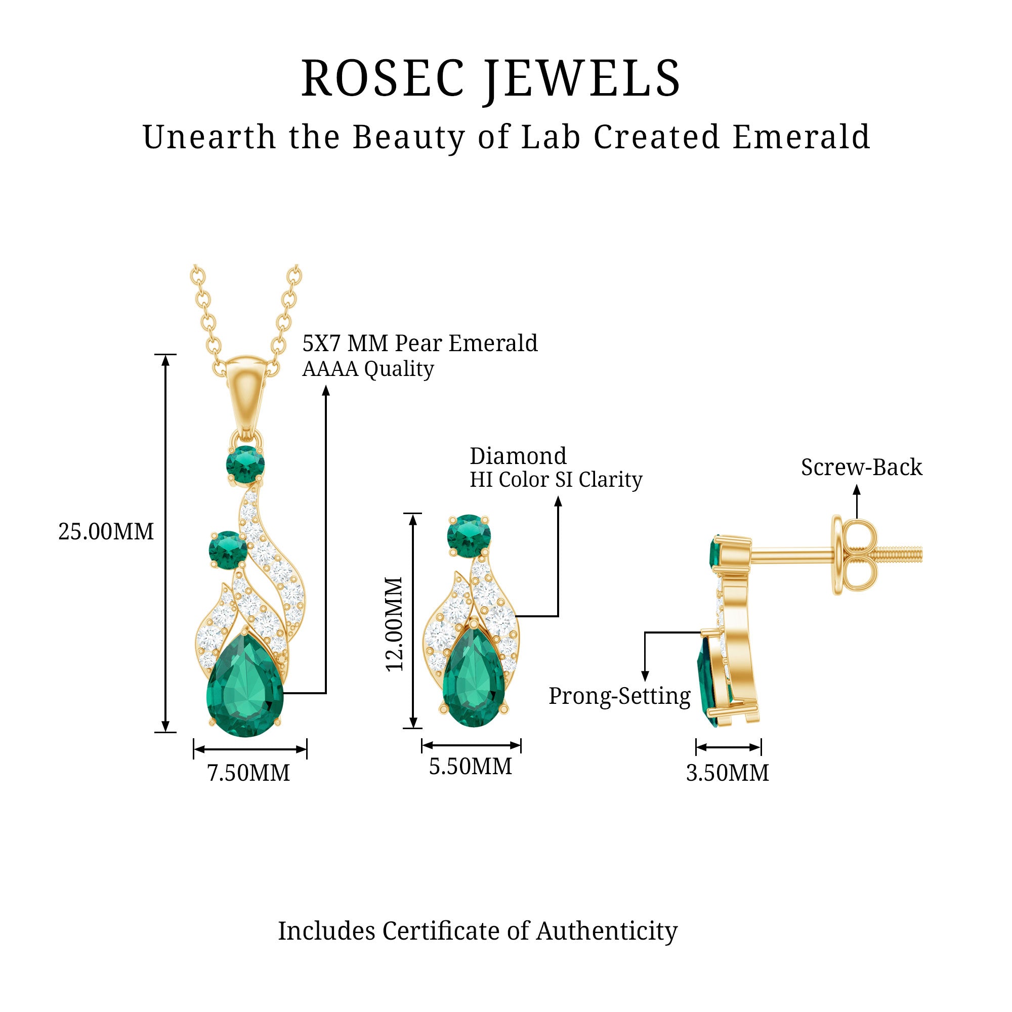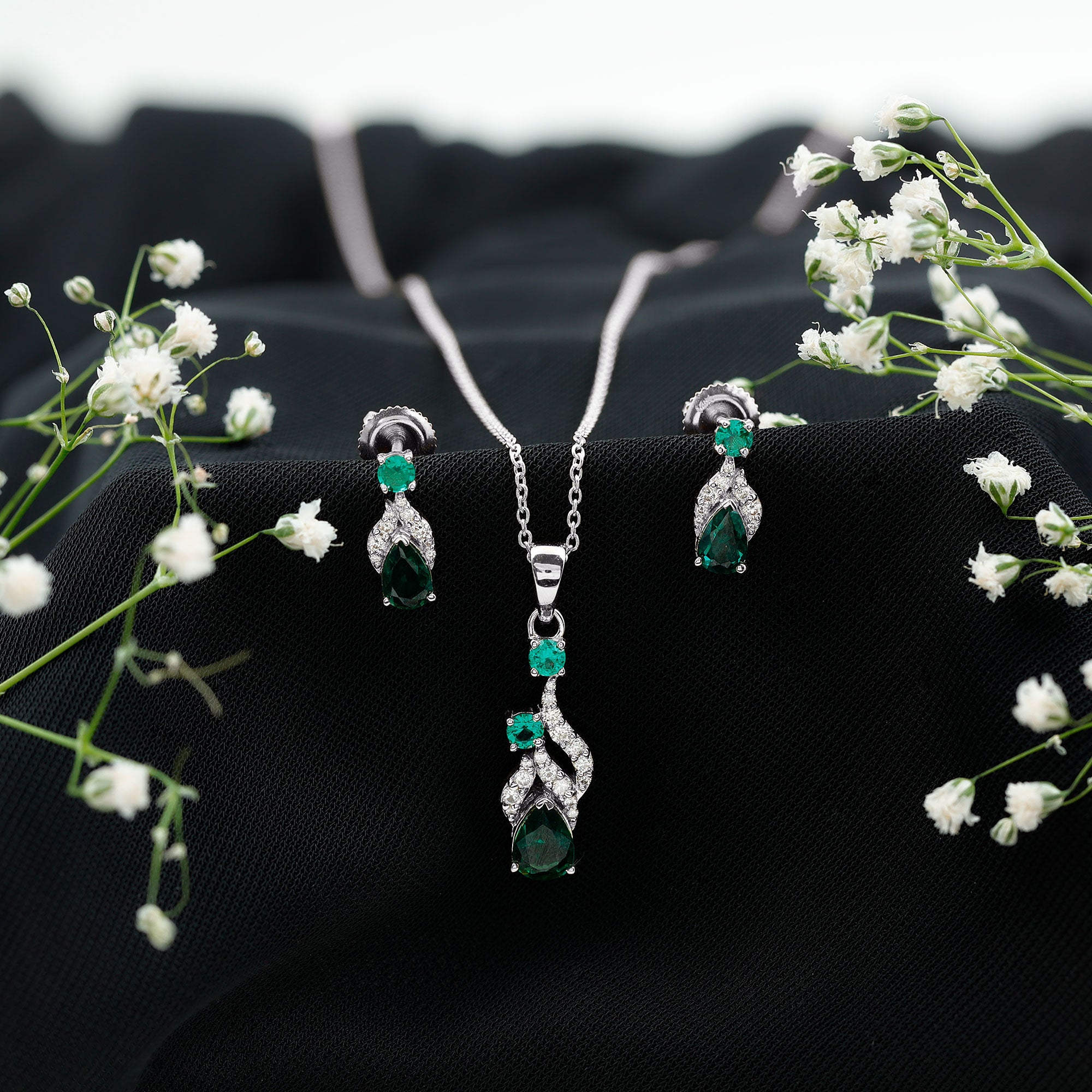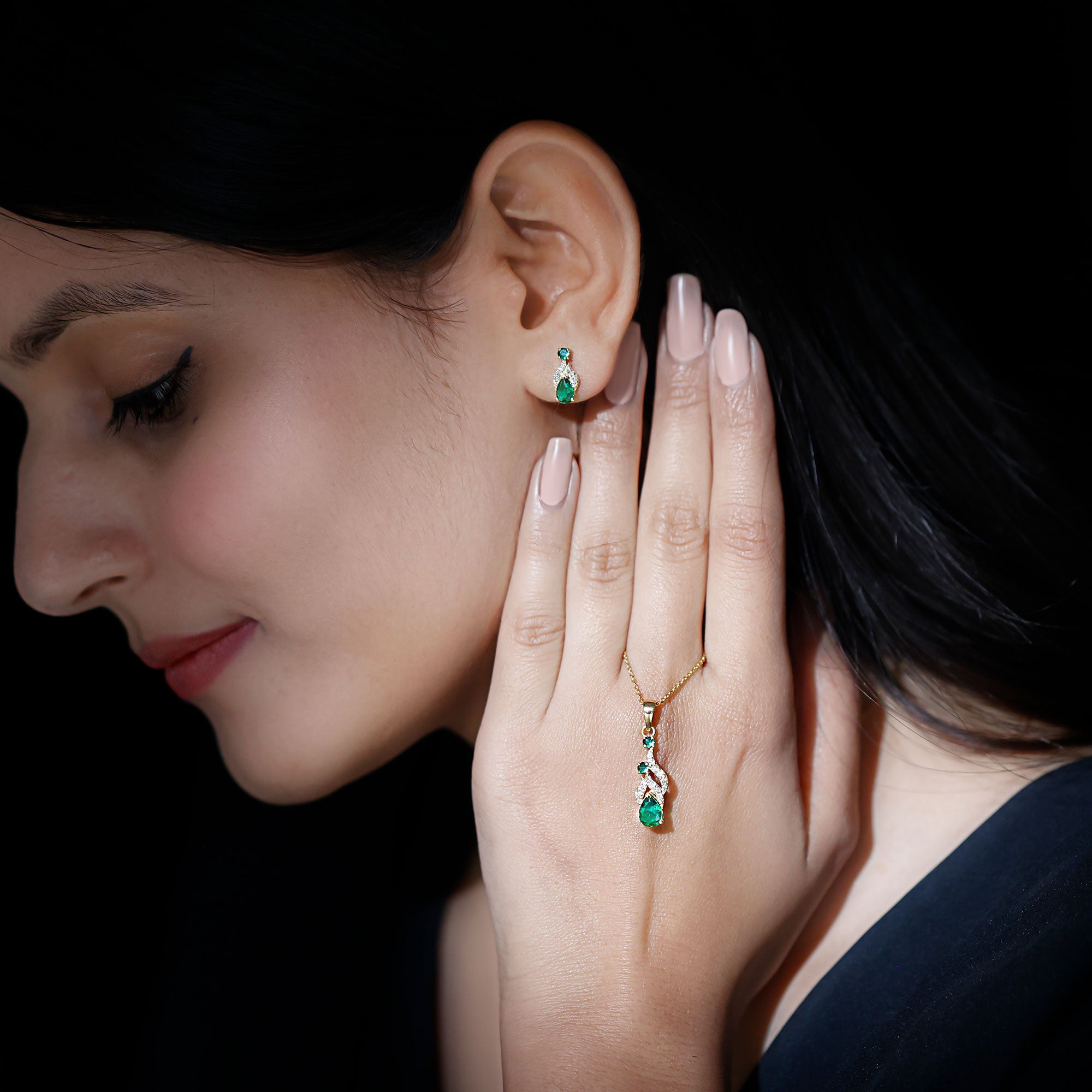 We know how you always need Jewelry to bring spark to those dull, lazy days and so we bring this Emerald and Diamond Jewelry Set. Crafted with precision and care, the Emerald Jewelry Set includes a stunning pendant necklace and matching stud earrings, perfect for both special occasions and everyday elegance. The necklace features a 5X7MM pear shaped lab created emerald as its centerpiece, securely set in prong setting. Flanking the emerald are sparkling round diamond stones with round cut lab created emeralds, creating a harmonious designer pattern that is both natural and stylish. The pendant hangs gracefully from a durable cable chain via a standard bail, resting beautifully on the neckline. The matching stud earrings are equally captivating, each featuring a 4X6 MM lab created emerald accented with delicate diamond stones. Screw-back closures ensure comfort and security, making them ideal for all-day wear without worry. Crafted from AAAA quality lab created emeralds and HI-SI-quality diamonds, the Designer Necklace Set offers a striking contrast that draws the eye and adds sophistication to any ensemble. Versatile and timeless, the Necklace and Earrings Set can be worn together for a coordinated statement or separately for subtle elegance.