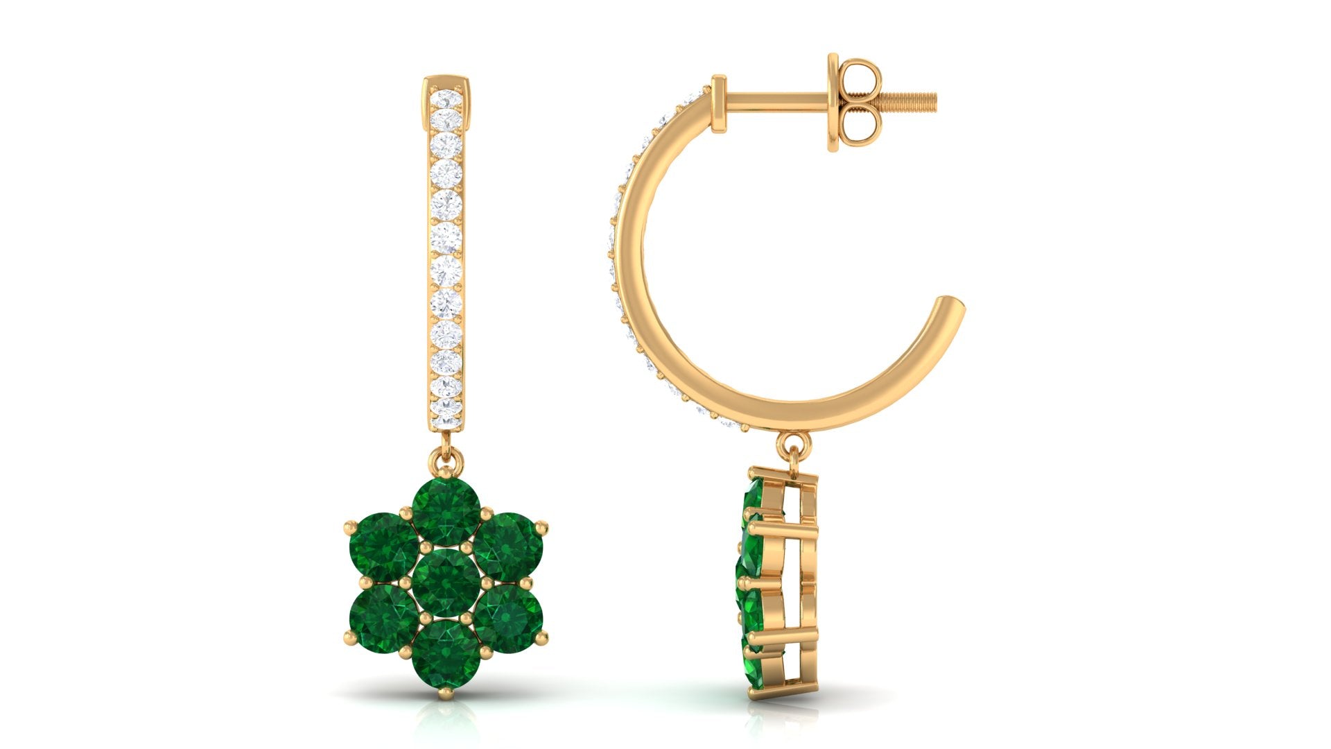 Inspired by the elegance of nature, these Emerald Flower Earrings capture the charm of blooming flowers. The earring features a delicate flower cluster of round cut Lab Created Emerald stones which is hanging from a sleek half hoop adorned with shimmering Diamonds. The flower drop design adds movement and sparkle with every turn. The Diamonds are carefully set to enhance the rich green tones of the Emeralds, creating a stunning contrast that catches the light beautifully. Designed with elegance and comfort in mind, these Emerald and Diamond Hoop Earrings come with a secure screw back closure, ensuring a perfect fit for long hours of wear. Whether paired with a classic gown or a modern ensemble, they effortlessly elevate any outfit with their timeless charm and glamour. The Emerald Drop Earrings are perfect for special occasions, from weddings and parties to anniversaries and celebrations, or simply as a meaningful gift for someone who loves the beauty of nature. With their floral inspiration and exquisite craftsmanship, these Half Hoop Earrings are a true reflection of elegance and grace, making every moment you wear them feel as special as a blooming flower in spring.