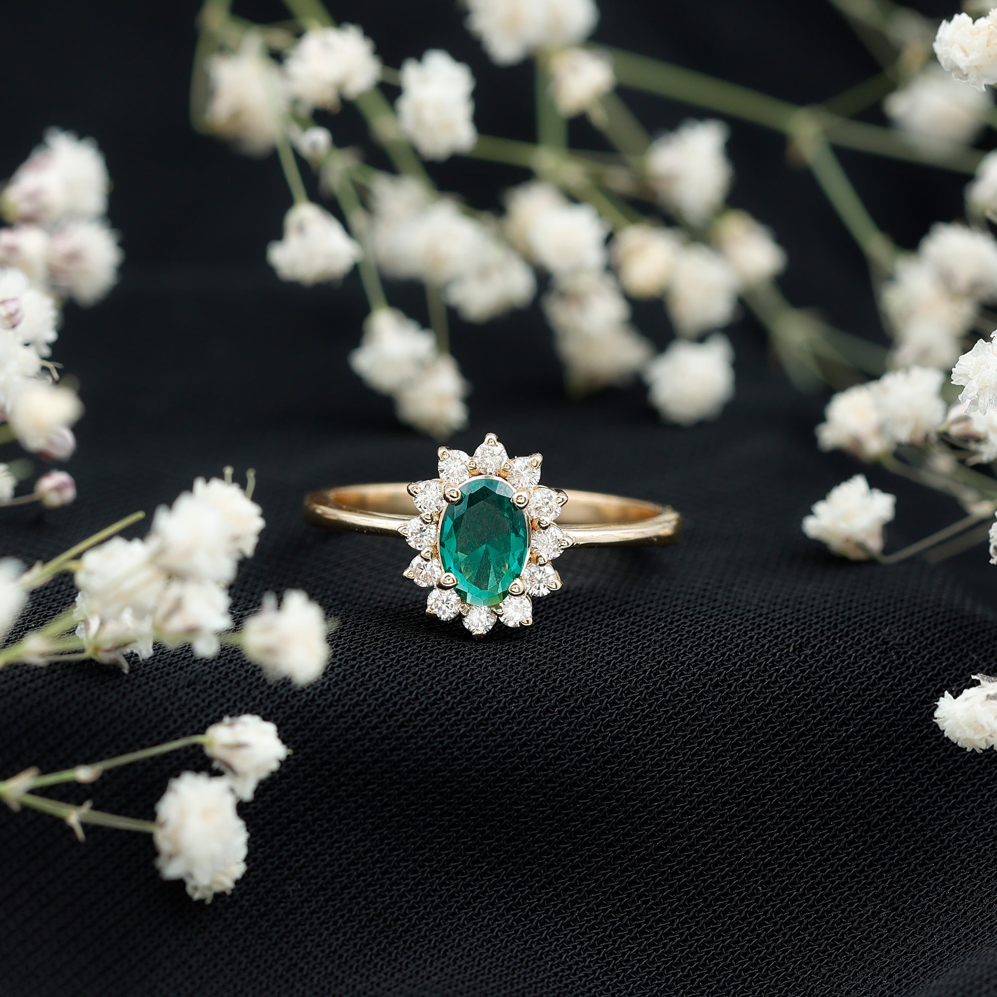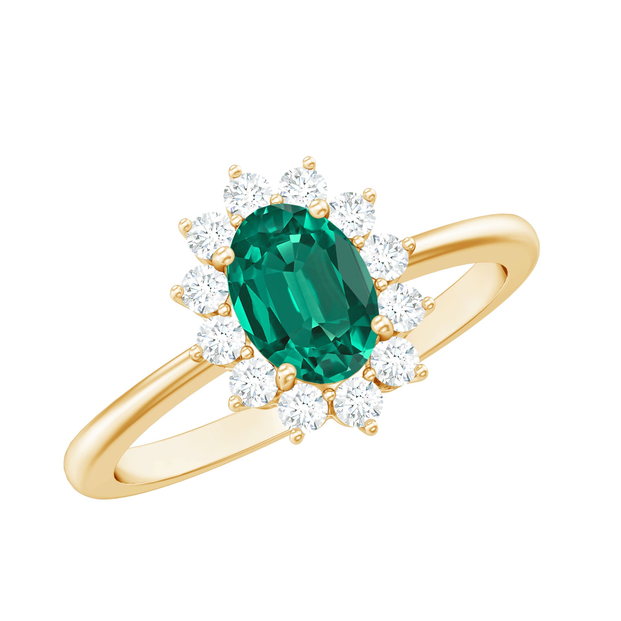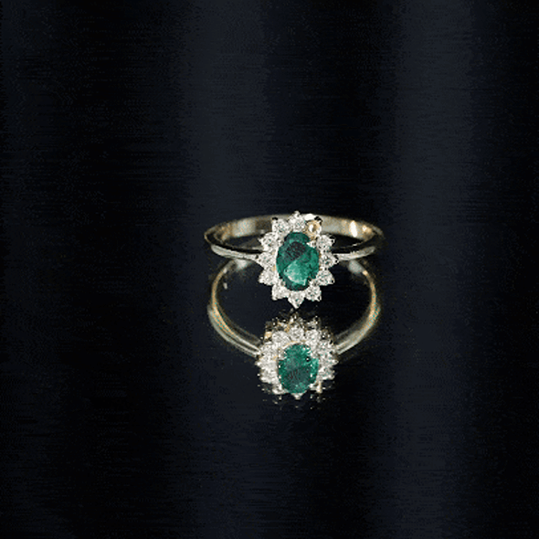 The ring features a halo setting where the central gemstone is encircled by smaller diamonds. This arrangement emphasizes the beauty of the emerald while creating a balanced and visually striking composition.