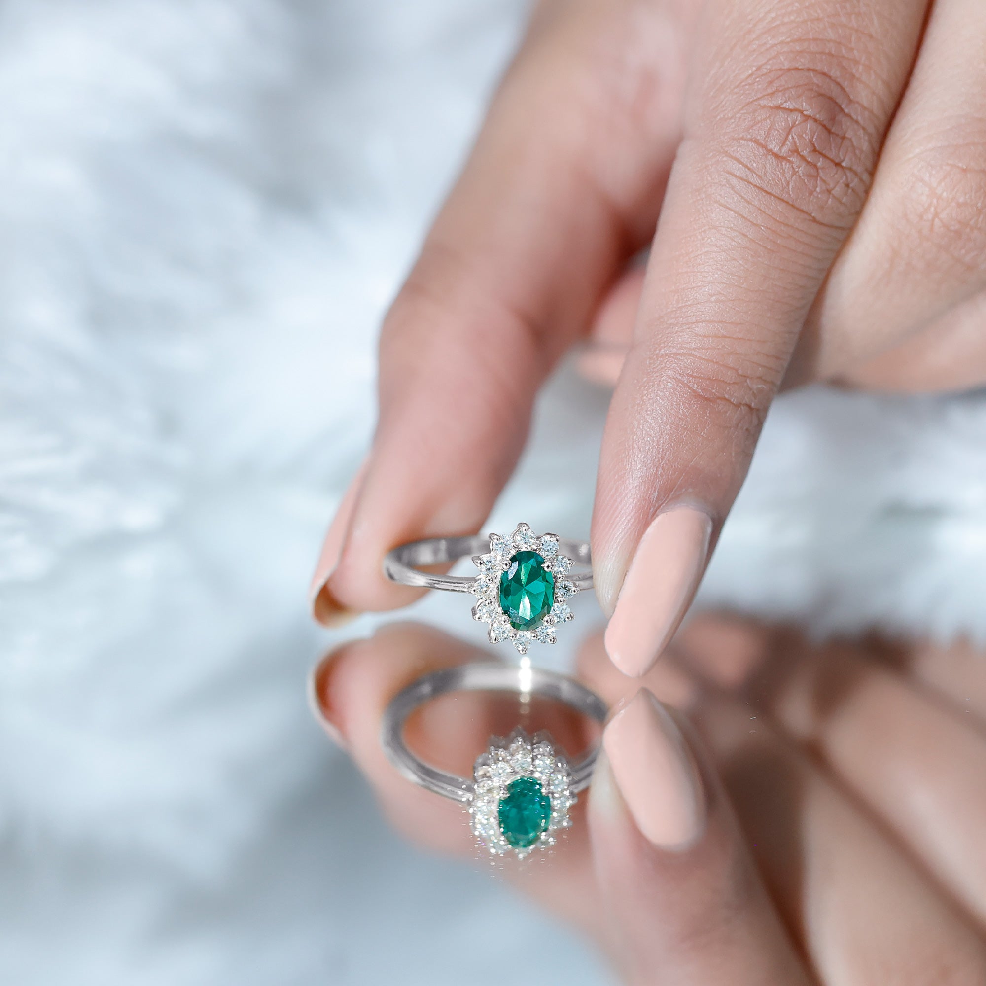 Engagement rings often represent lasting commitment and memorable milestones. The combination of a vibrant emerald center stone and a surrounding diamond halo creates a piece that feels both meaningful and visually refined.