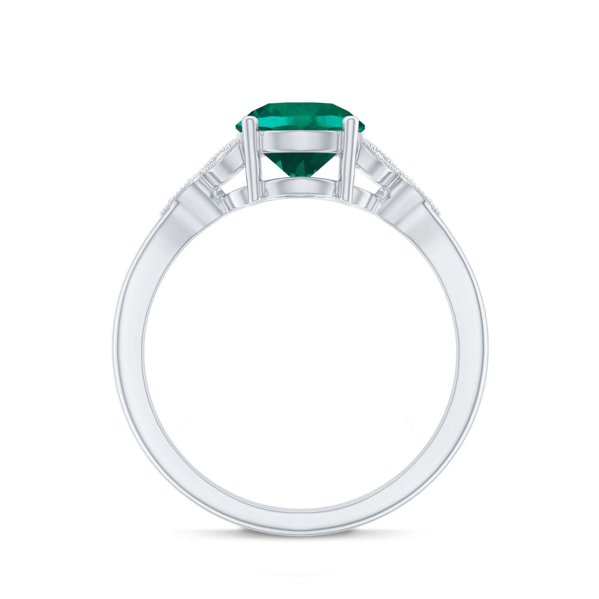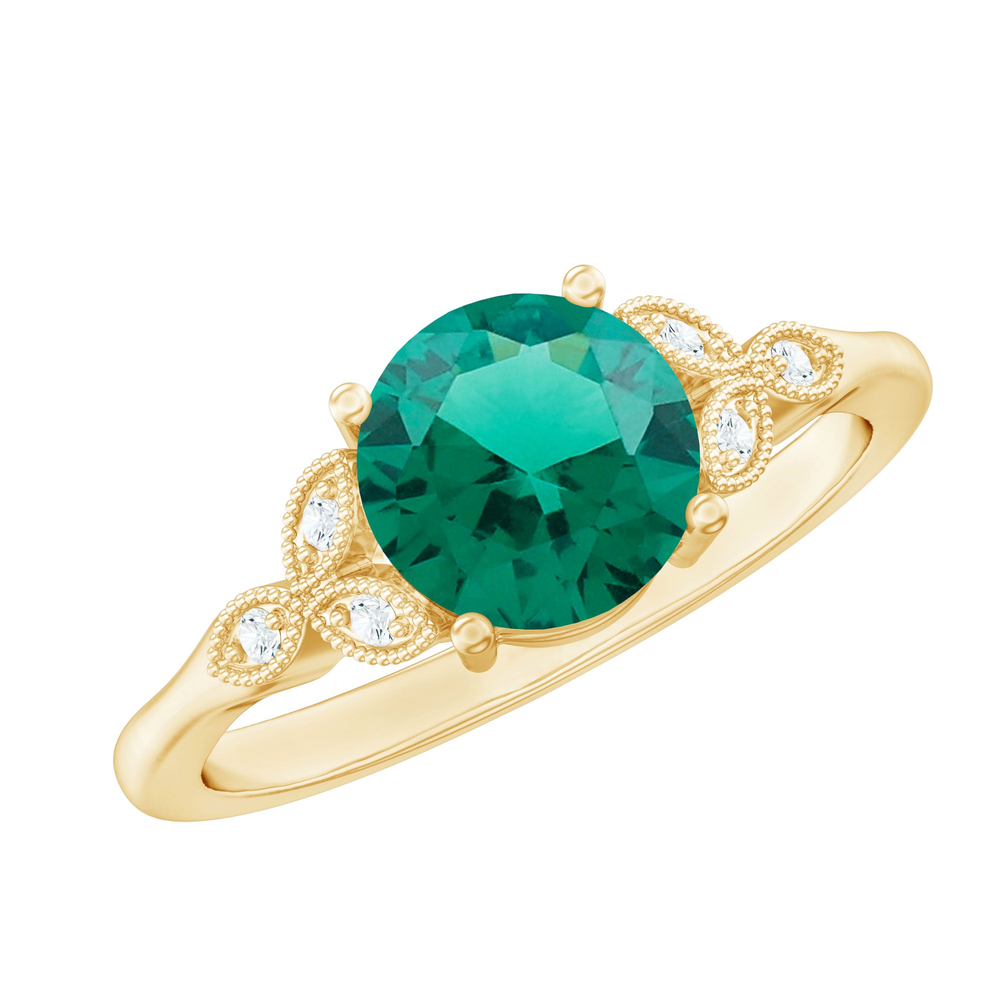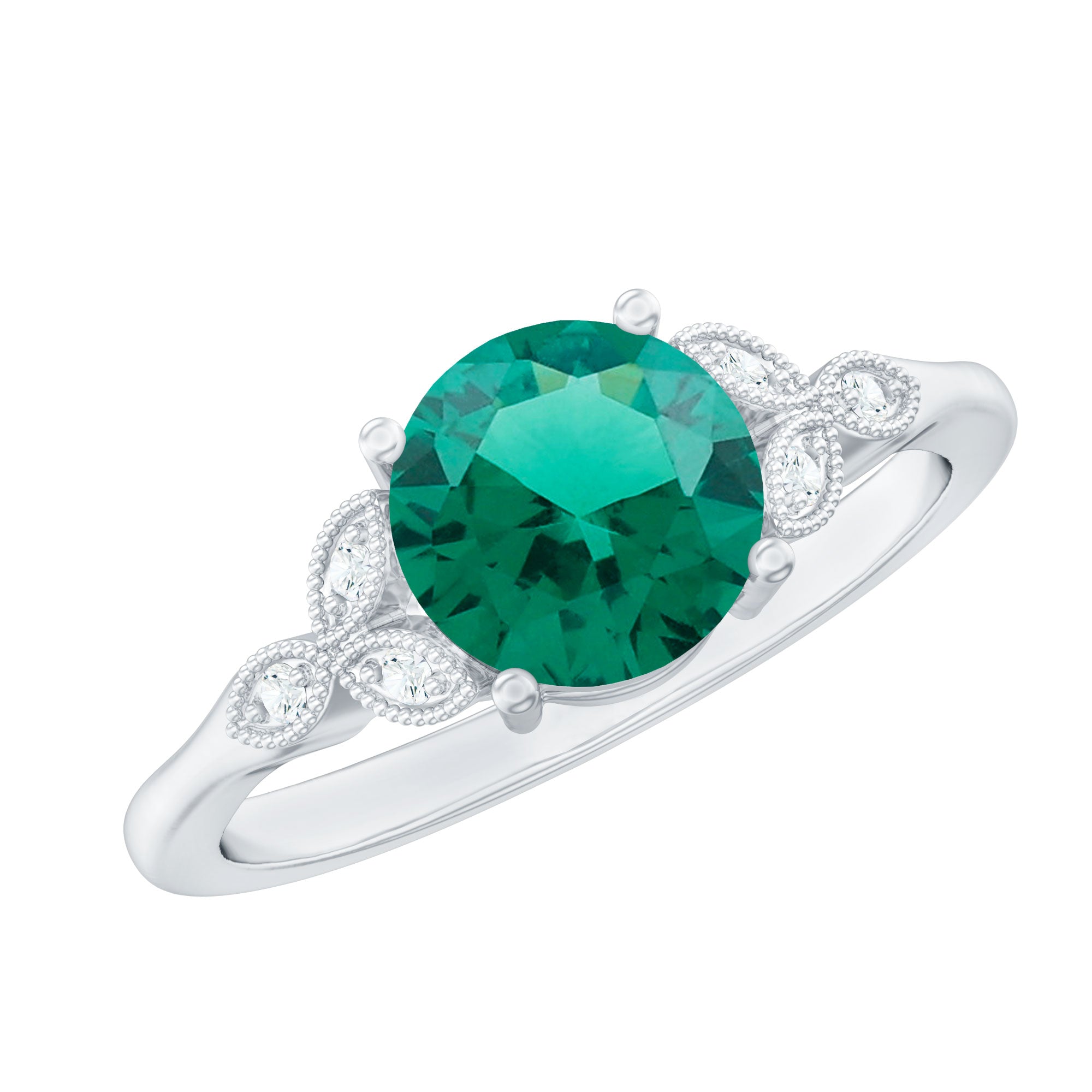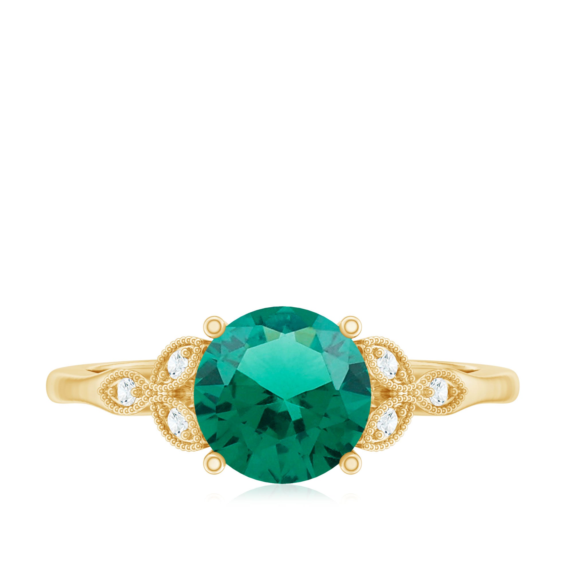 Indulge in timeless elegance with this Solitaire Engagement Ring. A mesmerizing 8 mm Round Shape Lab Emerald takes center stage, exuding rich green allure. The exquisite Lab Grown Diamond Trio and Beaded Detailing enhances the sophistication of this Emerald Ring (Synthetic), while the impeccable craftsmanship ensures lasting beauty. Meticulously designed by Aaaa Quality Emerald and Ef-Vs Quality Diamonds, this piece seamlessly combines modernity with tradition.