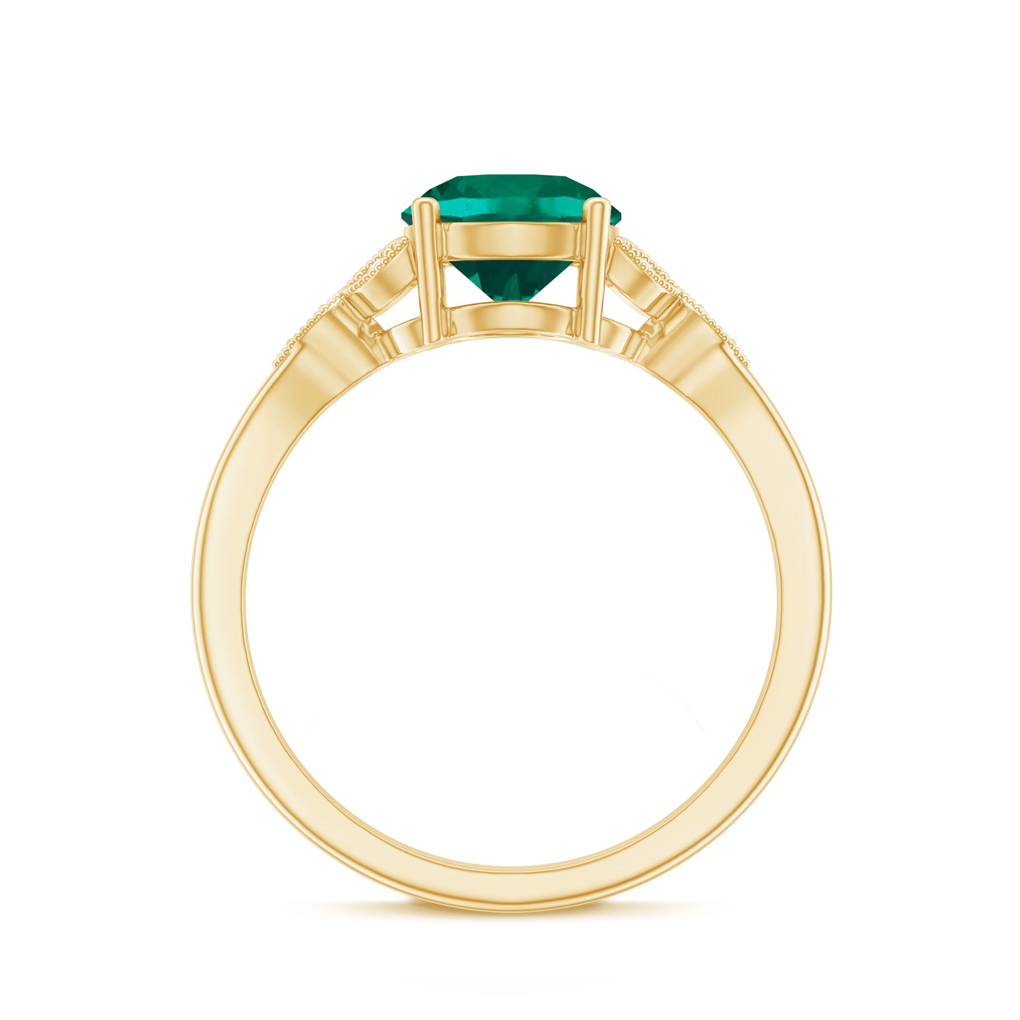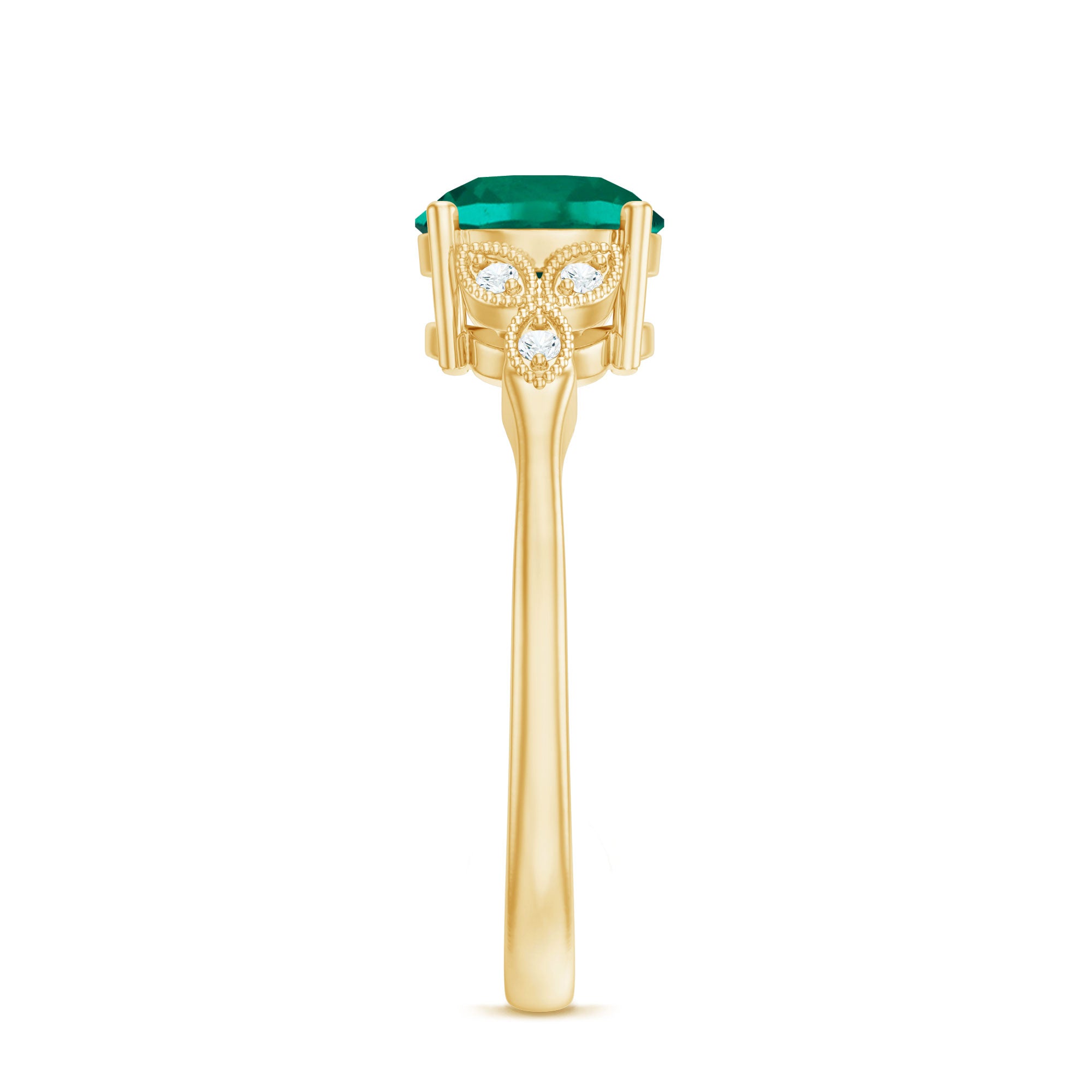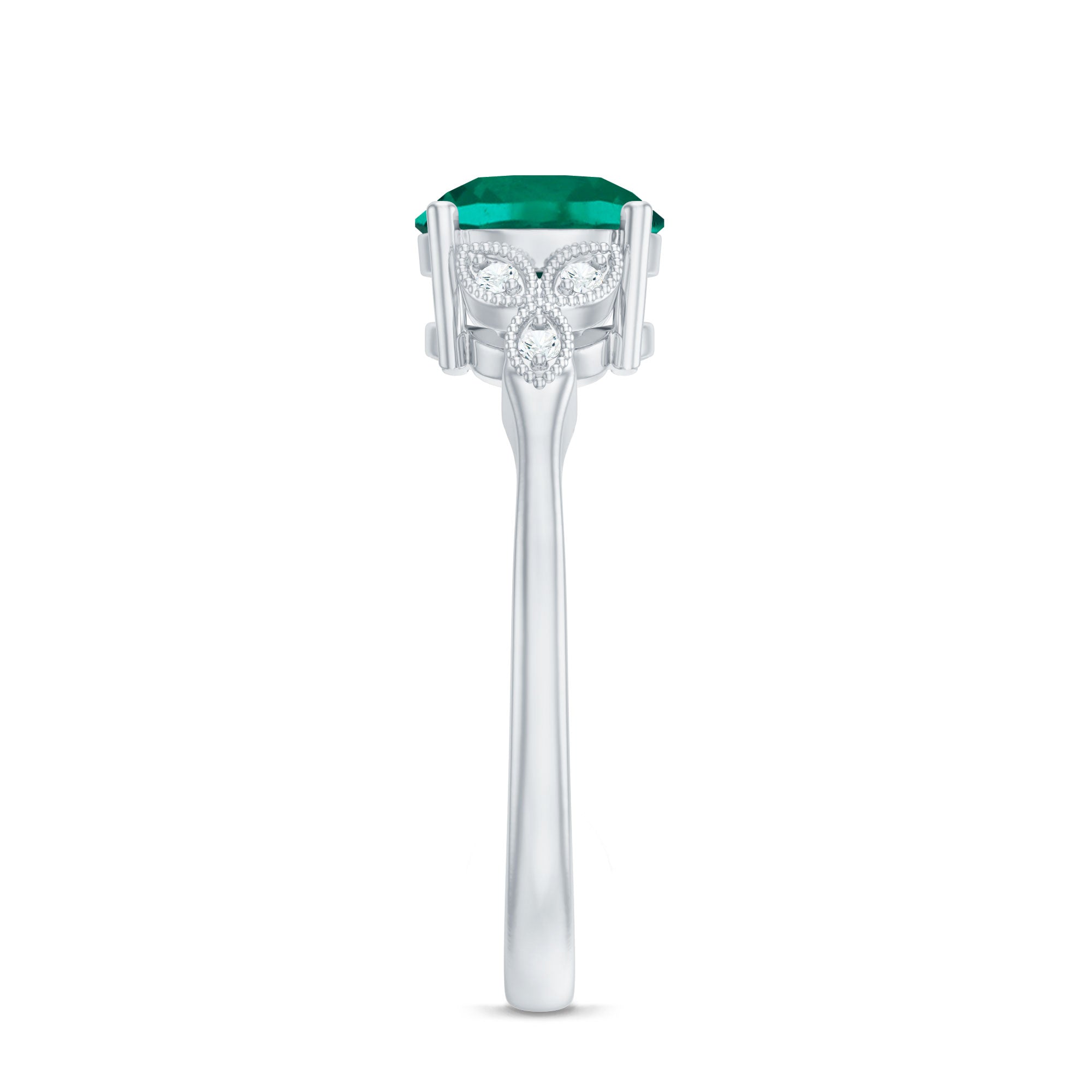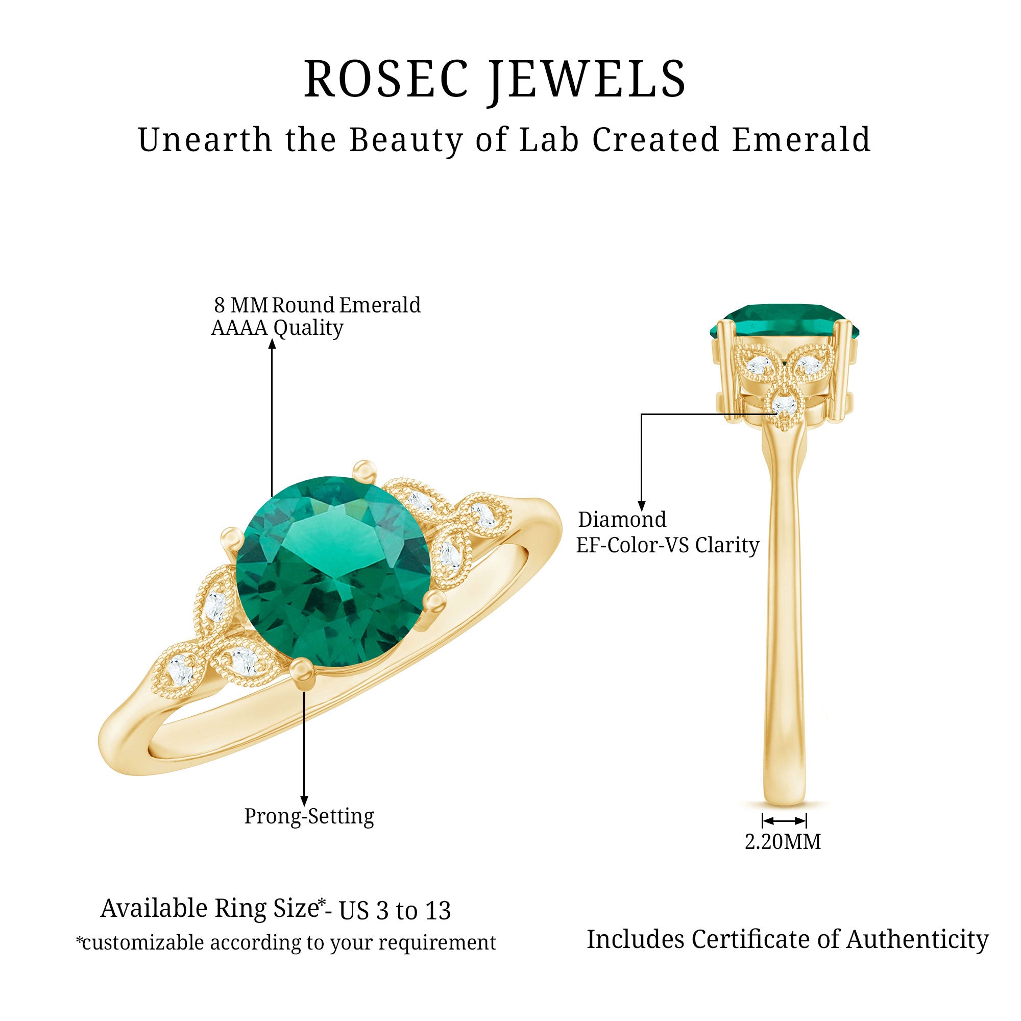 Indulge in timeless elegance with this Solitaire Engagement Ring. A mesmerizing 8 mm Round Shape Lab Emerald takes center stage, exuding rich green allure. The exquisite Lab Grown Diamond Trio and Beaded Detailing enhances the sophistication of this Emerald Ring (Synthetic), while the impeccable craftsmanship ensures lasting beauty. Meticulously designed by Aaaa Quality Emerald and Ef-Vs Quality Diamonds, this piece seamlessly combines modernity with tradition.