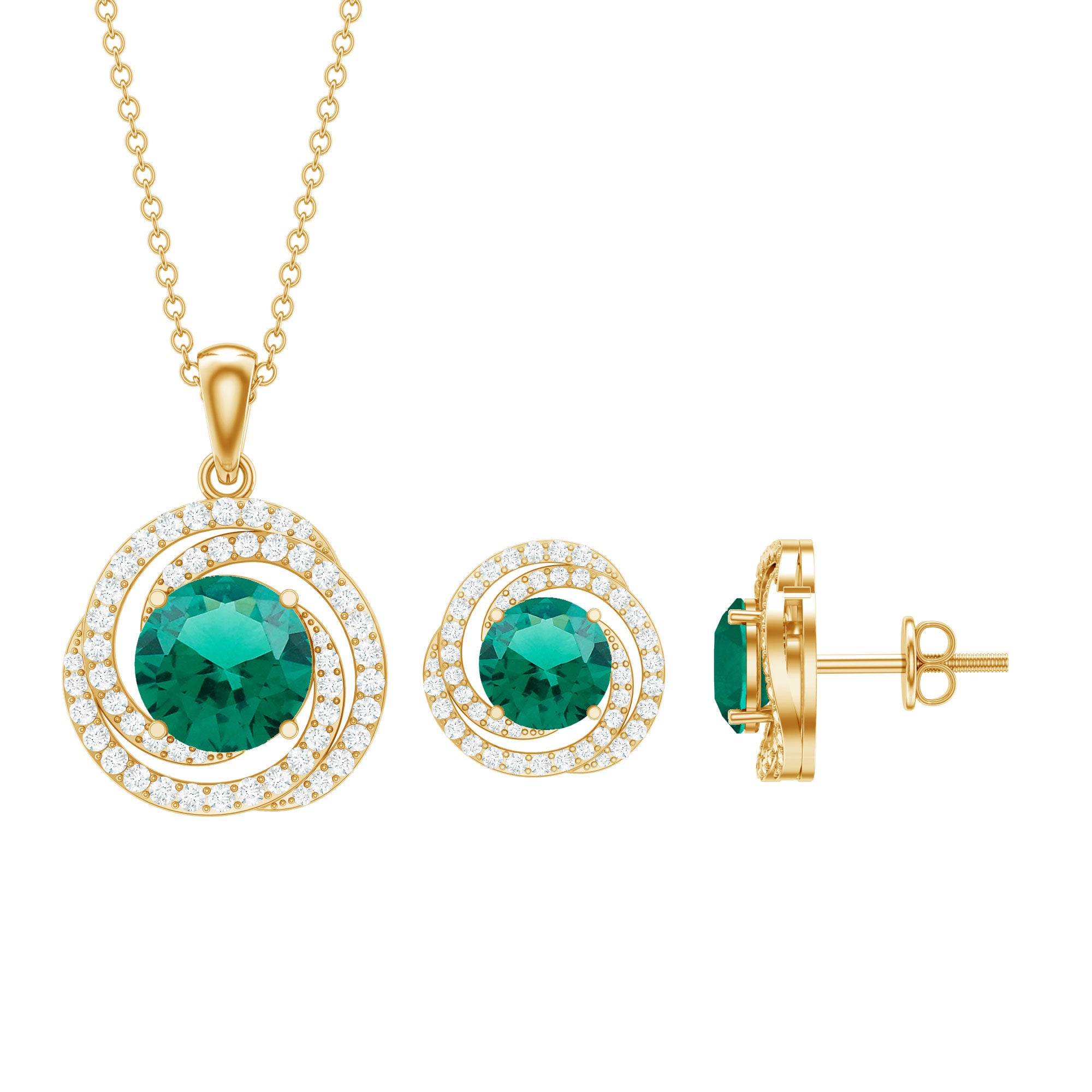 Make a sophisticated statement when you wear this Emerald Jewelry Set that adds a touch of elegance to your overall look. The pendant and earrings set features round created emerald set in the swirl pattern that dazzles with round petite moissanite making this jewelry set eye-catching. The magnificent allure of this swirl jewelry set and the AAAA quality of lab emeralds have made it truly exceptional and highly durable. Whether for a wedding, an evening event, or simply to bring elegance to your everyday wear, this Emerald Necklace and Earrings add a refined sparkle to your collection. Beautiful and easy to wear, this Emerald and Moissanite Necklace Set captures the essence of natural charm. It makes a thoughtful gift for someone special or a lovely treat for yourself to treasure and wear with confidence.