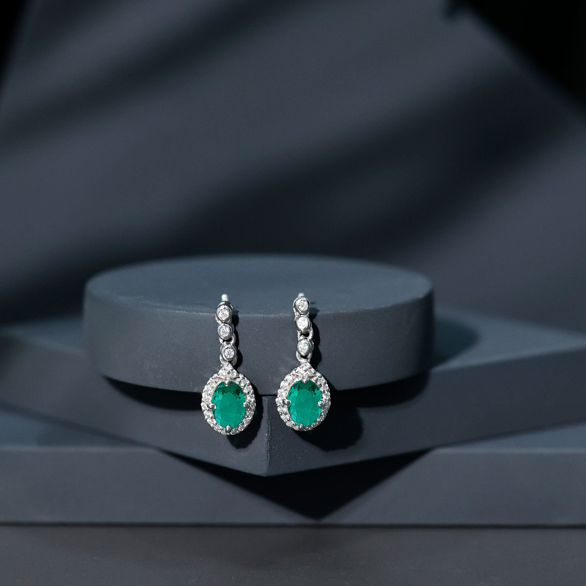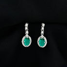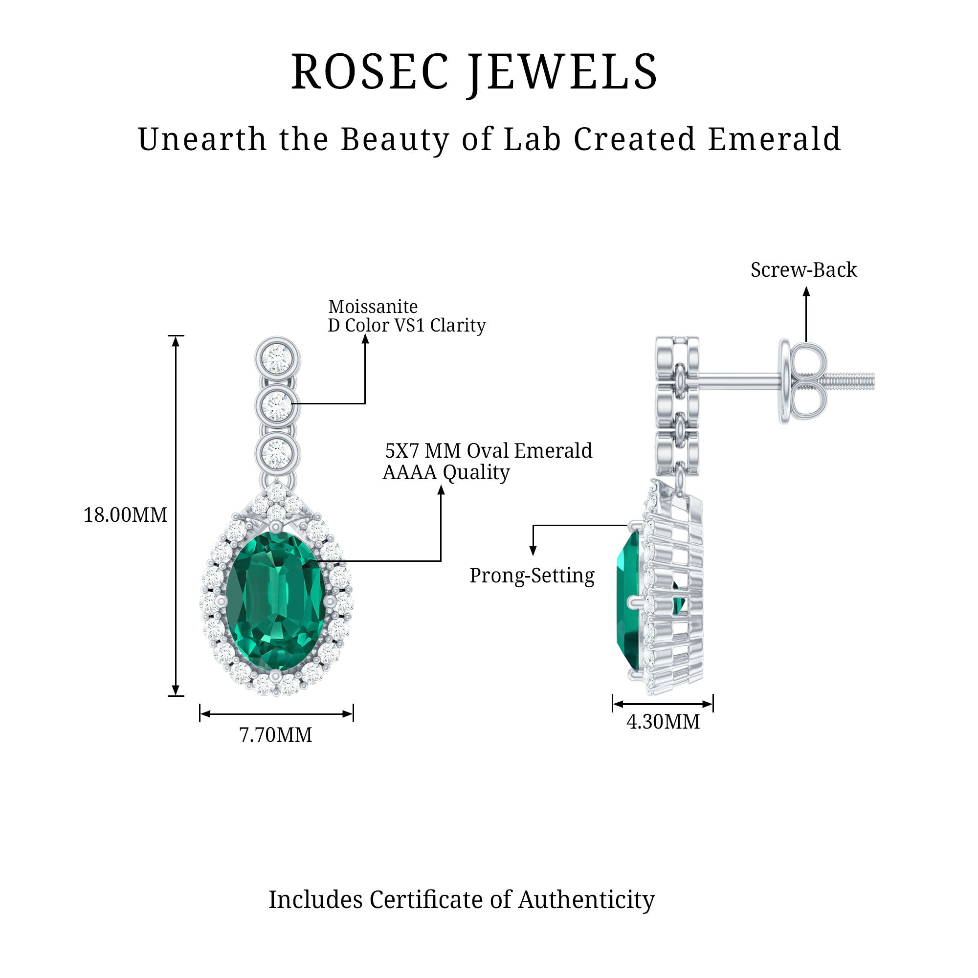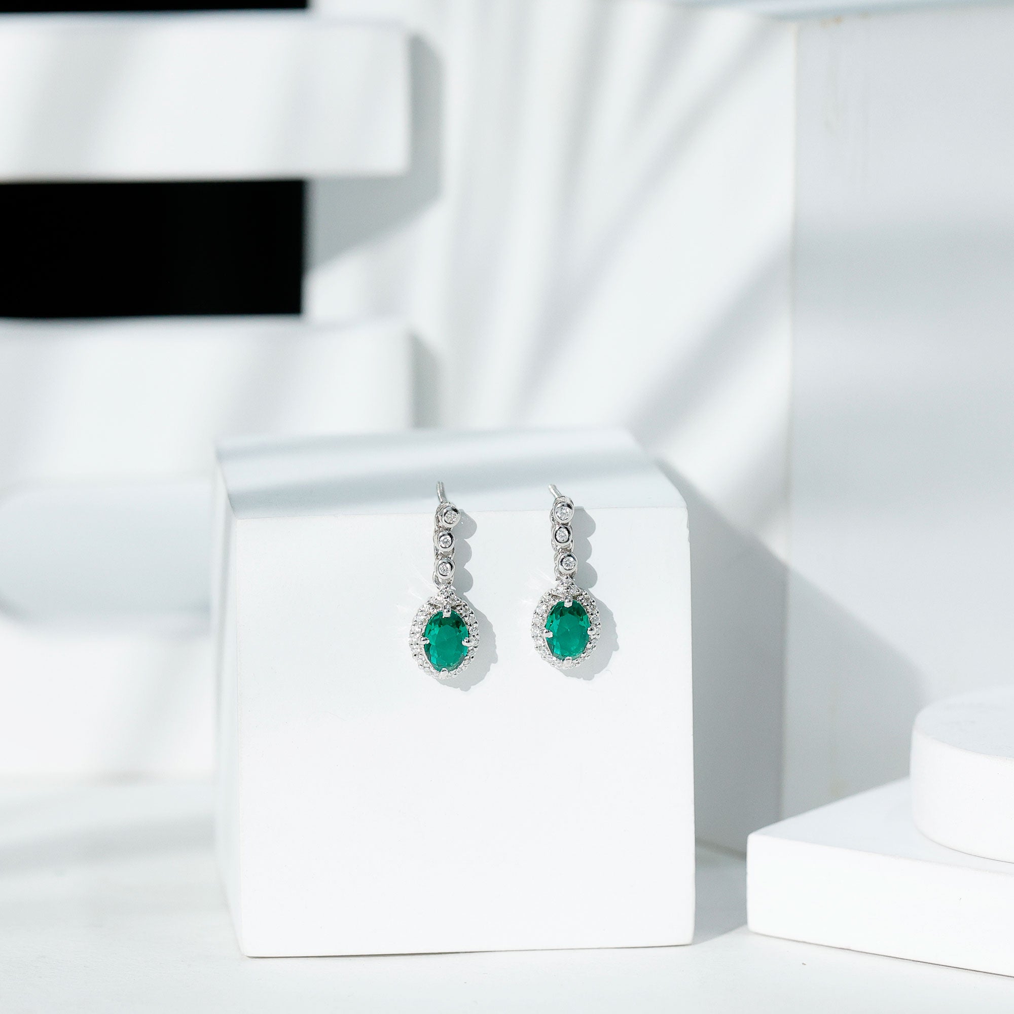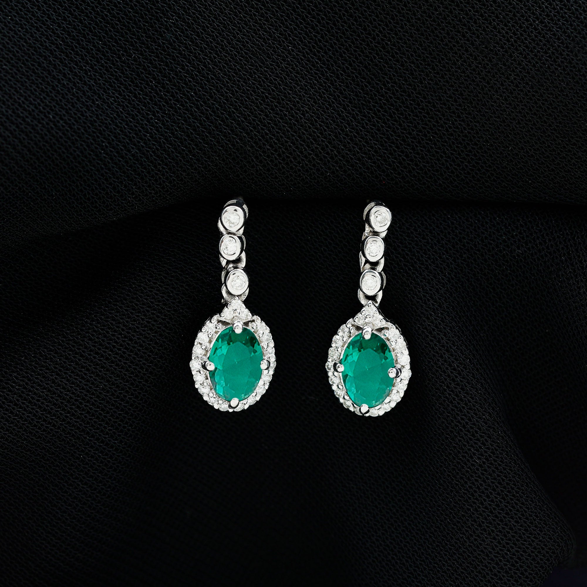 These vintage-inspired Lab Grown Emerald Vintage Earrings are a beloved piece of jewelry, making them perfect for your wedding day. As breathtaking Wedding Earrings For Bride, they are sure to dazzle with their timeless and subtle sparkle. The vibrant burst of color from the AAAA quality lab-created emerald and D-VS1 quality Moissanite creates a striking effect, ideal for the bride desiring a bold look. Crafted from white gold plated silver, these Drop Earrings feature a 5X7 MM oval-shaped lab emerald in a prong setting, surrounded by a halo of round cut moissanite and accented by three bezel set moissanite stones at the top. These gorgeous Emerald Drop Earrings are the ultimate bridal accessory, secured with a Screw back closure. The exquisite craftsmanship and skilled artisanship have made these drop-style earrings effortlessly chic, showcasing a subtle glamour that enhances bridal sophistication and elegance. They are guaranteed to add a vibrant touch to your outfit.