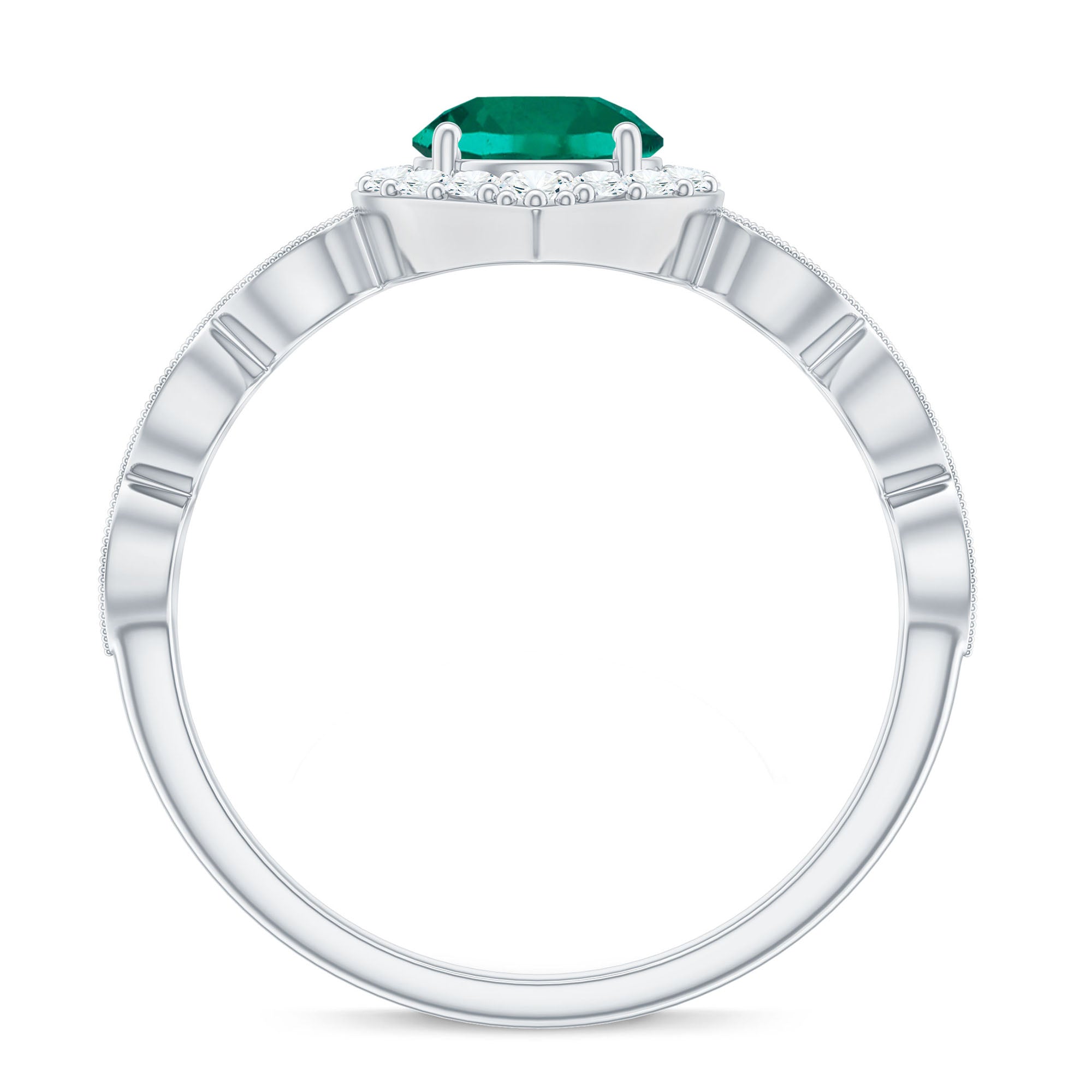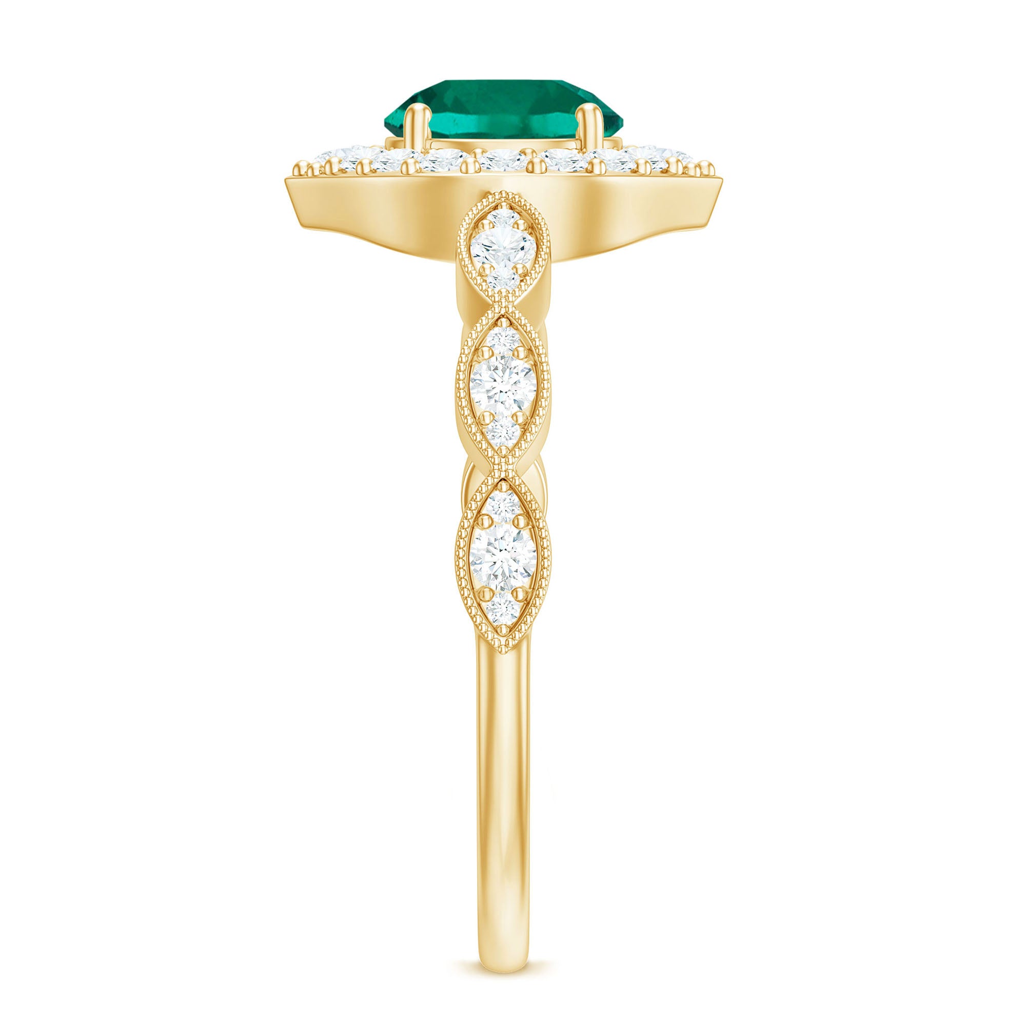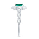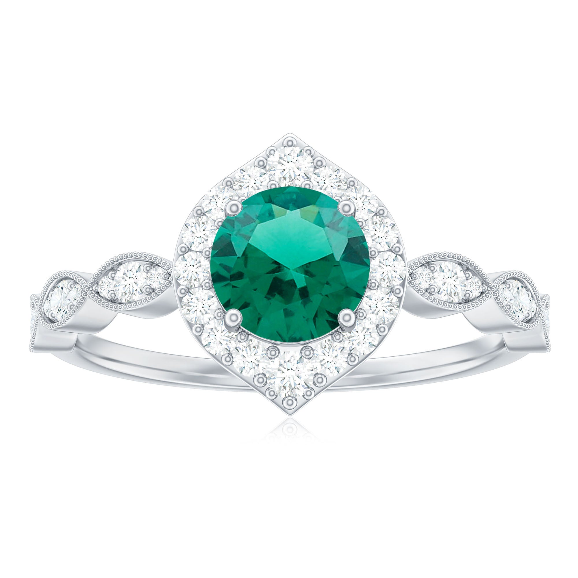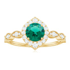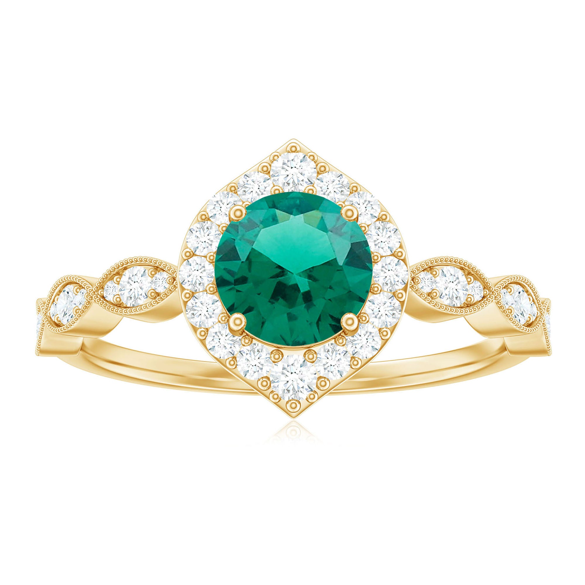 Express your profound feelings of love and affection by gifting your beloved this Vintage Inspired Emerald Engagement Ring. This stunning Antique Looking Ring features a vibrant 6 MM Round Shape Lab Created Emerald at the center, radiating its beautiful green hue, and surrounded by an exquisite Round Shape Diamond Halo. Additional diamonds are placed in a delicate scalloped pattern band, and fine milgrain detailing along the edges gives the piece a vintage inspired look. Crafted from AAAA quality lab grown emerald and HI-SI quality diamonds, this Halo Engagement Ring is a perfect fit for women who appreciate antique and artistic jewelry. Its intricate design and vintage-inspired aesthetic make it a truly unique piece that your partner will cherish for a lifetime. Whether you are marking a birthday, anniversary, engagement, or simply giving a thoughtful gift, this design fits any meaningful occasion. Lightweight and comfortable to wear, this Emerald and Diamond Ring has a simple yet eye-catching look. Its classic shape and quality craftsmanship make it a piece you will enjoy for years.