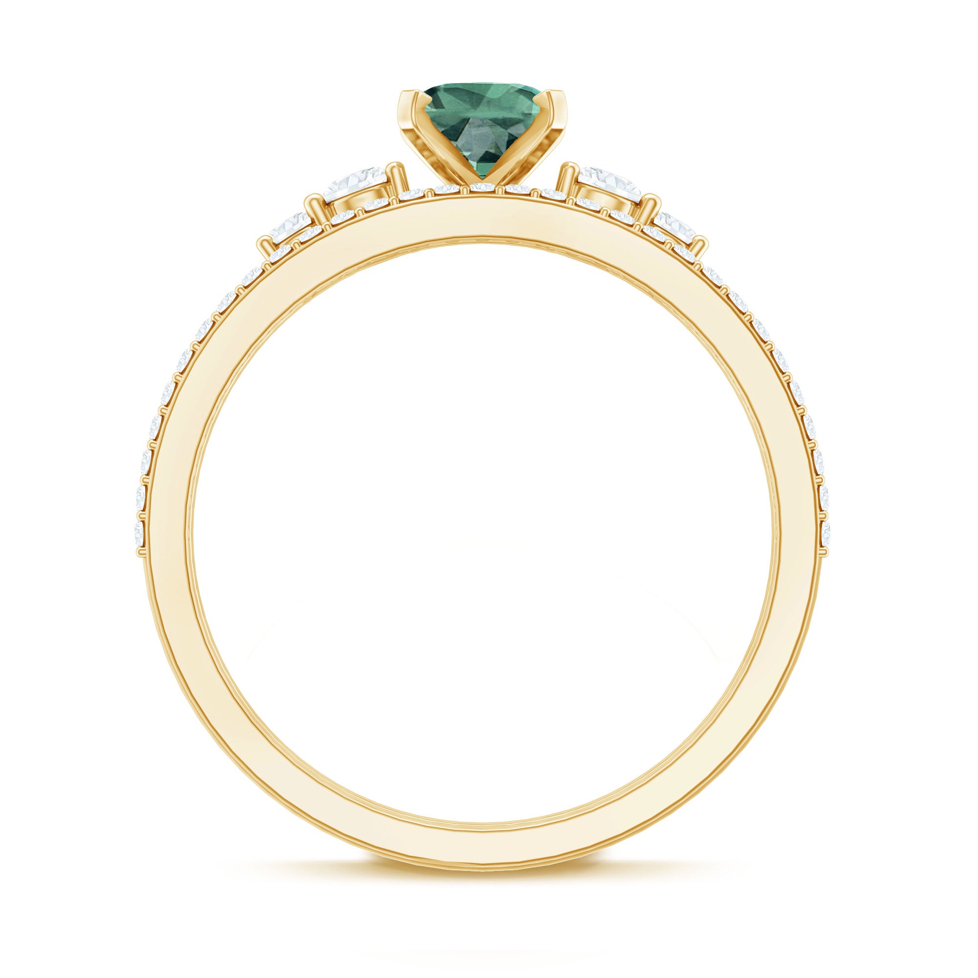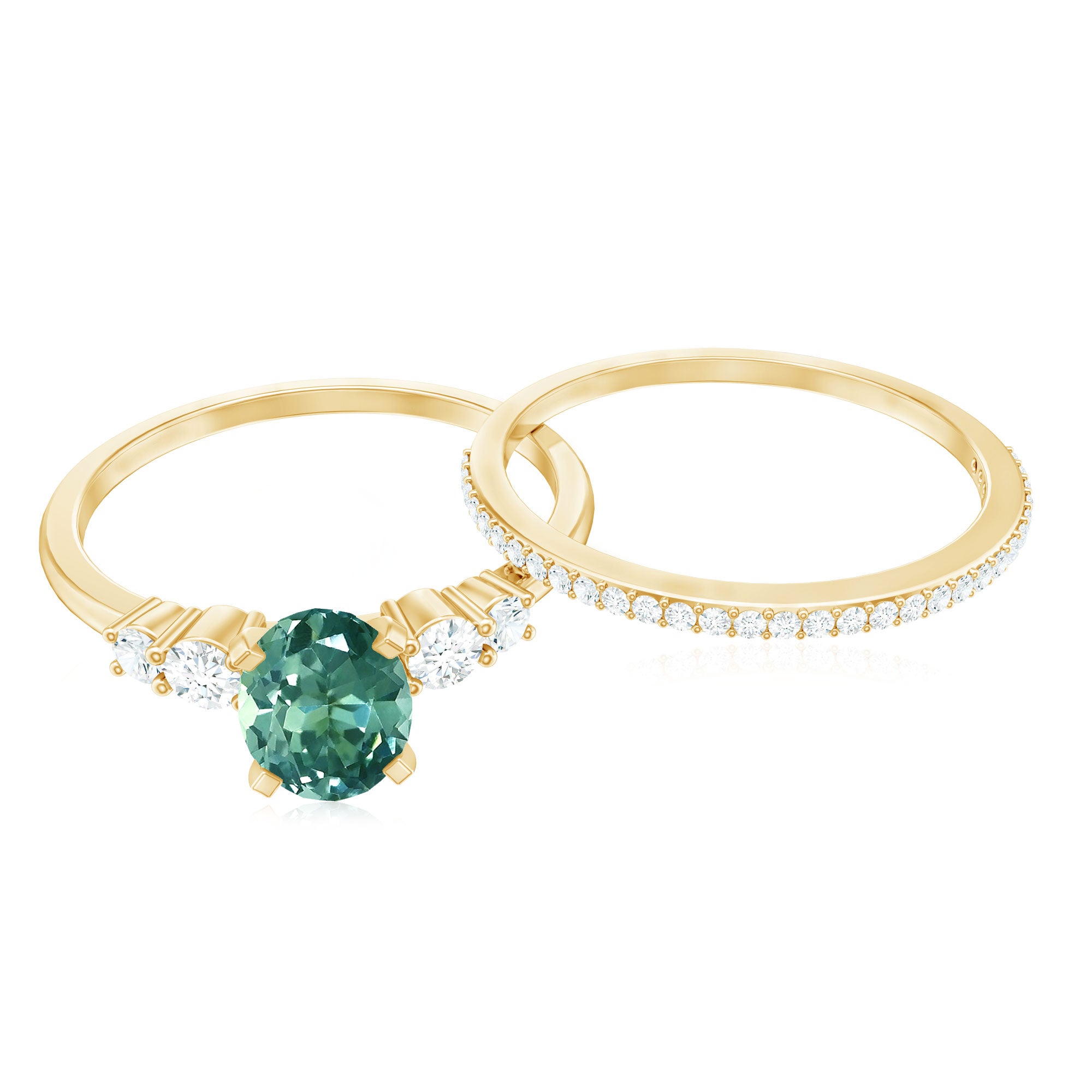 Designed to make your hands shine with grace, this Solitaire Wedding Ring Set is a beautiful blend of elegance and everyday charm. The main ring features a 5X7MM oval cut lab created green sapphire, placed in a peg head setting. Diamond side stones add extra sparkle, highlighting the center sapphire and giving the ring an eye-catching look. Paired with the solitaire is a matching diamond enhancer ring that wraps gently around the main ring. This Green Sapphire Wedding Ring Set offers versatility in styling. You can wear the solitaire ring and enhancer band together for a bold and complete look, or style them separately for a simpler feel. It also layers beautifully with other stackable rings, letting you create a look that feels personal and unique. Perfect for engagements, special milestones, or simply upgrading your jewelry collection, this Oval Bridal Ring Set brings color, sparkle, and modern style together.