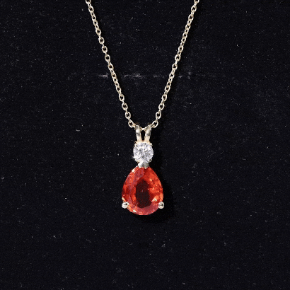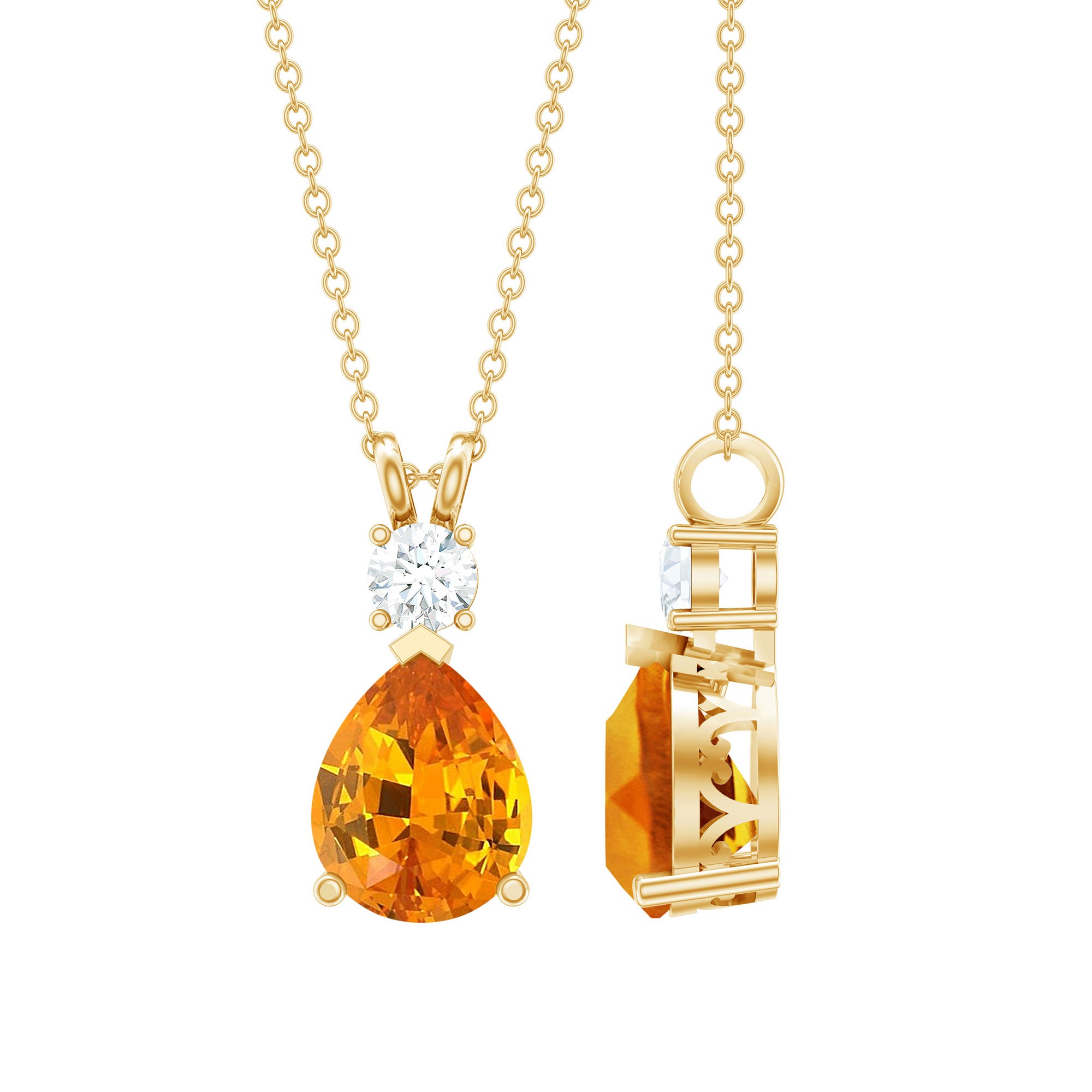 Radiating effortless elegance, this Lab Grown Orange Sapphire Cocktail Necklace effortlessly complements your special looks. This pendant features a Pear Shape Lab Created Orange Sapphire securely held in Prong Setting with a Round Shape Moissanite. This pendant exudes the classic shine of D-VS1 quality moissanite which makes it perfect to complete the entire look. This Teardrop Pendant Necklace captures the timeless allure and symbolizes everlasting love, making it a cherished token of affection. This pendant will be delivered to you in a classic jewelry box with the certificate of gemstone authentication.