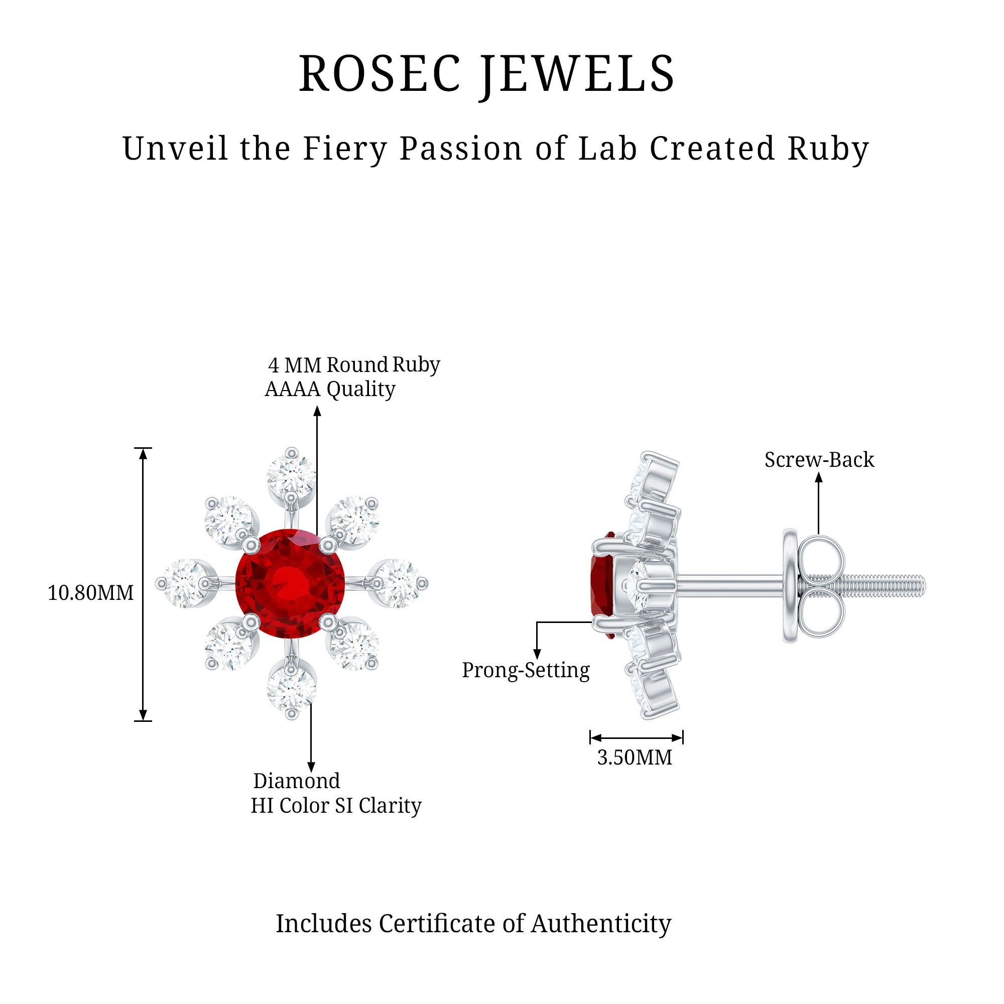 Inspired by the beauty of a blooming flower, these Lab Created Ruby Earrings capture the essence of nature in a radiant design. Each earring features a 4 MM round cut lab created ruby set securely in prong setting at the center. Surrounding the center stone are bright white diamonds arranged in a delicate floral pattern, creating sparkling petals that bring the design to life. The contrast between the vivid AAAA quality ruby and the shimmering HI-SI quality diamonds gives these Flower Stud Earrings a balanced and elegant look, bold yet graceful. Crafted with precision and care from high-quality materials, these Ruby and Diamond Earrings are designed to maintain their brilliance and beauty for years to come. The secure screw back closures ensure a comfortable and snug fit, allowing you to wear them confidently from morning to night. These Ruby Flower Earrings come in a beautifully crafted jewelry box, ready for gifting on birthdays, anniversaries, or simply as a heartfelt surprise.