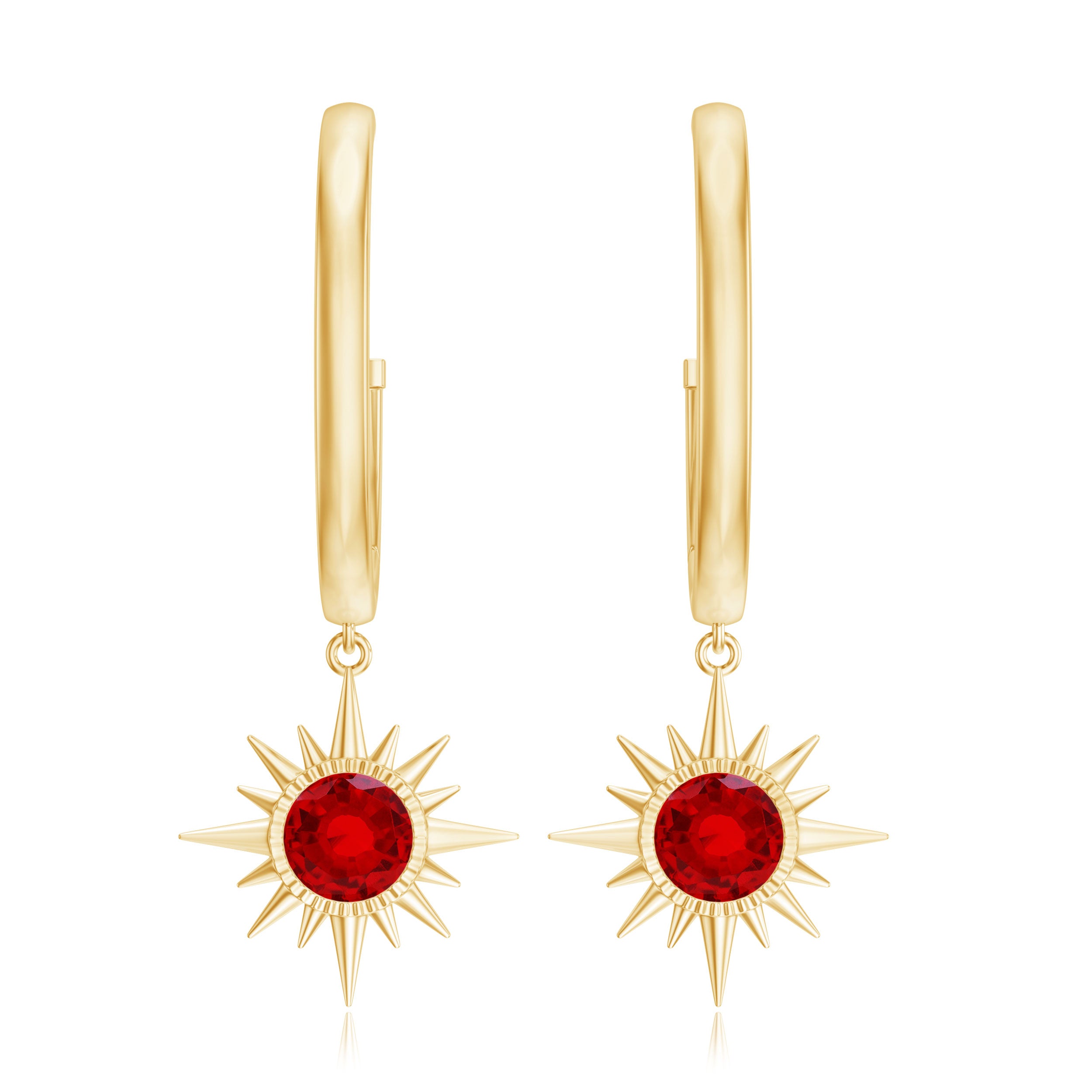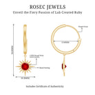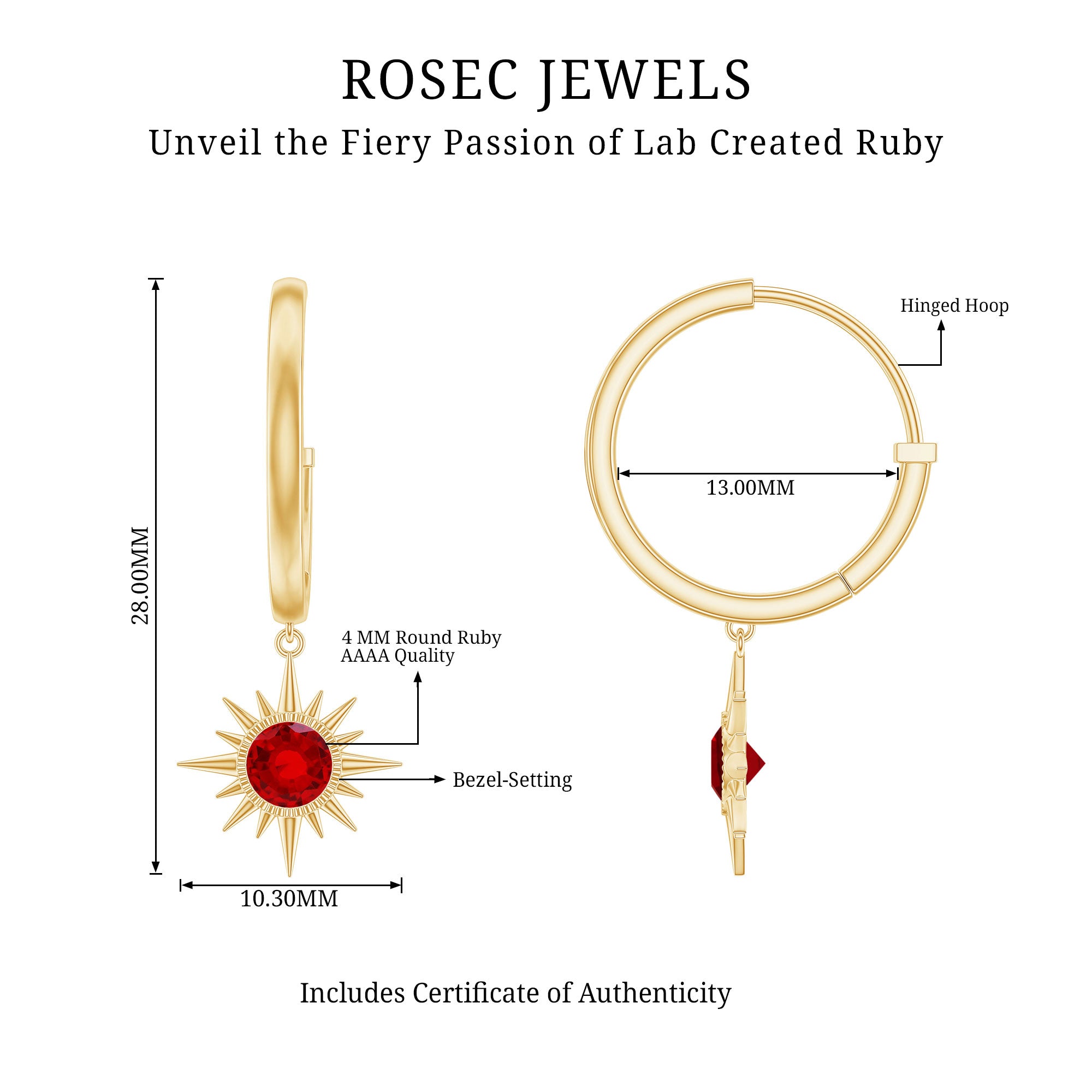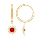 Inspired by the warmth of morning sunlight, these Ruby Drop Earrings bring a radiant glow that feels both natural and timeless. The Hinged Hoop Earrings are embellished with a 4 MM round shaped Lab Created Ruby of AAAA quality, held securely in bezel setting. The rich red gemstone is surrounded by a delicate sunburst pattern, creating a soft play of light that highlights its brilliance and charm. Hanging gently from a hinged hoop, these Huggie Earrings move gracefully with every step, catching just the right amount of sparkle. Every detail has been thoughtfully crafted to capture the beauty of nature in a modern and wearable form. Perfect for both special occasions and everyday wear, these Ruby Hoop Earrings bring a touch of sophistication to any look. Their smooth finish and lightweight design ensure comfort throughout the day, while the hinged closure keeps them securely in place. These Sunburst Earrings blend artistic design with natural beauty, offering a perfect balance between simplicity and style.