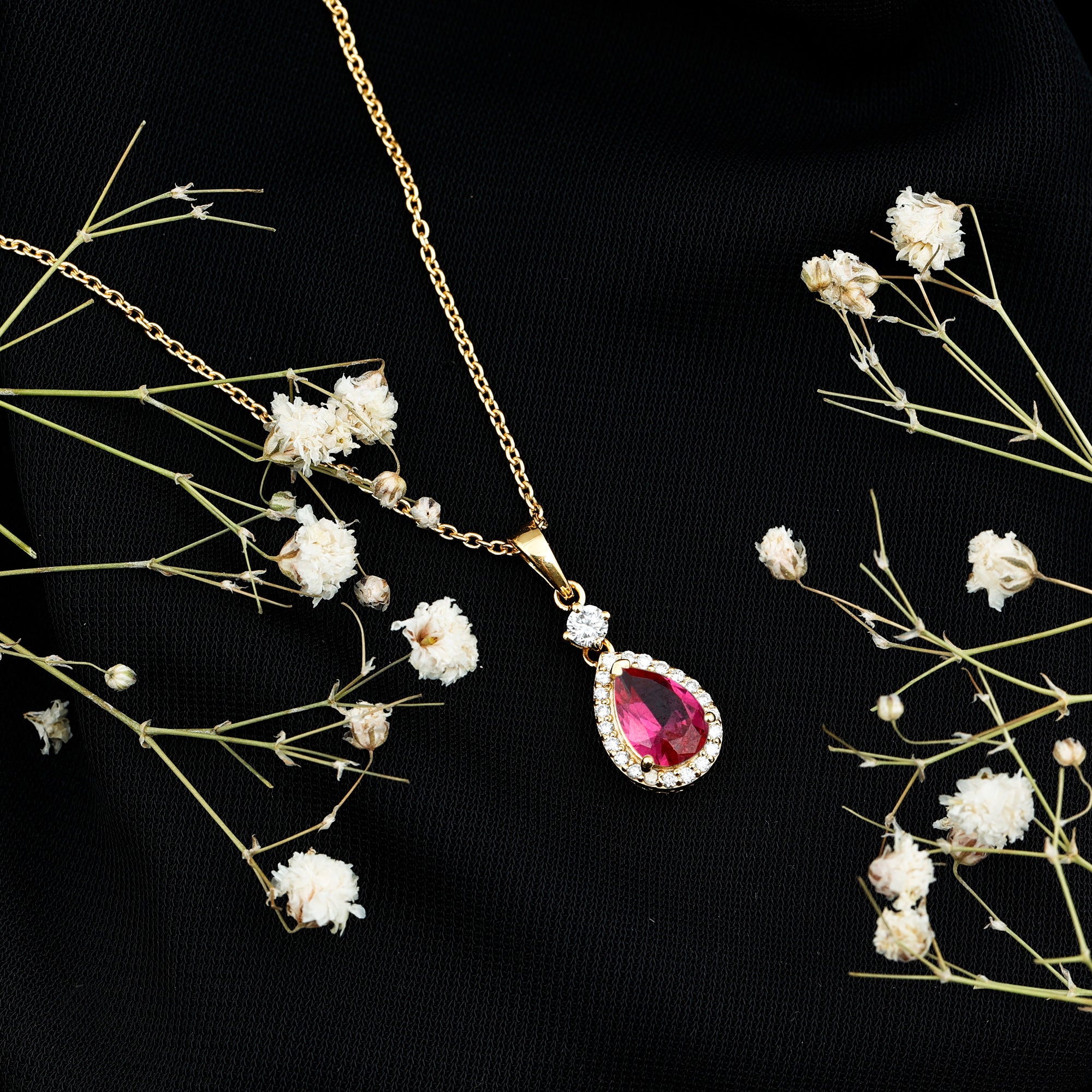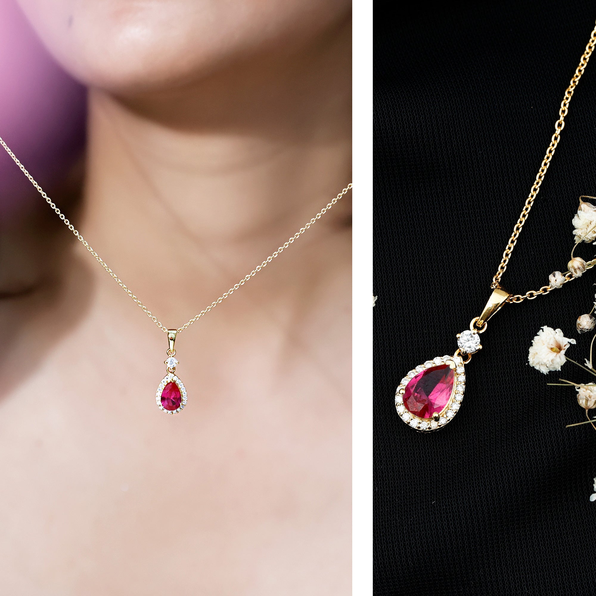 Made to bring charm and elegance into your everyday style, this Pear Shaped Ruby Necklace blends classic design with a modern feel. Set in 14K yellow gold plated silver, the Teardrop Necklace features a 6X8 MM pear cut lab created ruby held securely in prong setting. Adding to the beauty of the pendant is a halo of round cut moissanite stones. Just above the main teardrop, a single round moissanite adds a simple, finishing detail that ties the whole piece together. The Ruby Pendant Necklace hangs from a cable chain that rests comfortably and securely around your neck. It is a necklace that does not try too hard yet makes an impression every time. Whether worn alone or layered with other pieces, this Ruby Red Necklace fits in effortlessly with any style. Perfect as a gift for someone you love, or just to treat yourself, this Pear Drop Necklace is a piece that holds both meaning and beauty. It arrives in a secure jewelry box, ready for gifting or keeping close.