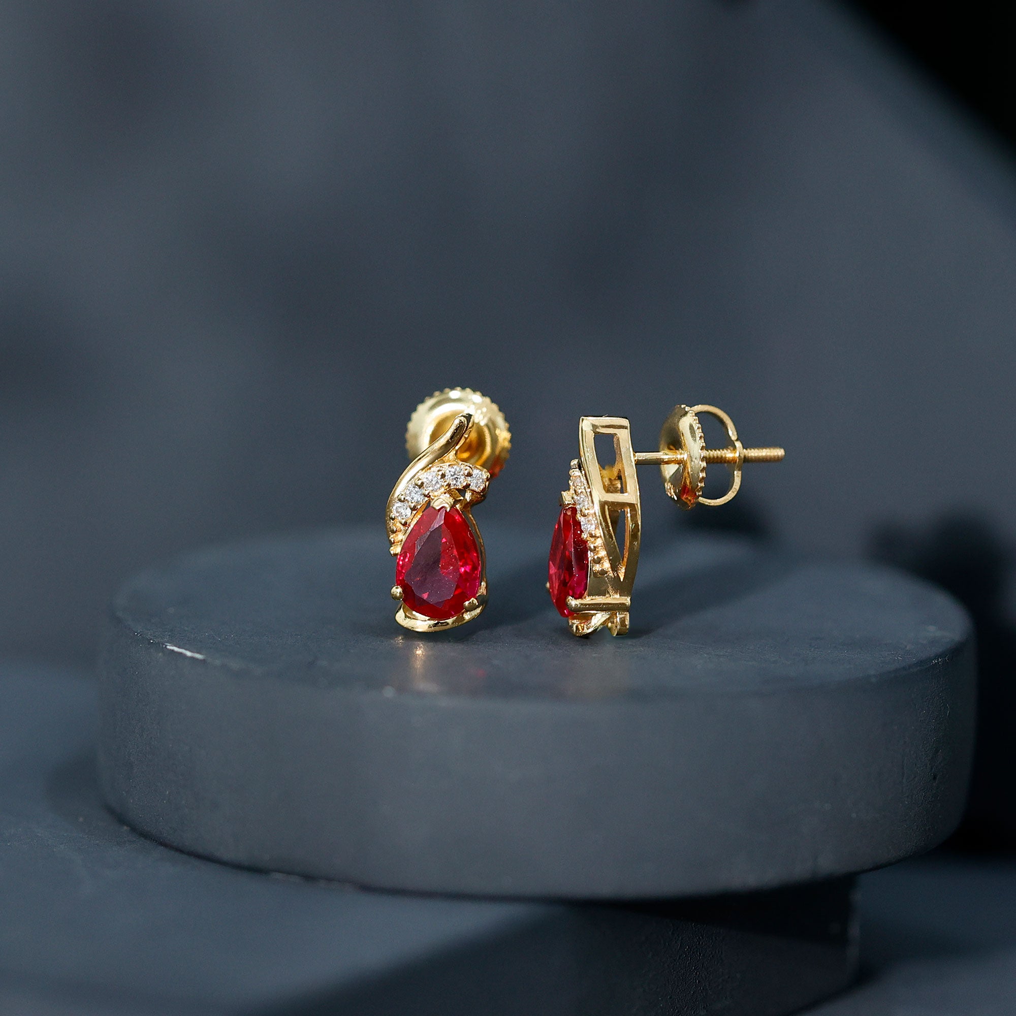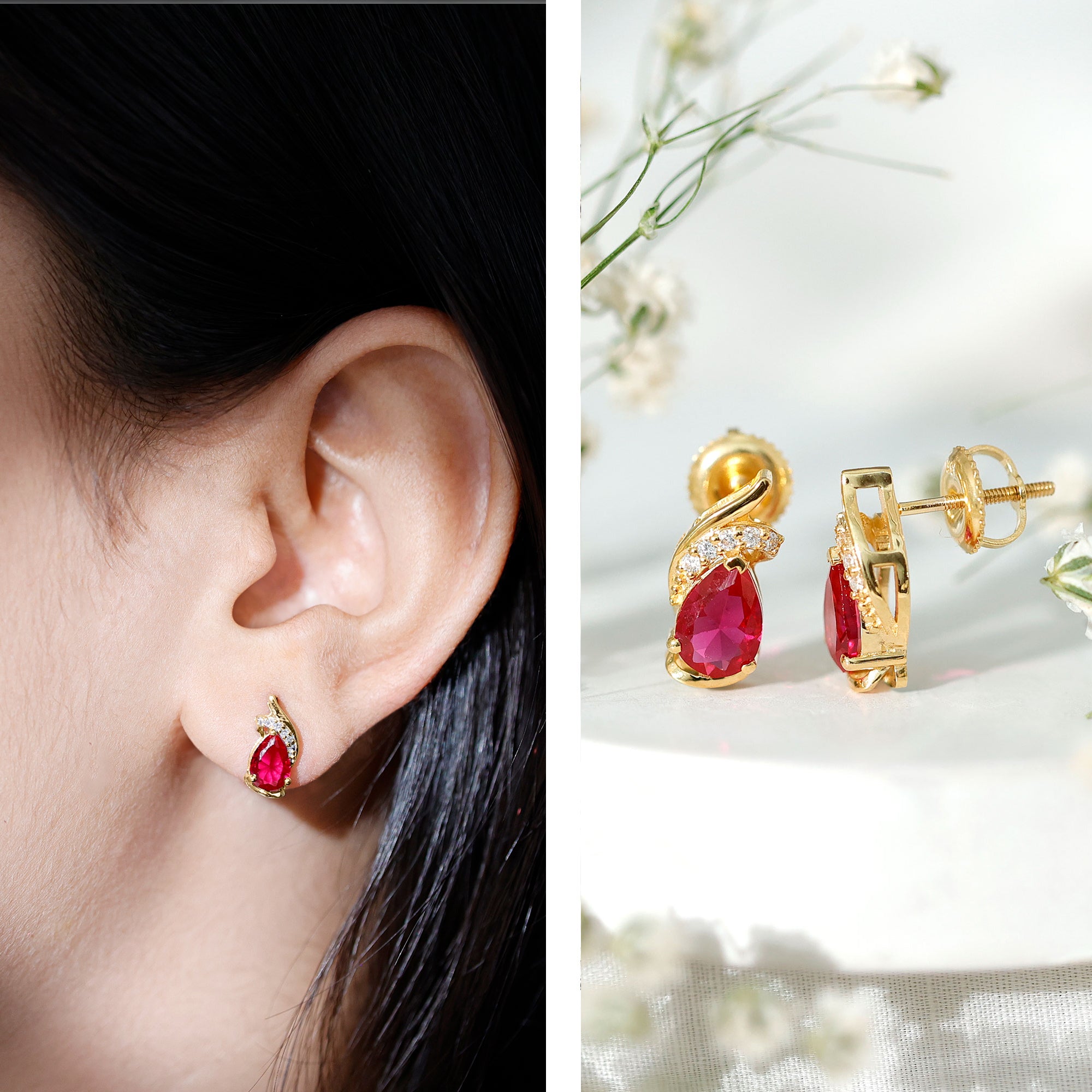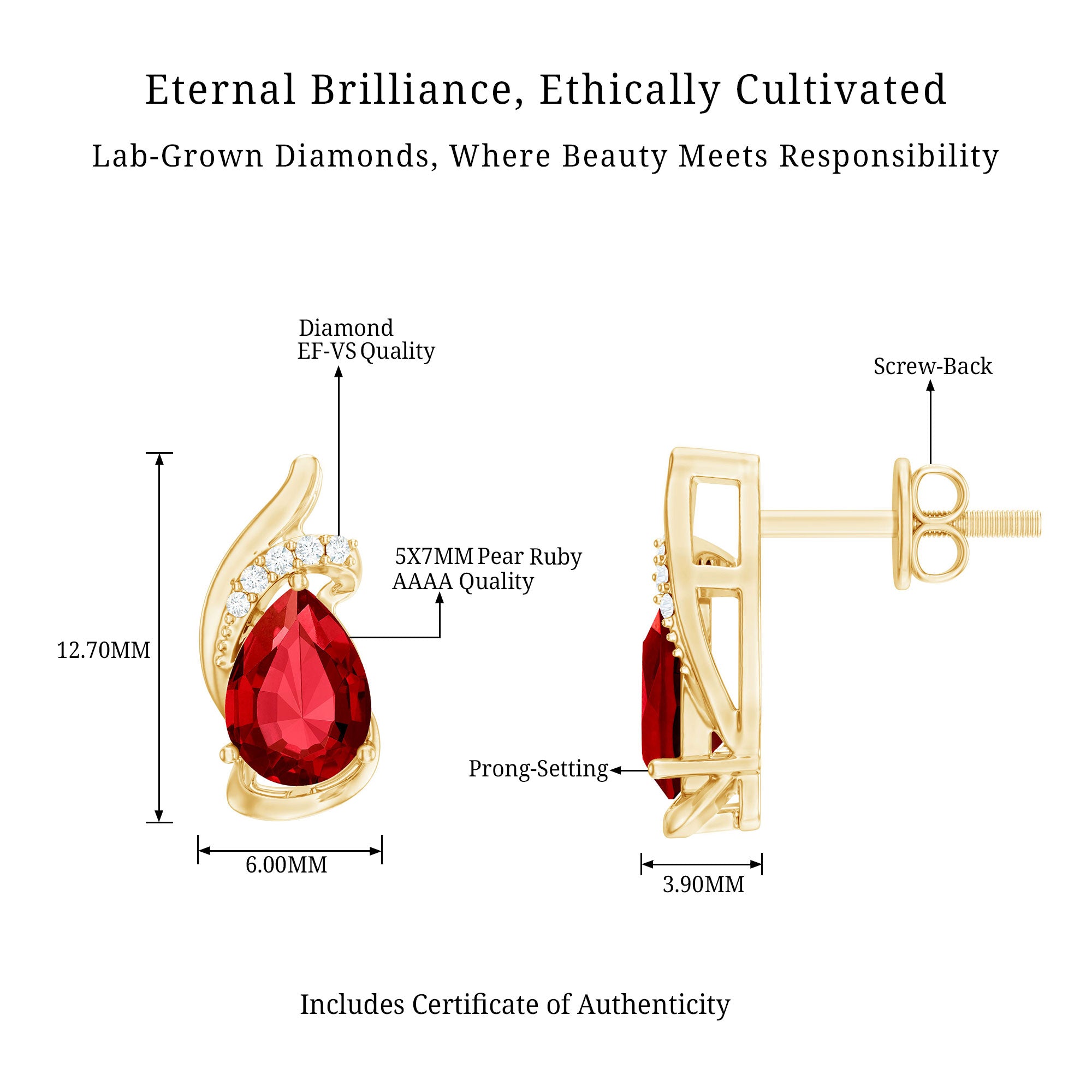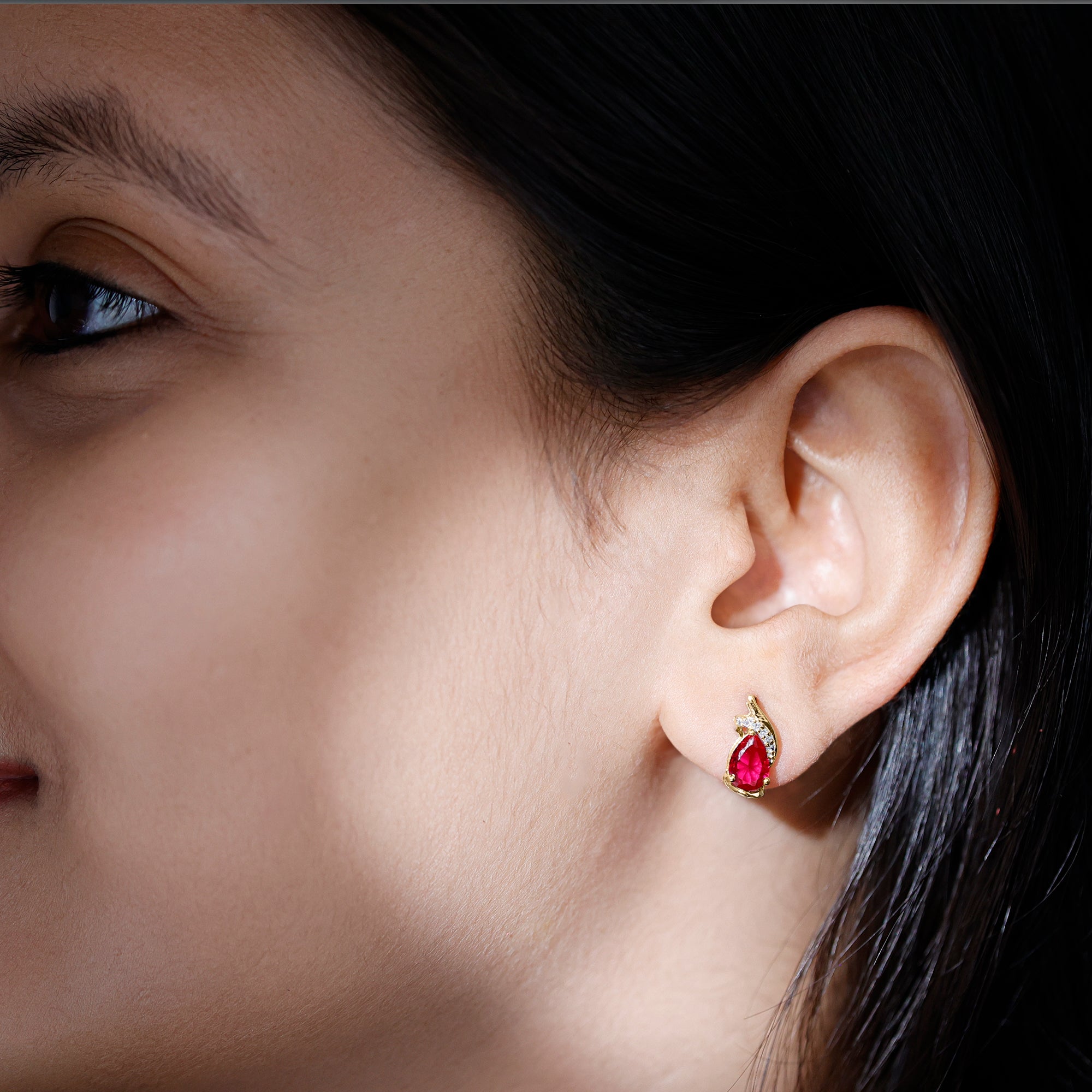 Step into a world of enchantment with our Lab Created Ruby Stud Earrings where passion takes shape in Rubies, embraced by a dance of Lab Grown Diamonds. Make a statement with 5x7mm Pear Shaped Ruby and Round Shaped Lab Grown Diamonds that echoes through the crowd, indulging in the magical synergy of ruby and diamond, a glamorous partnership promising luck, love, and luminosity. These Ruby Diamond Earrings arent just jewelry piece; theyre an invitation to radiate elegance and charm with the Aaaa Quality Ruby and Ef-Vs quality Diamonds. Perfect for birthdays or anniversaries, surprise your beloved with the gift of everlasting brilliance of Ruby Diamond Studs as some moments deserve to dazzle.