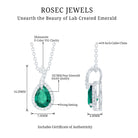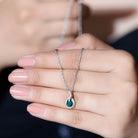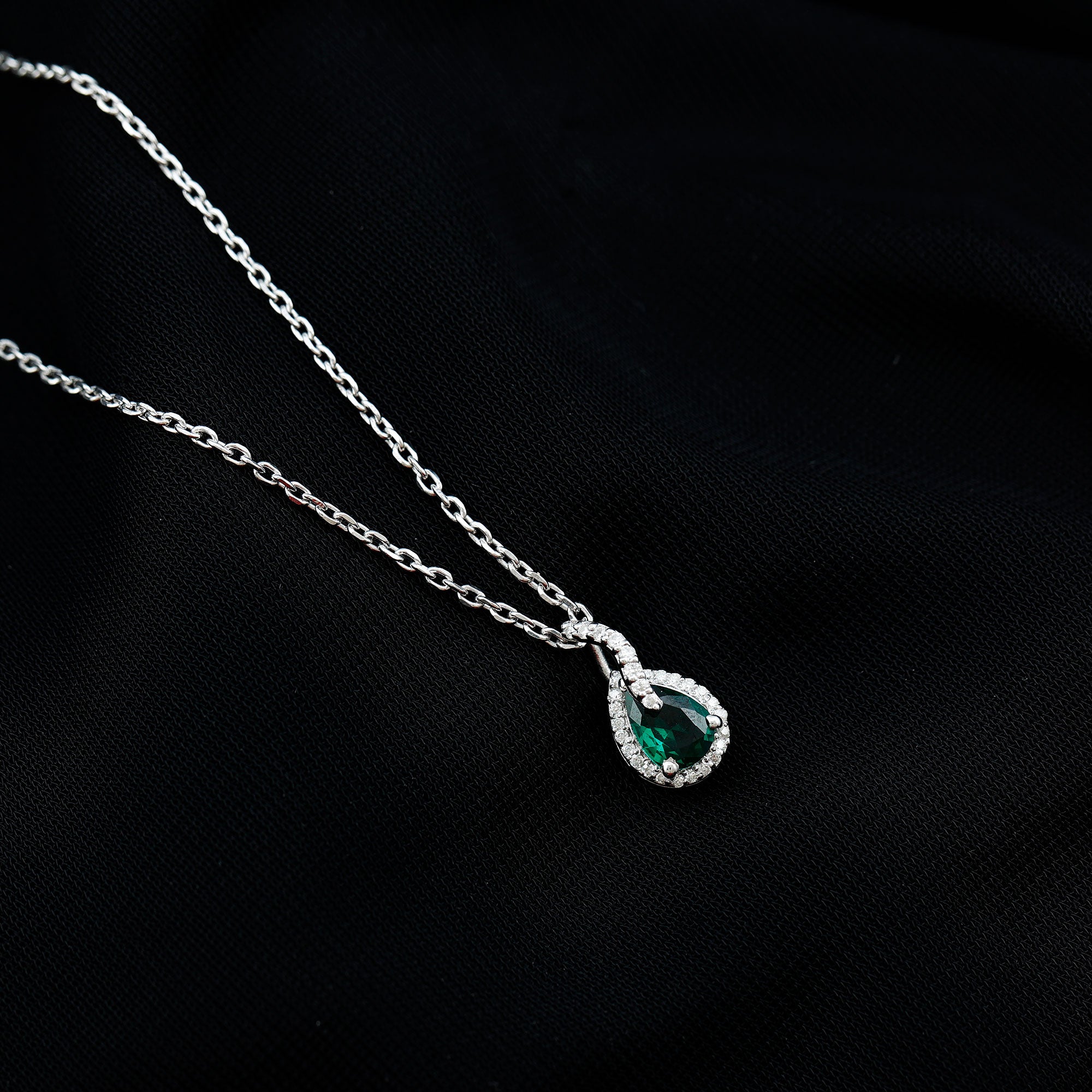Honor your beloved with this Lab Created Emerald Pendant Necklace, crafted specifically for your neckline. This Teardrop Pendant features a 5X7 MM Pear Shape Cultured Emerald of AAAA quality securely placed in Prong Setting encircled with smaller Moissanite Stones of D-VS1 Quality. This Drop Pendant Necklace is an epitome of loyalty and new beginnings. This Halo Pendant can be a perfect gift option for your better half while celebrating anniversary. This Pear Shaped Necklace dangles with a silver cable chain, which makes it beautifully sit on the neckline. The 925 pendant will be delivered to you in a signature velvet pouch with the certificate of authenticity.