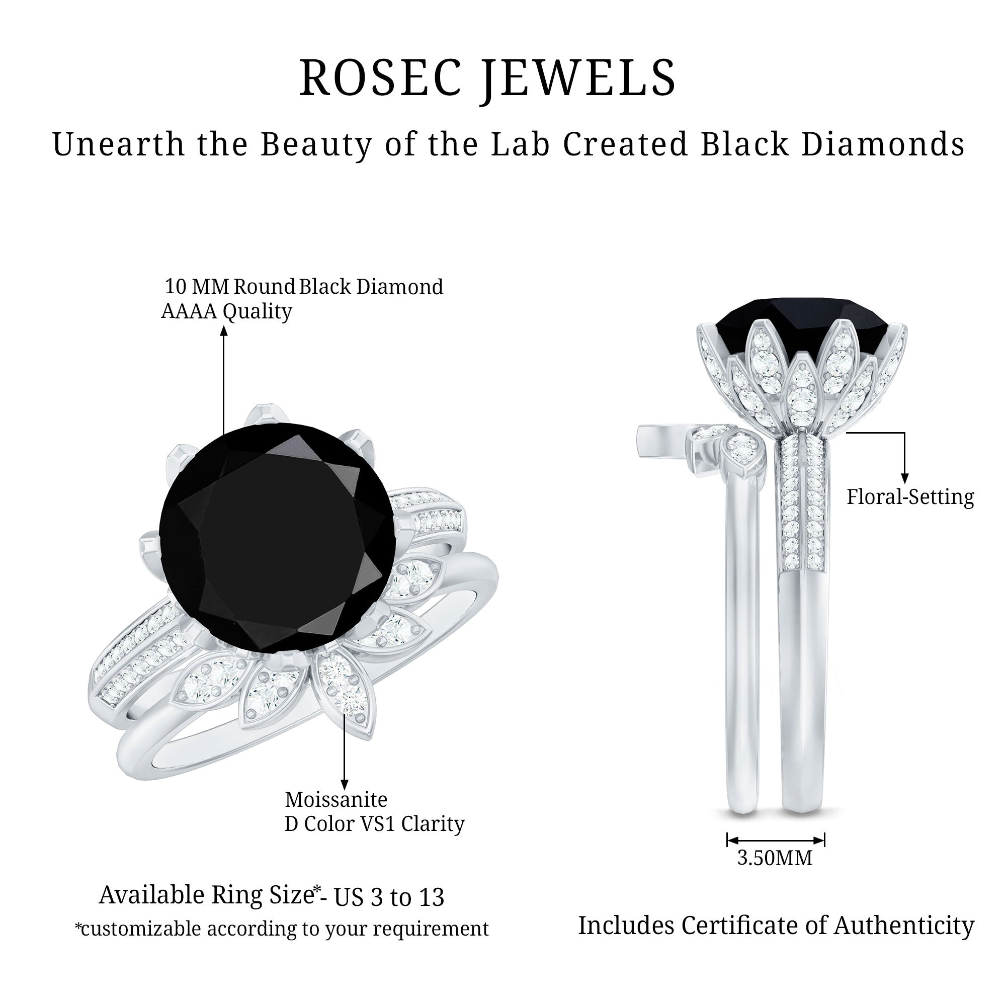 Be captivated by the allure of this exquisite Lab Created Black Diamond Wedding Ring Set, designed to leave her spellbound. The striking black stone is a truly magnificent choice to commemorate your special day, just like the enchanting Flower Wedding Ring Set. This delightful Stacking Floral Bridal Ring Set features 10mm Round Shape Lab Black Diamond nestled within a floral design, complete with intricate petal details adorned with Moissanite. The shank of the ring is embellished with Round brilliant cut Moissanite, accompanied by a matching chevron leaf-shaped band also adorned with Moissanite.