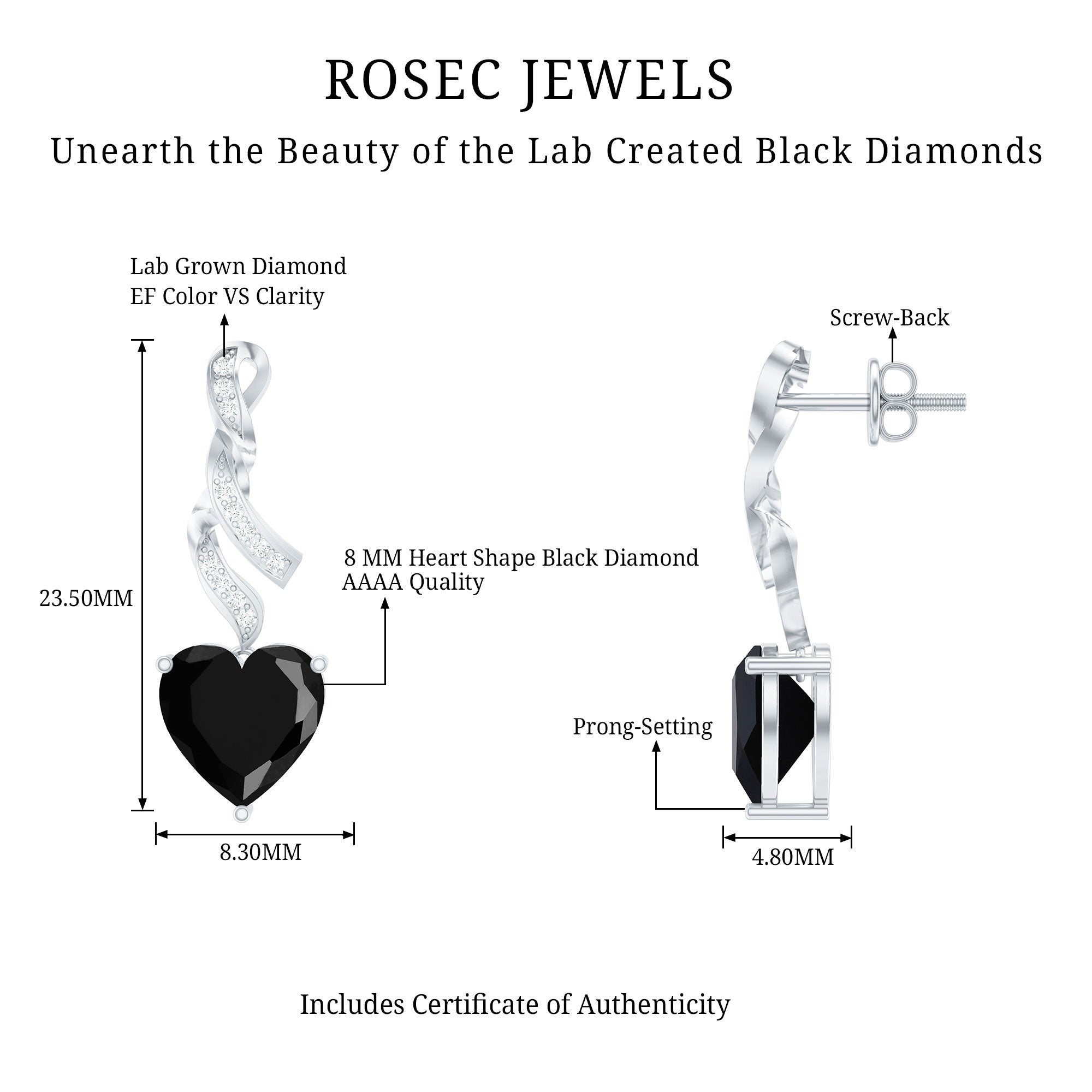 Discover Enchanting Magic with Our Black Heart Earrings! Our Lab Grown Black Diamond Earrings are designed to captivate, featuring a twisted Lab Grown Diamond studded metal frame at the top and a suspended 8x8 mm Heart Shaped Black Diamond (Lab Grown) at the bottom. This monochrome masterpiece features Aaaa Quality Black Diamond and Ef-Vs Quality White Diamond. This unique earrings are versatile enough for everyday wear and special occasions alike. Elevate your style with this Diamond Drop Earrings, available from Rosec Jewels experts in crafting stunning jewelry using Certified Lab Cultured Gemstones. Place your order for a touch of timeless elegance!