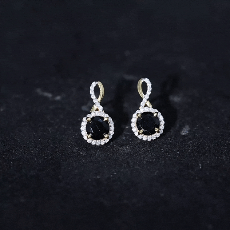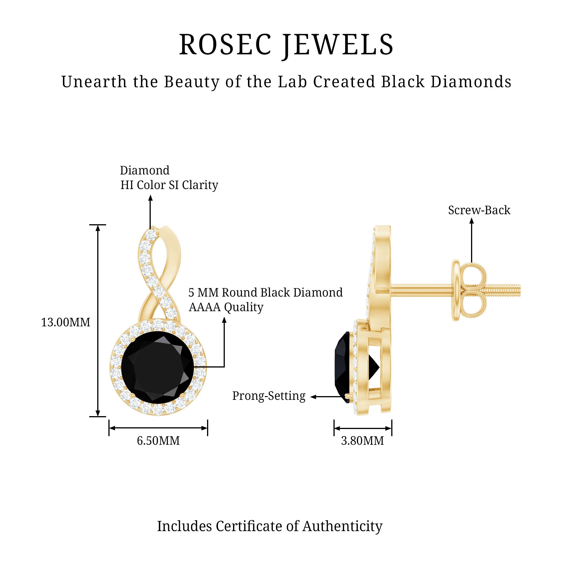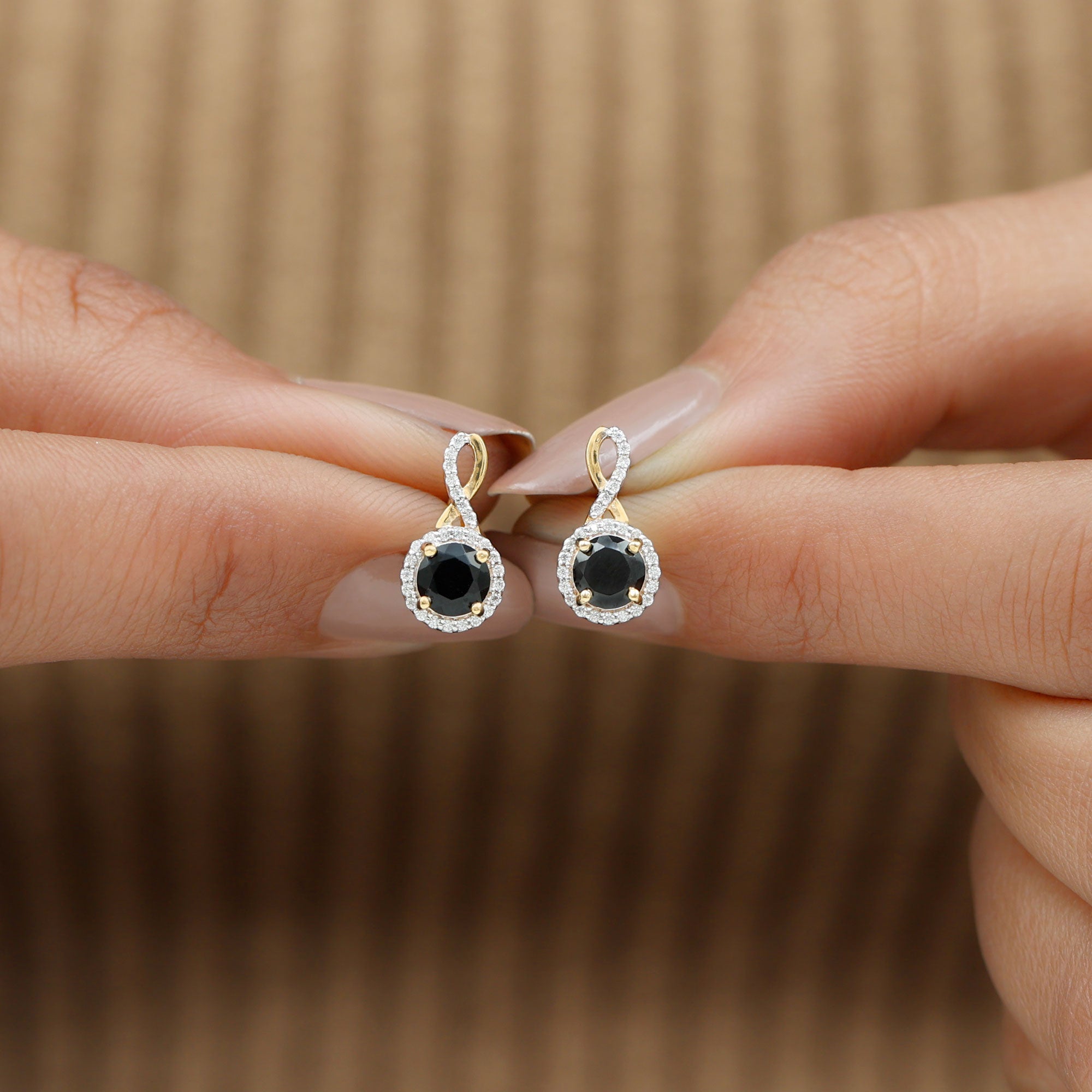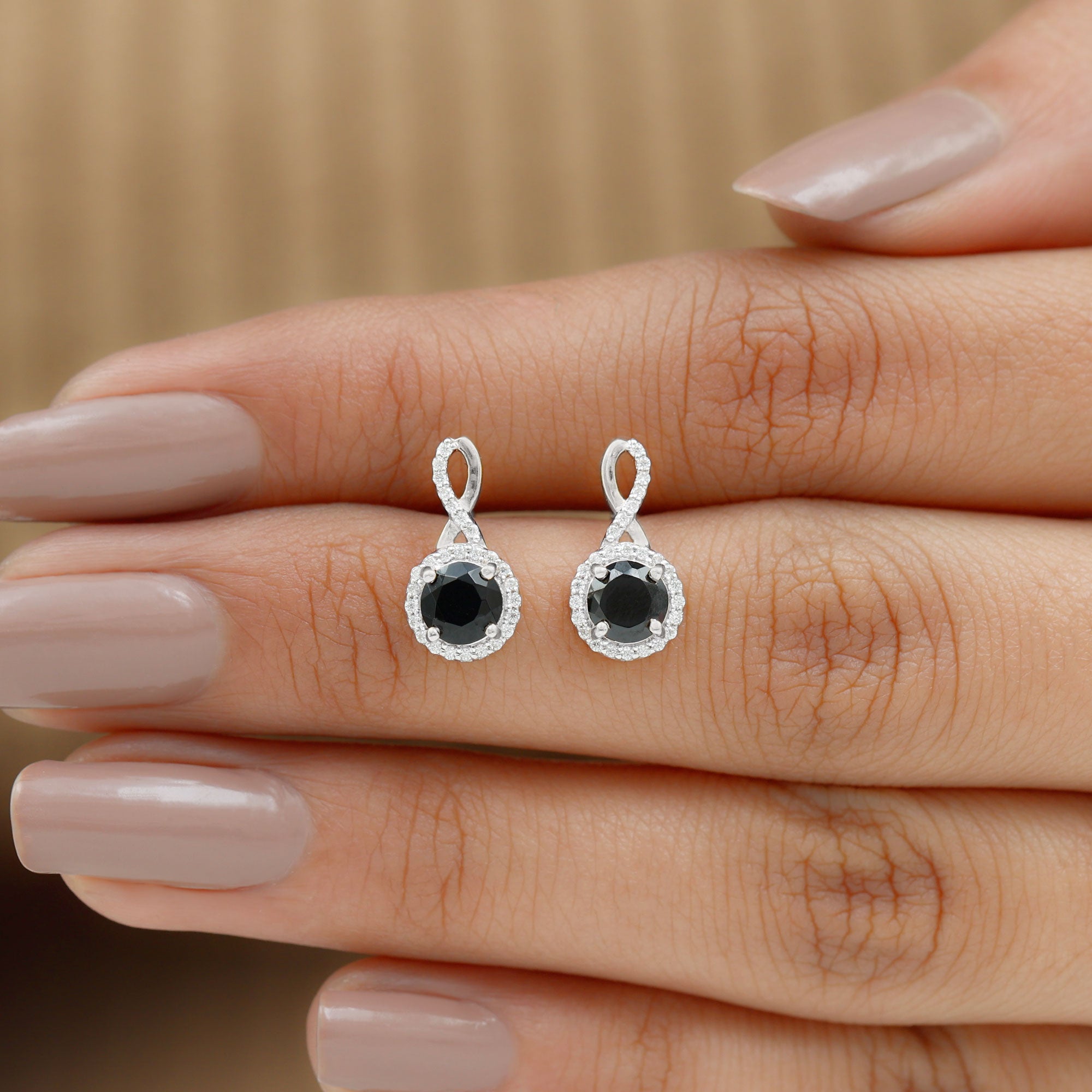 These Infinity Stud Earrings embellished with Round Shape Created Black Diamond is set at the center and encircled with Round Shape Diamond Halo and more Diamond gemstones are set on the infinity design, to make them look more luxurious.