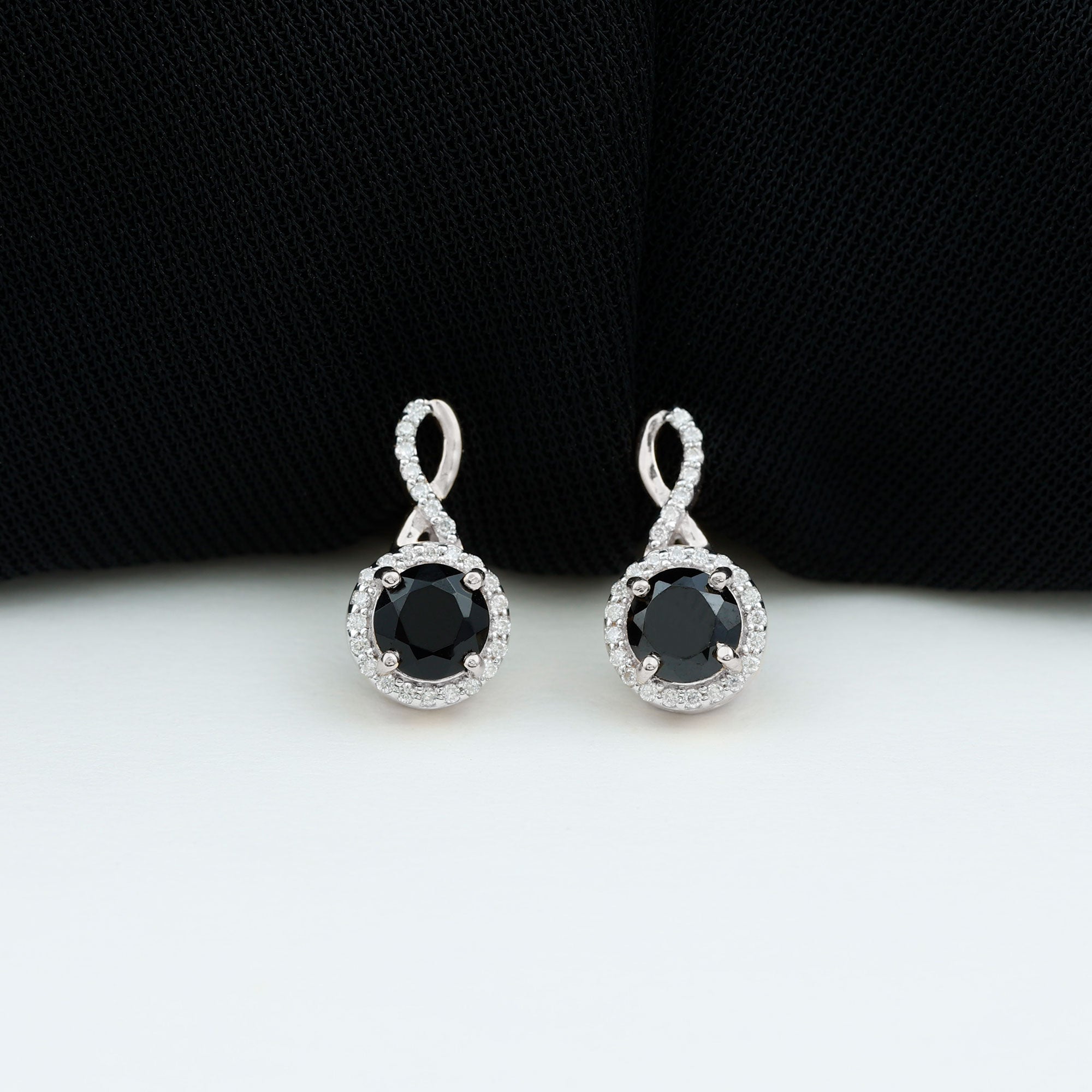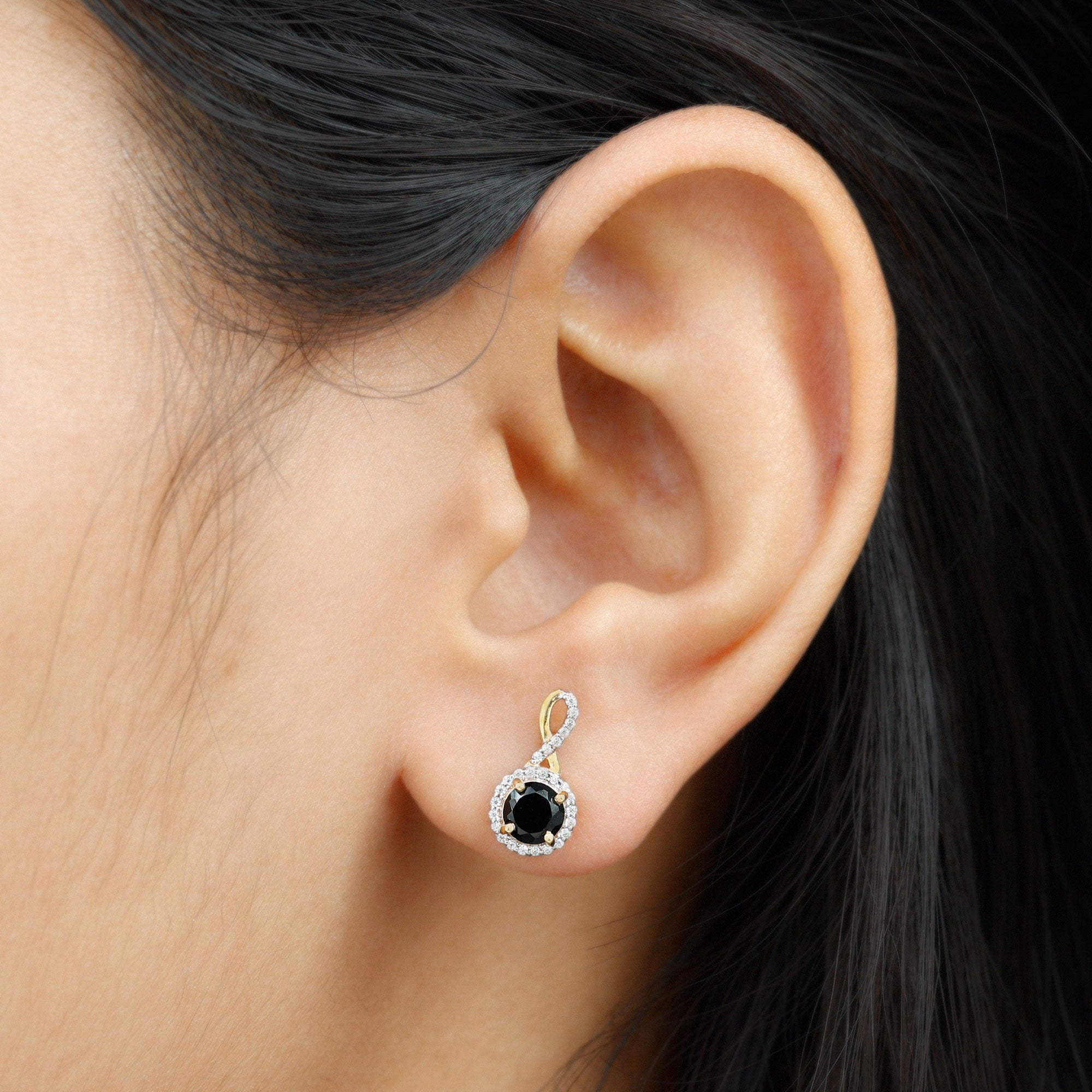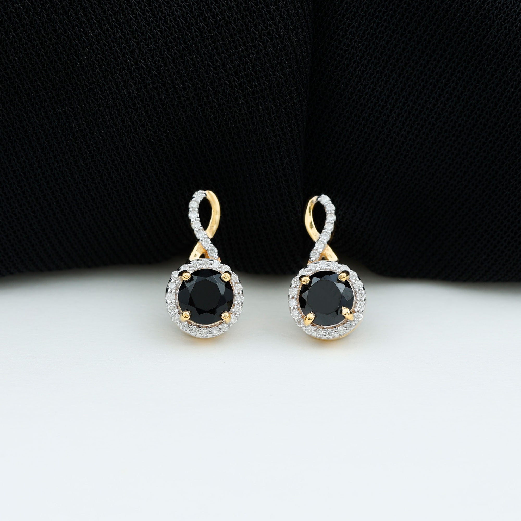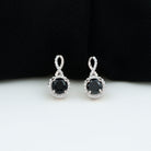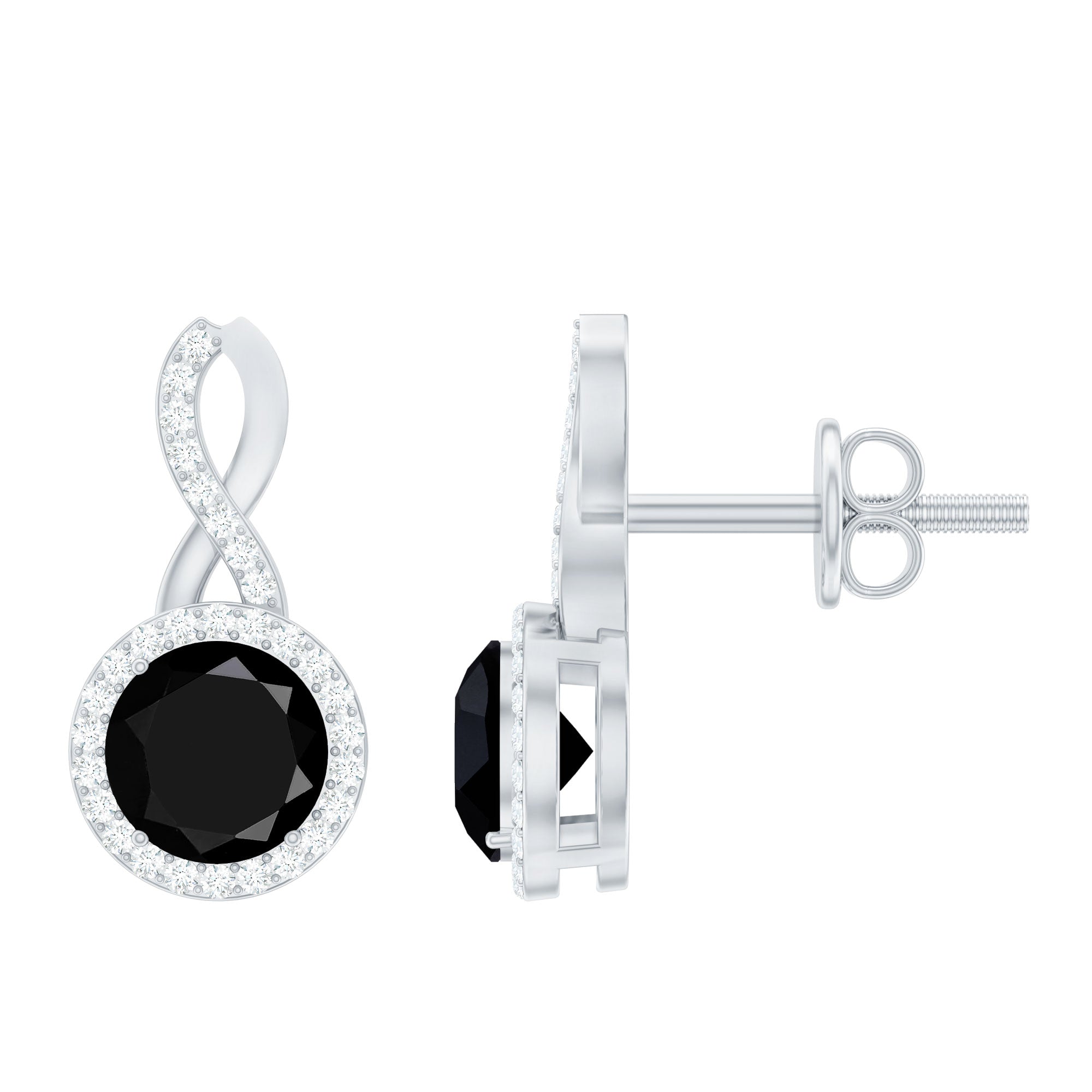 These Infinity Stud Earrings embellished with Round Shape Created Black Diamond is set at the center and encircled with Round Shape Diamond Halo and more Diamond gemstones are set on the infinity design, to make them look more luxurious.