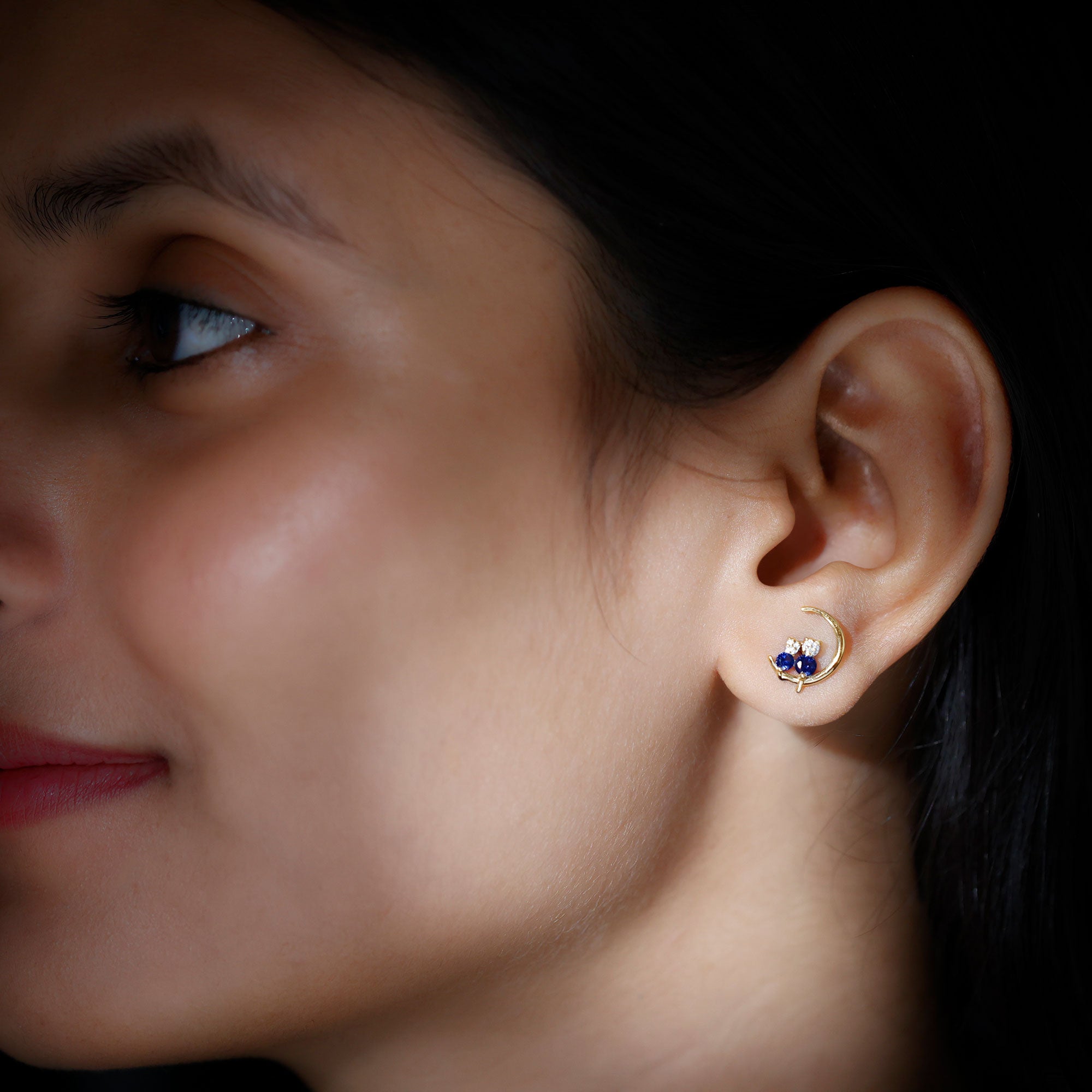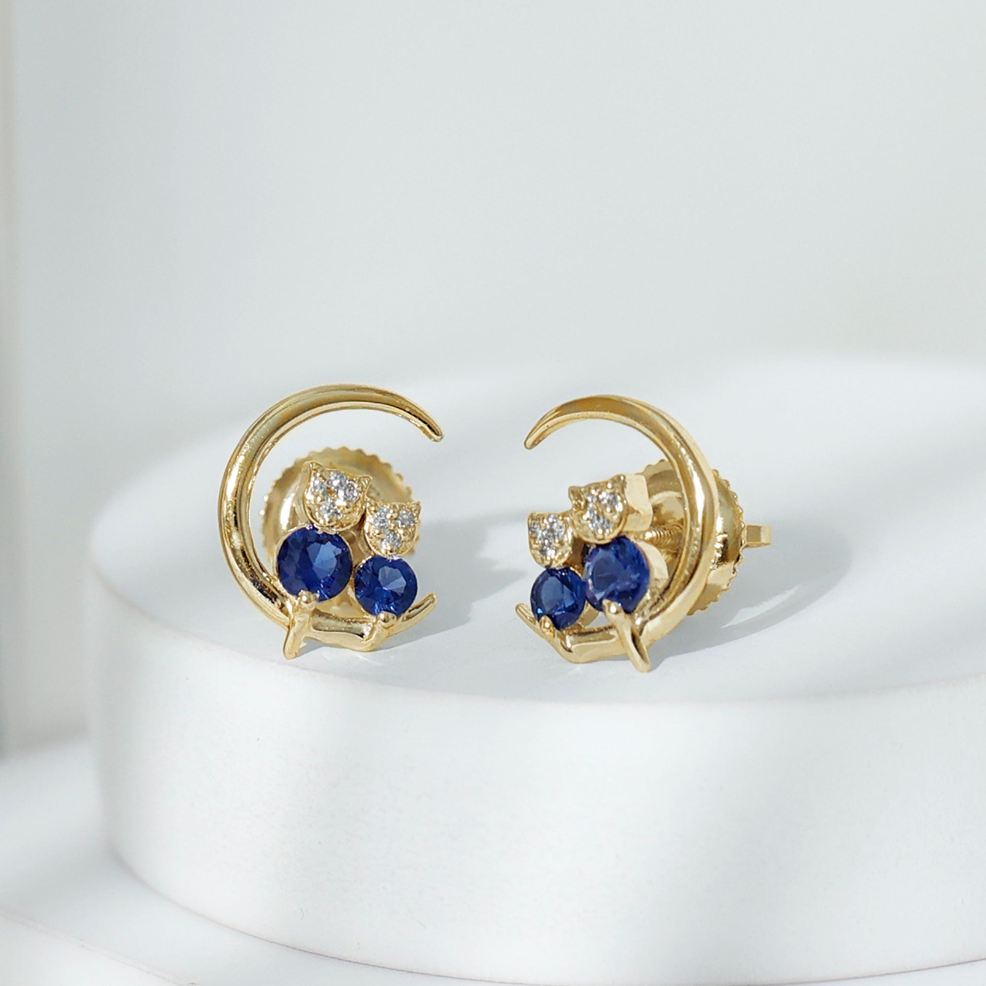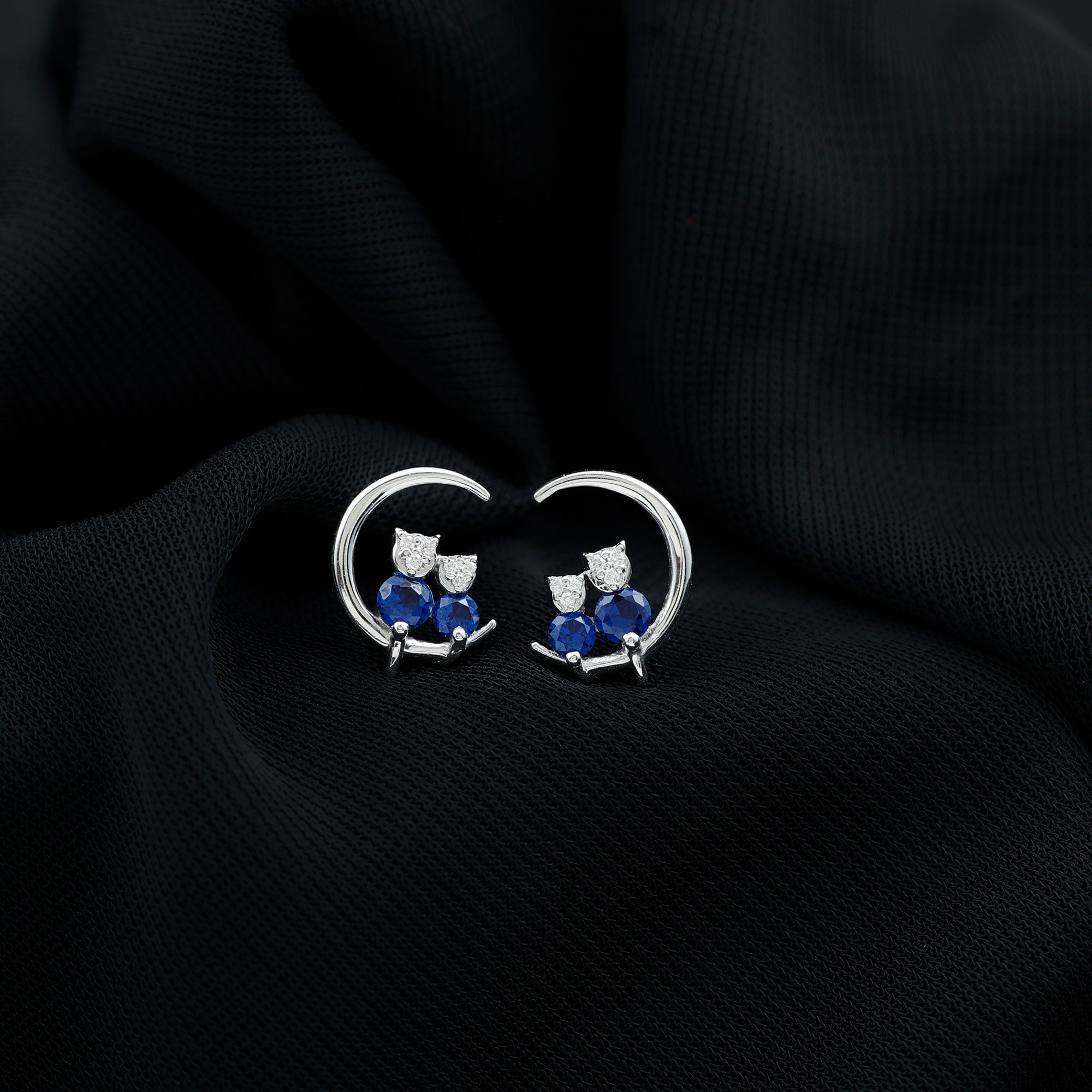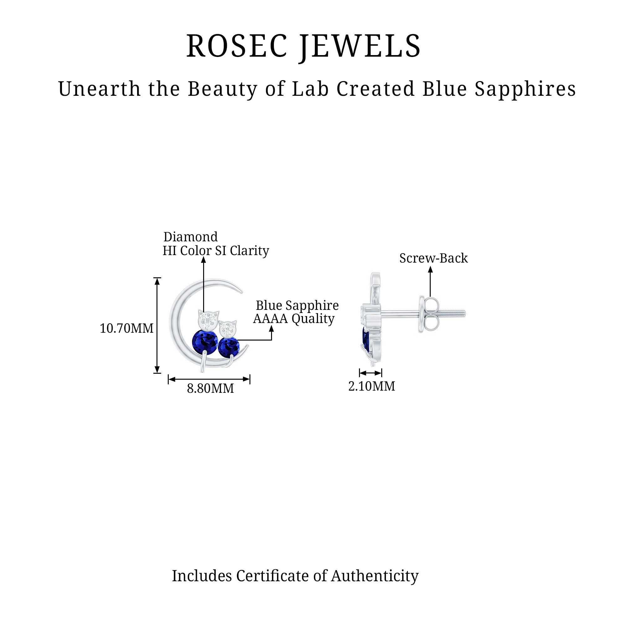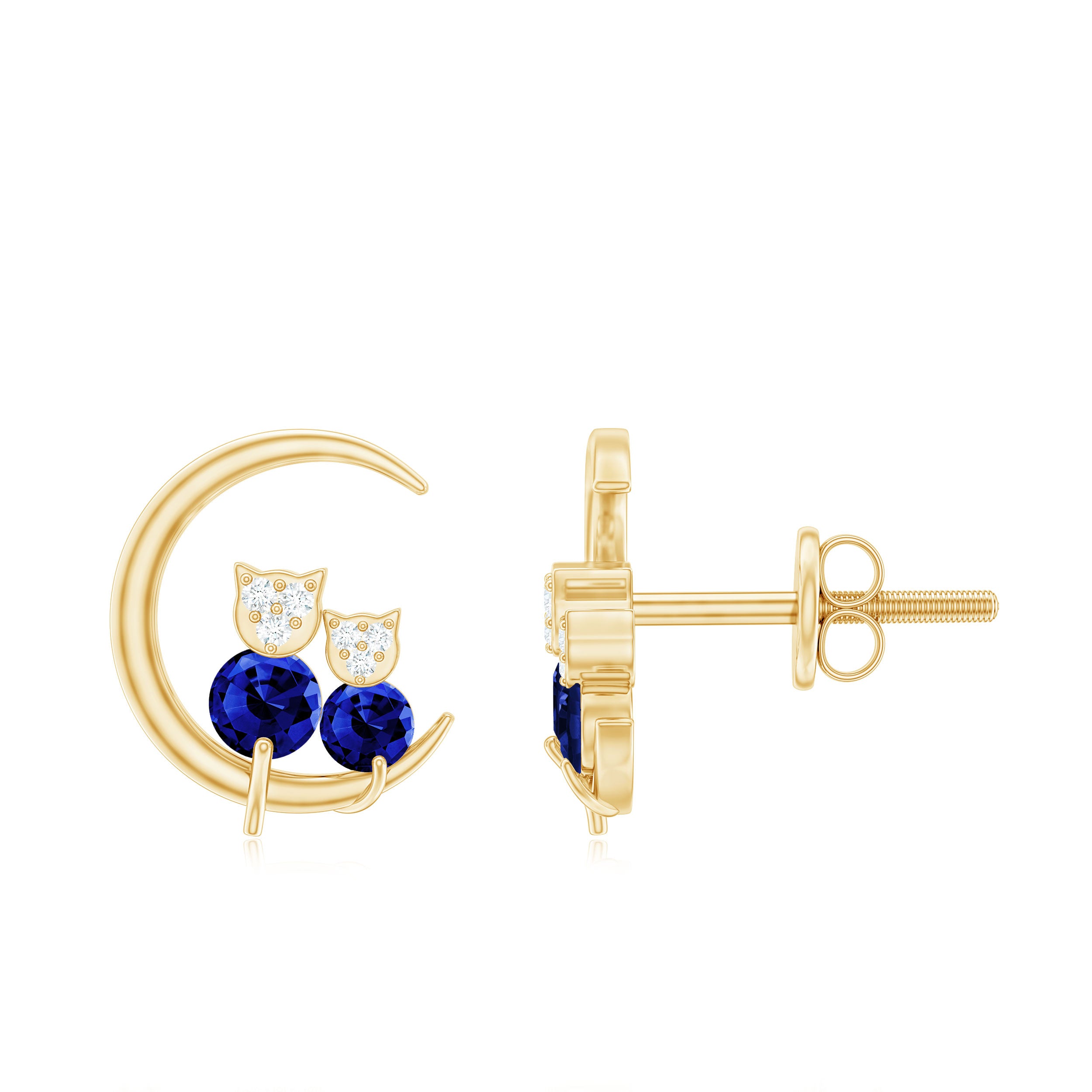 Lab Grown Blue Sapphire and Diamond Cat and Moon Stud Earrings