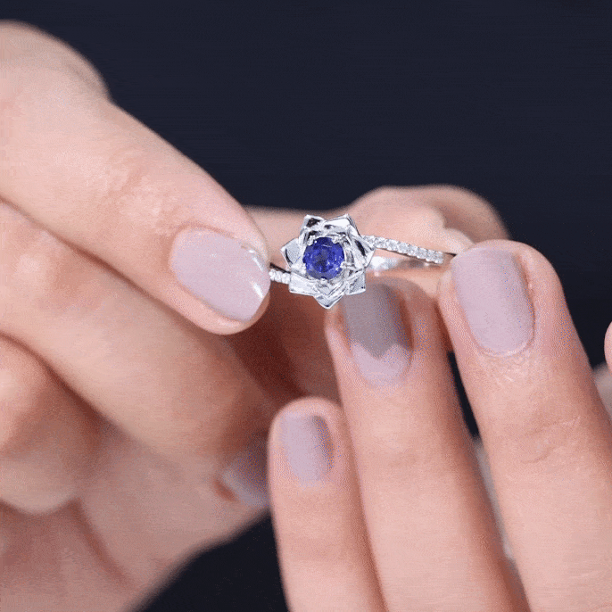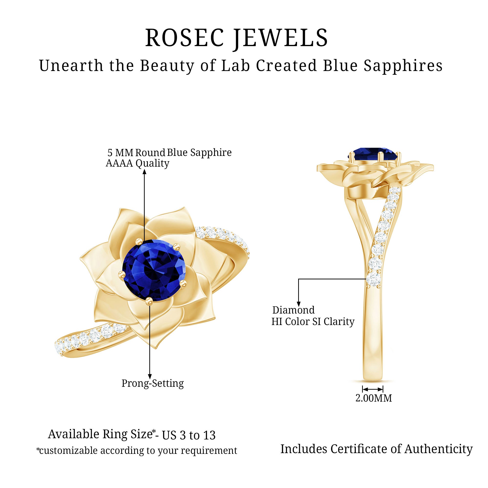 Illuminate your special day with the brilliance of this Flower Engagement Ring. A Round Shape Lab Created Blue Sapphire takes center stage, surrounded by dazzling Diamond gemstones. The ring features a graceful Bypass Shank design, adding a unique and enchanting touch. Let this Created Blue Sapphire Ring be a symbol of your everlasting love and a beautiful reminder of your cherished moments together.